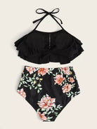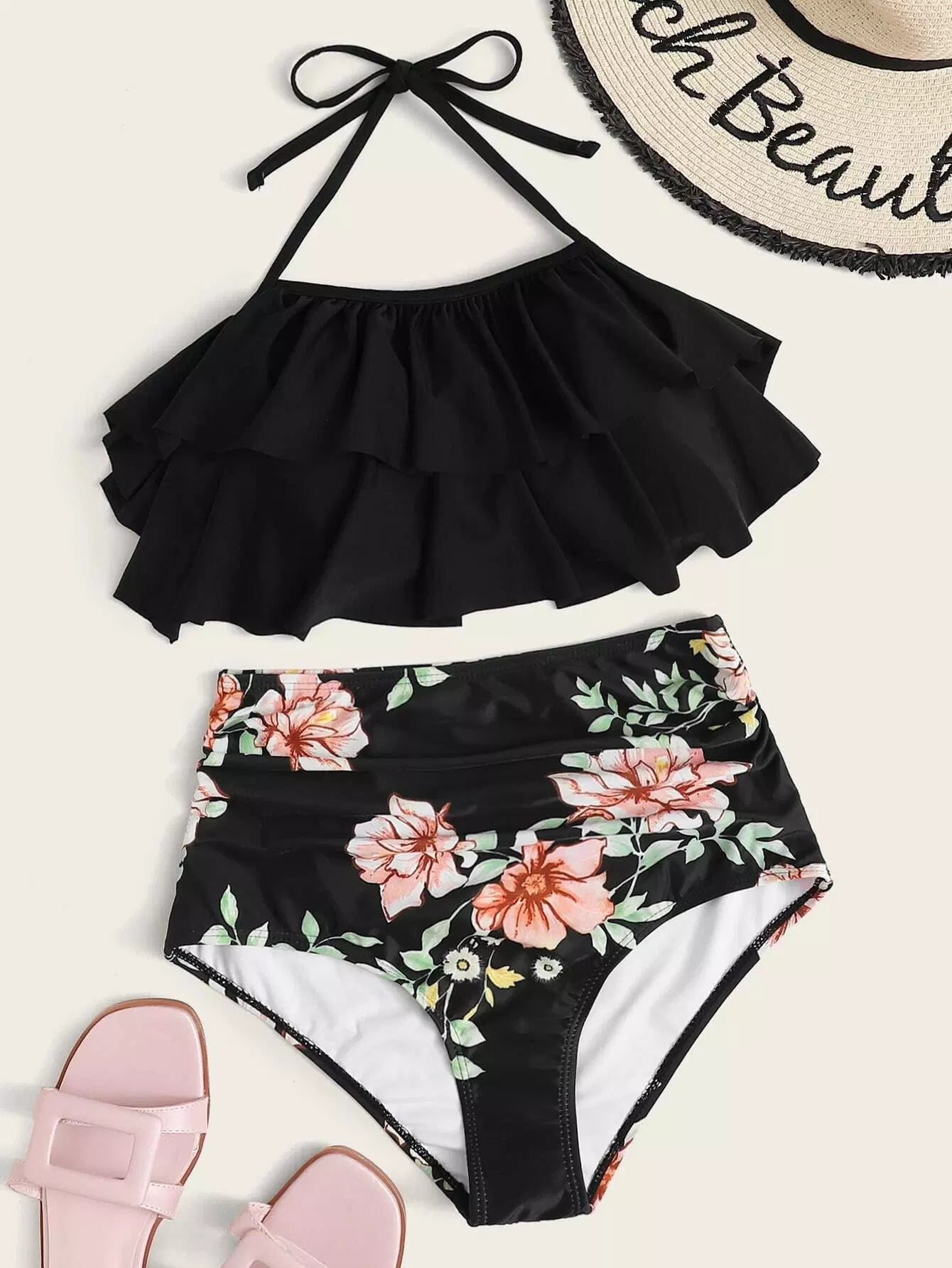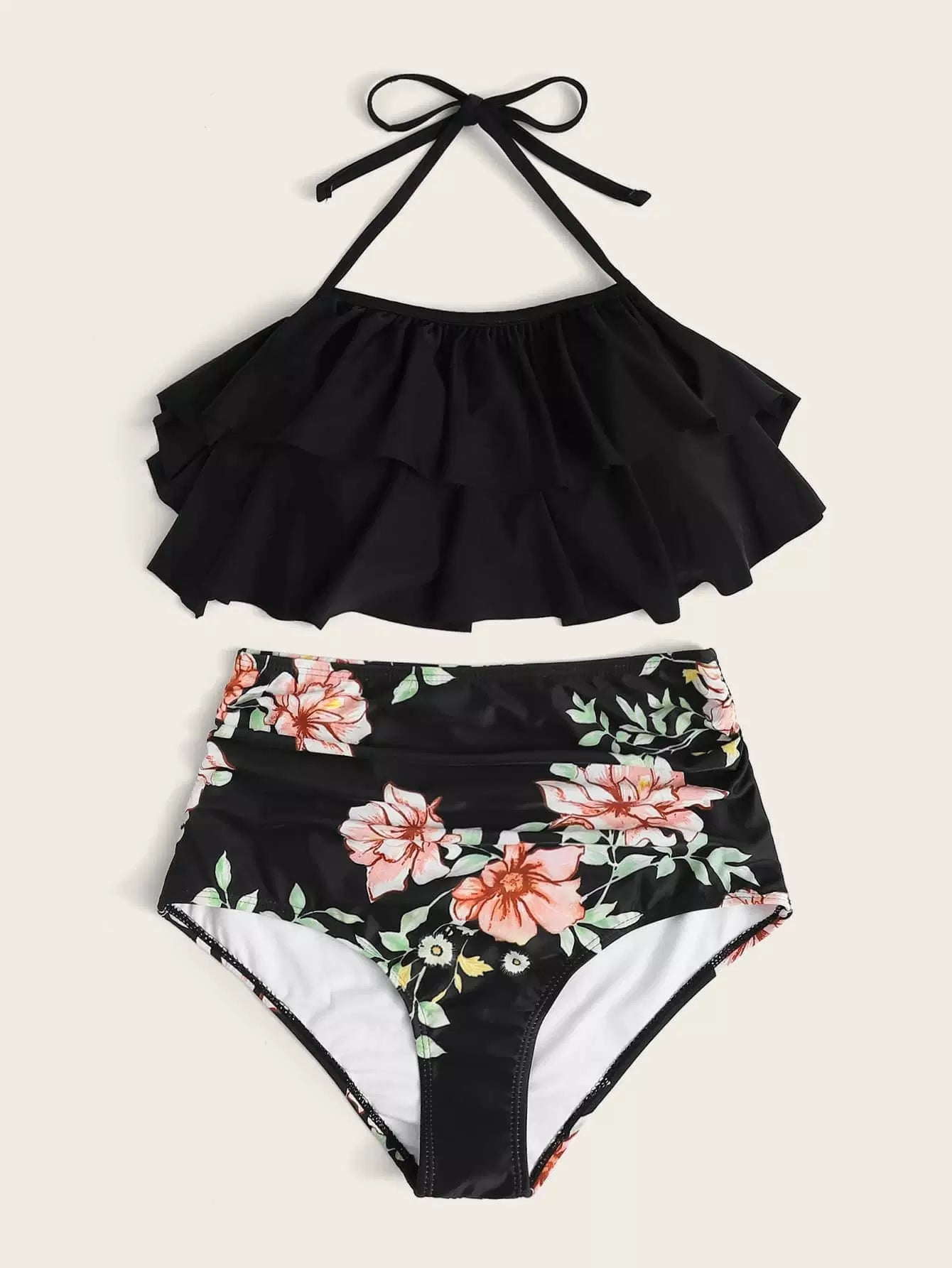 بدلة سباحة بيكيني بيكيني بطبقات متعددة الطبقات وعشوائية بنقوش زهور
