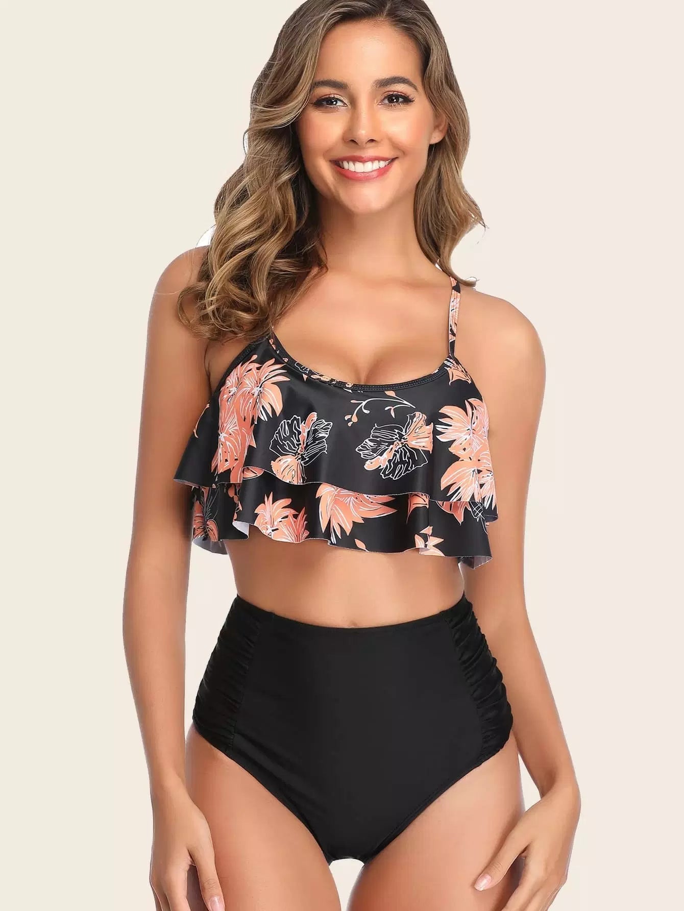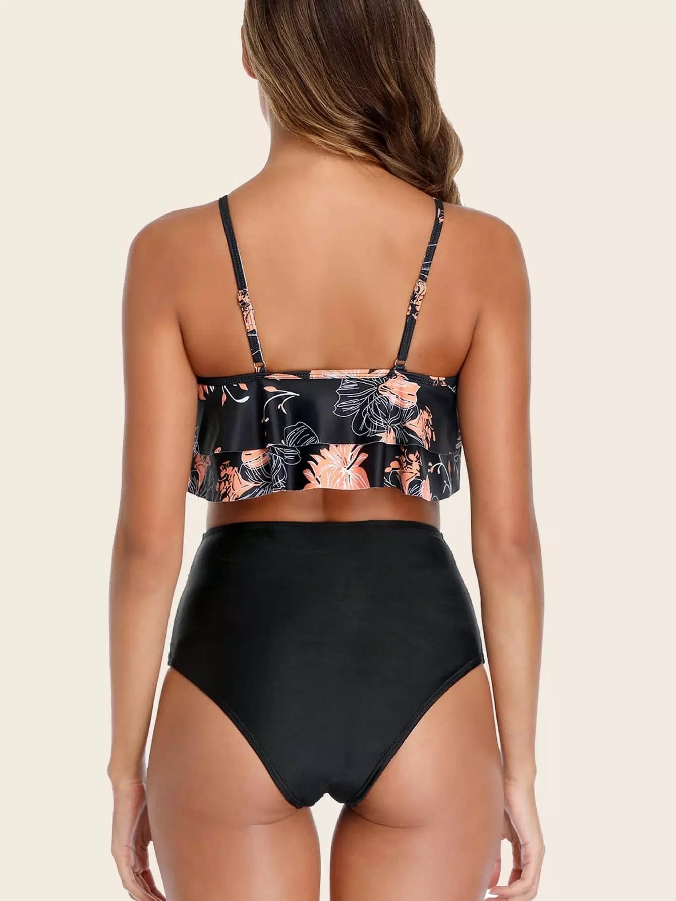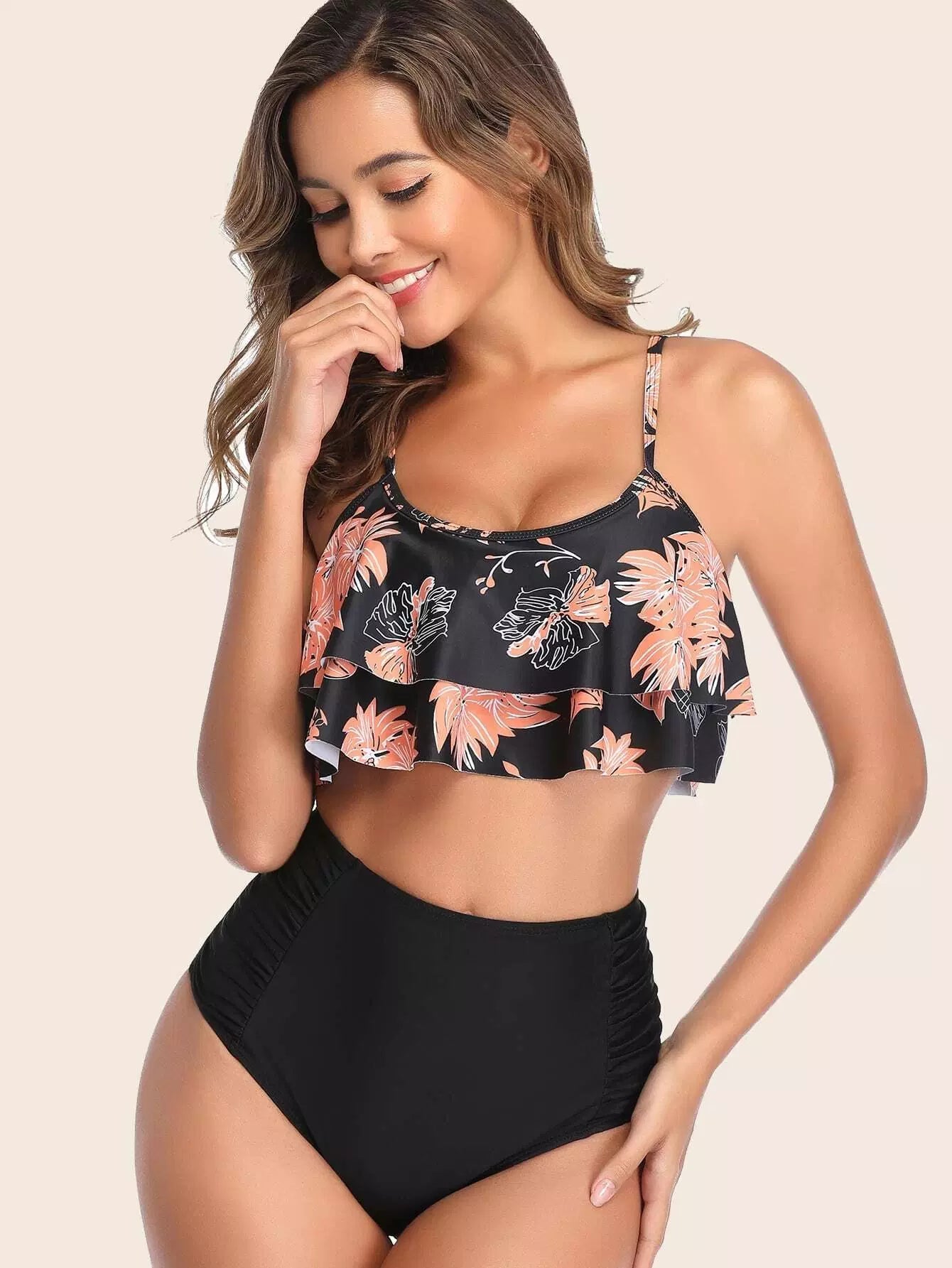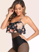 بدلة سباحة بيكيني استوائي بطبقات متدرجة عالية الخصر