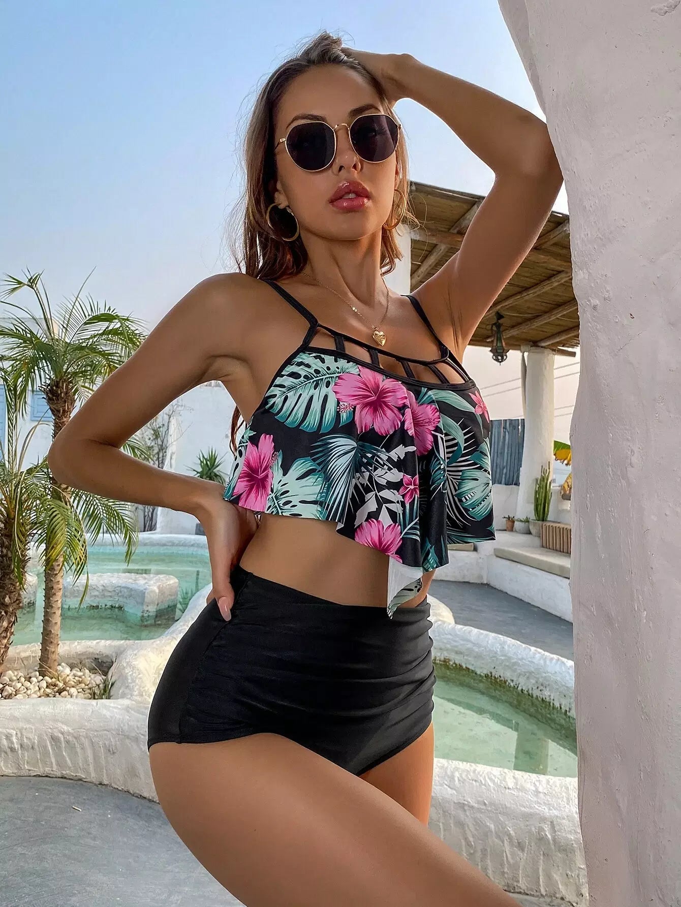 بدلة سباحة بيكيني بحاشية منقوشة بالزهور والاستوائية