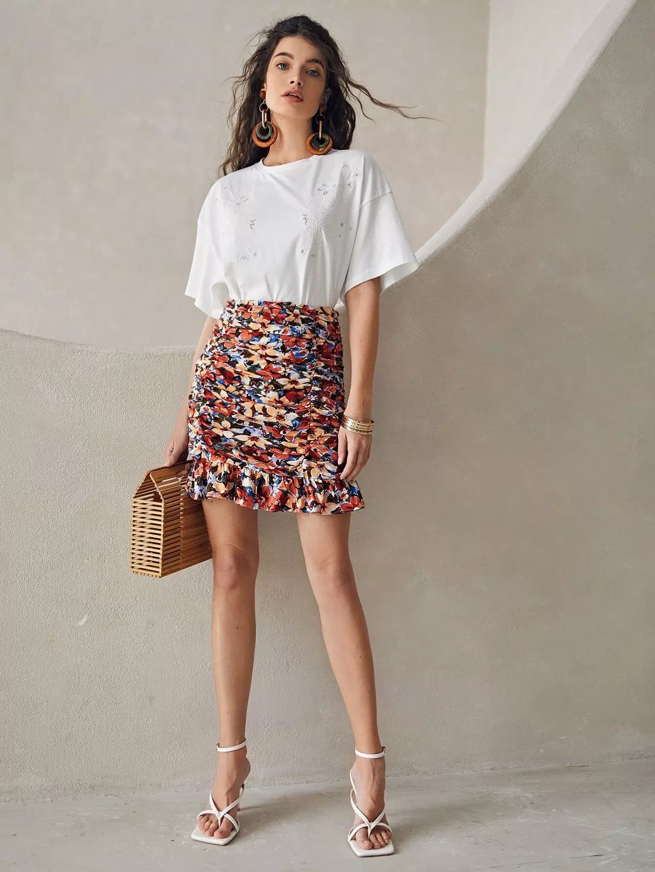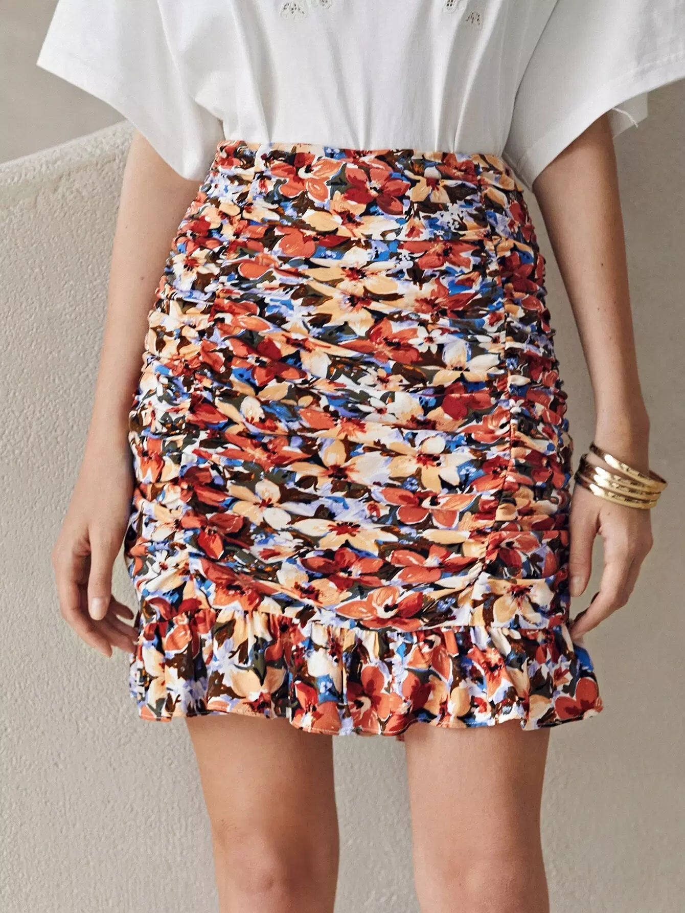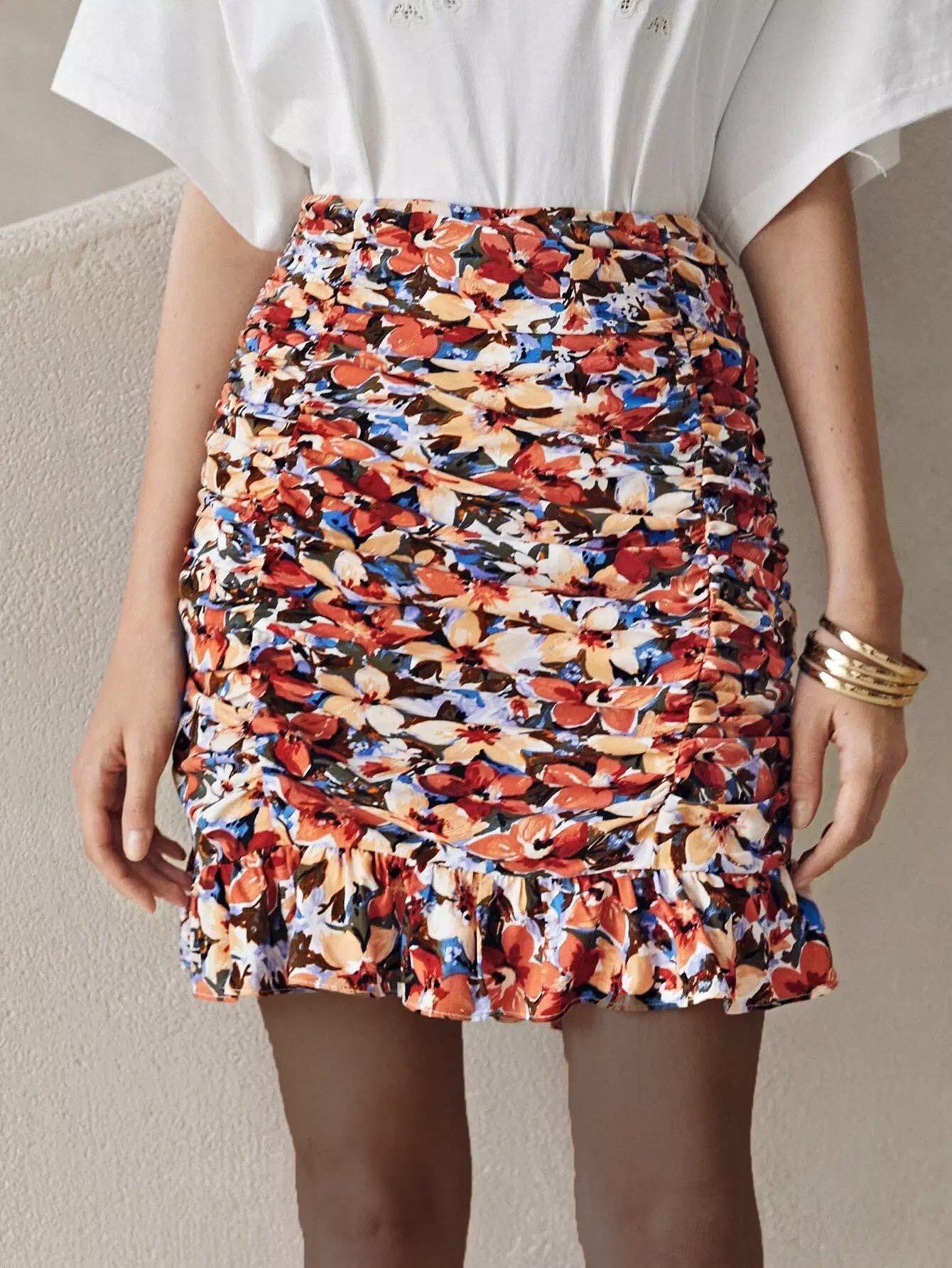 تنورة مزينة بطبعة زهور مطبوعة بالكامل ومزينة بكشكش بحواف مكشكشة
