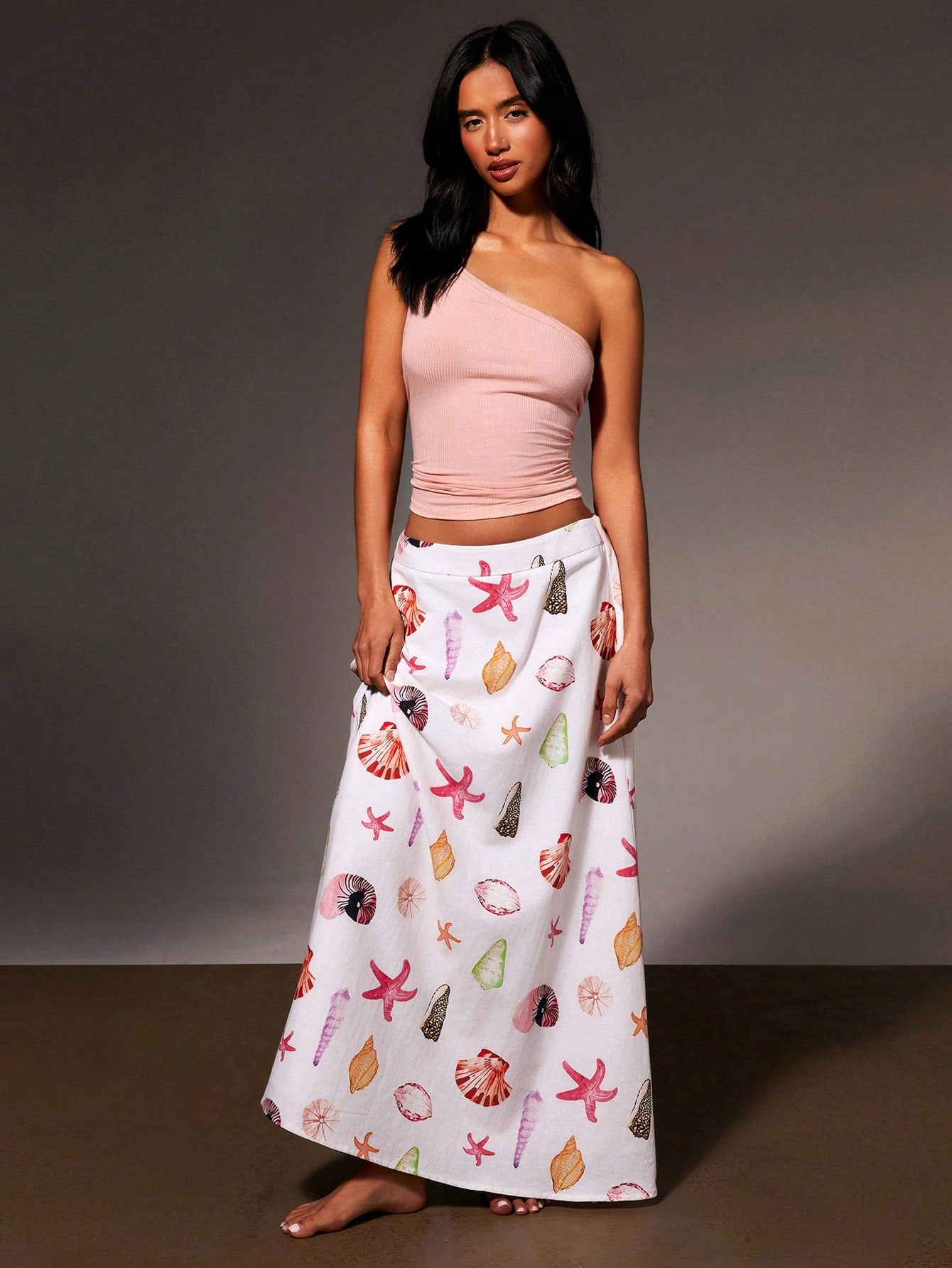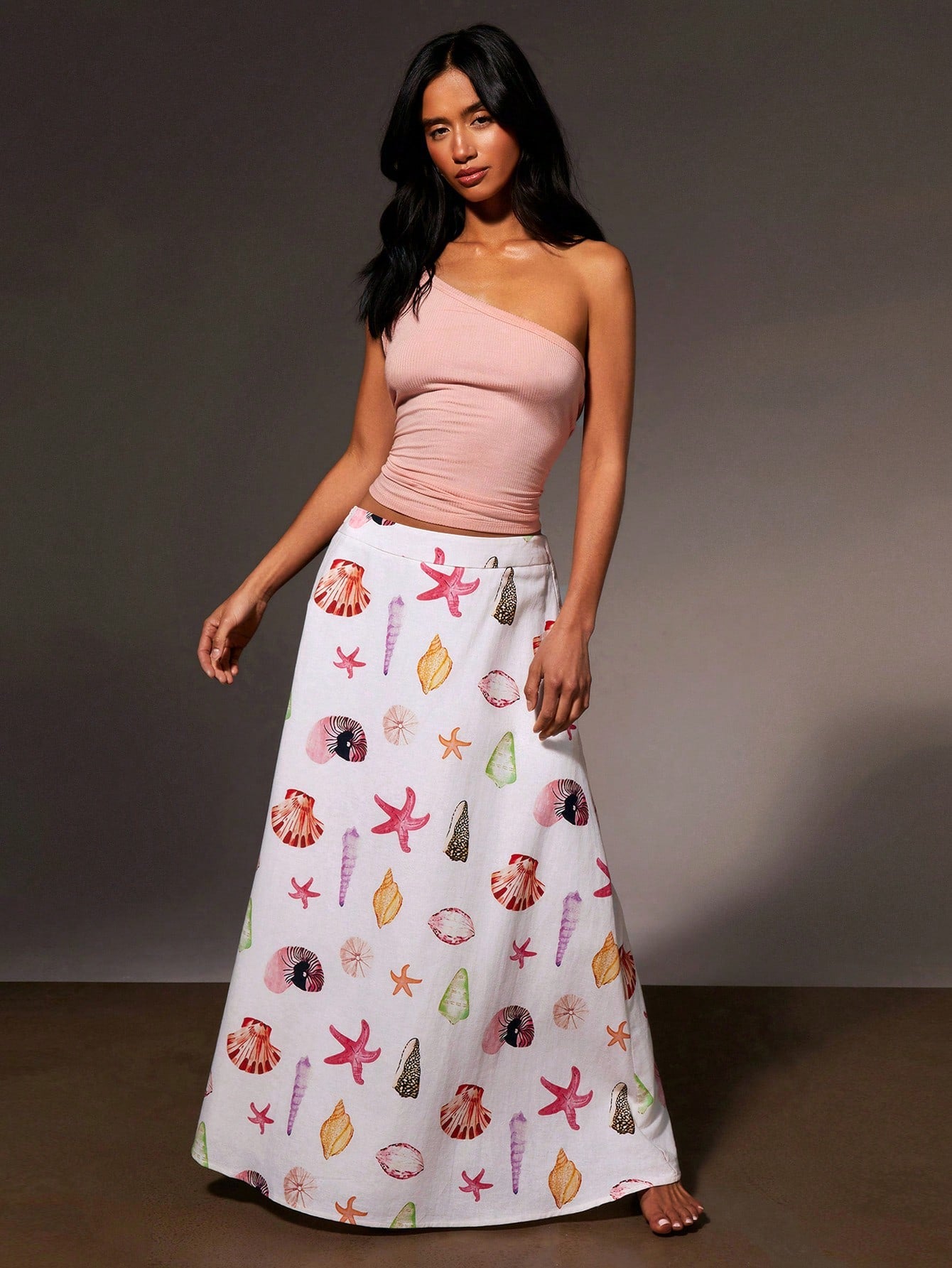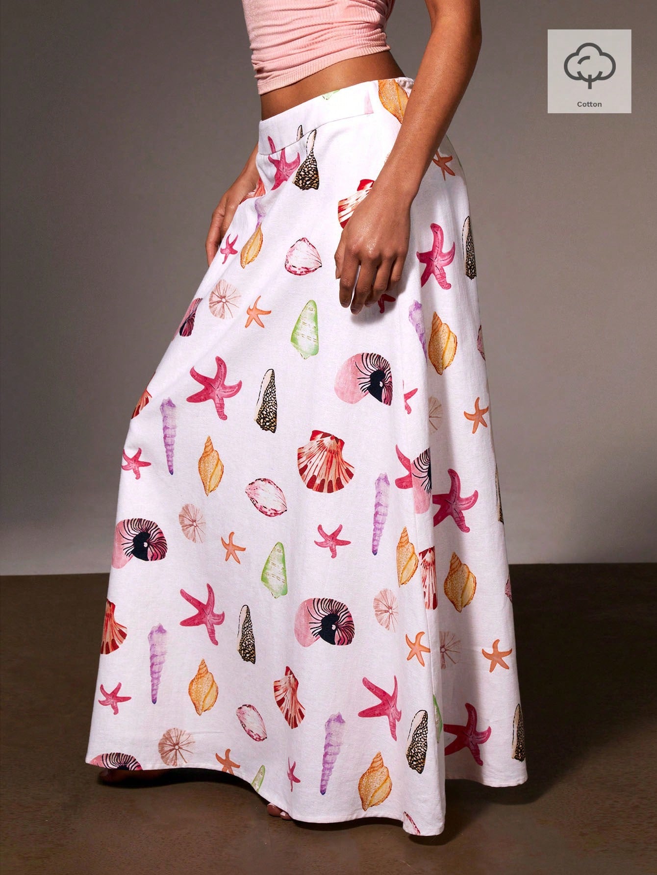 Athal Women's White Woven Fabric Casual Long Semi-Sheer Seashell Print Skirt