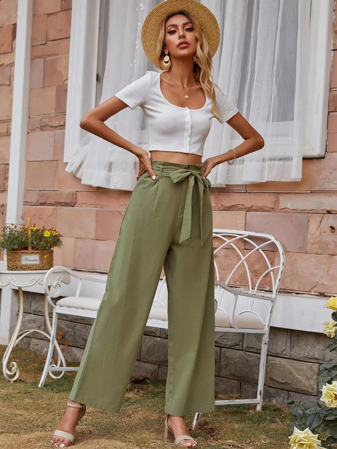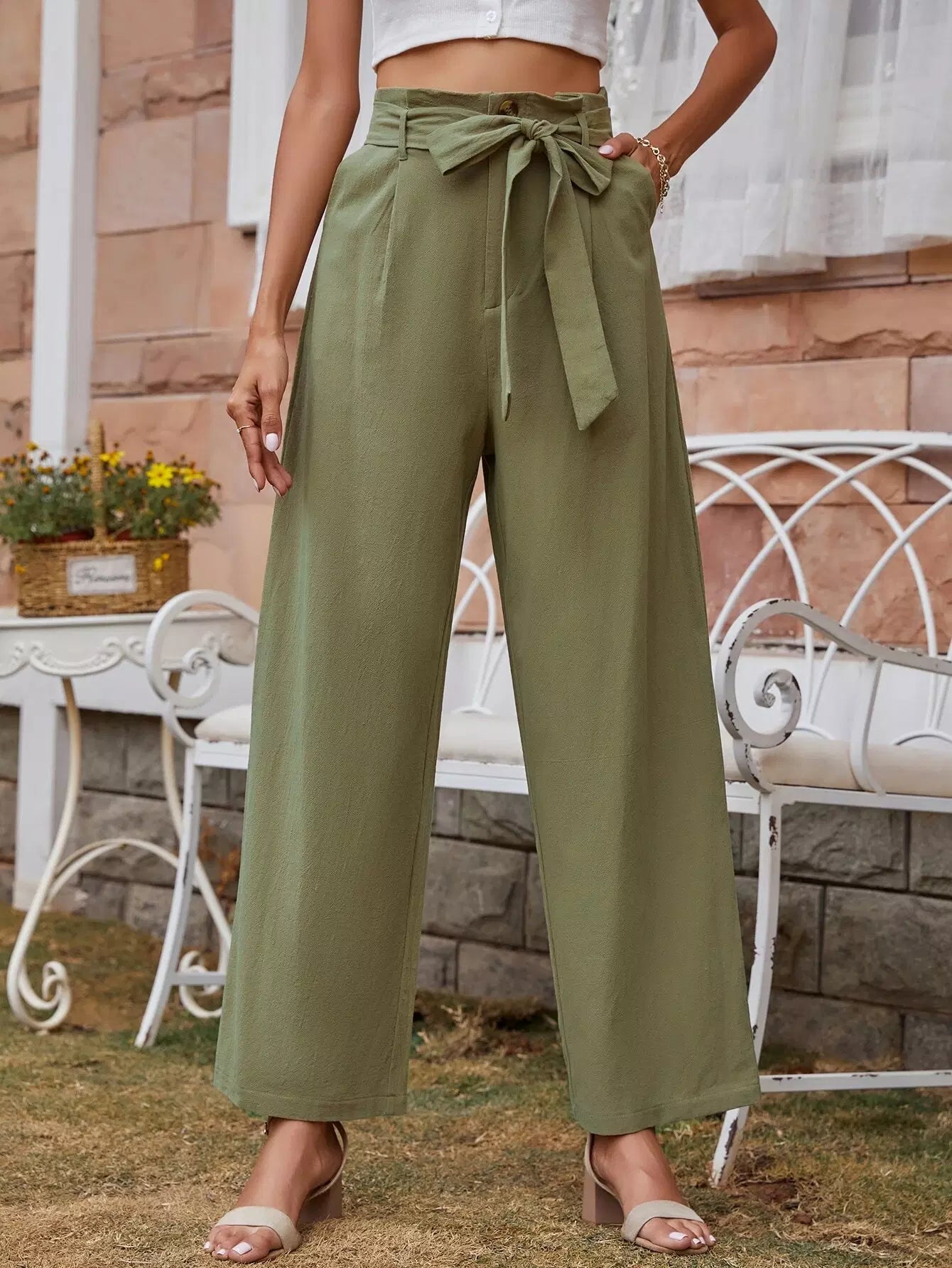للنساء - بنطال سادة واسع الساق بحزام