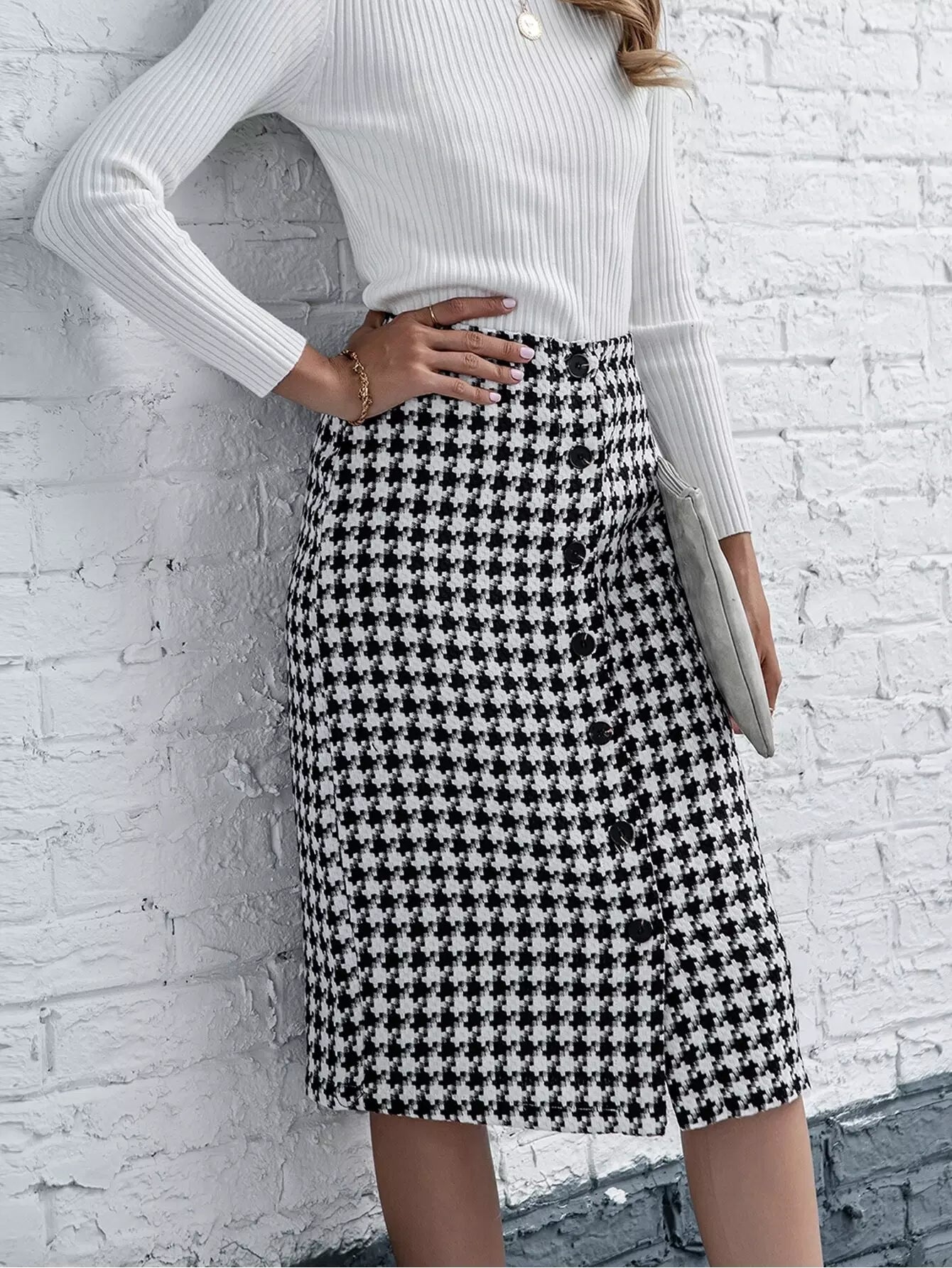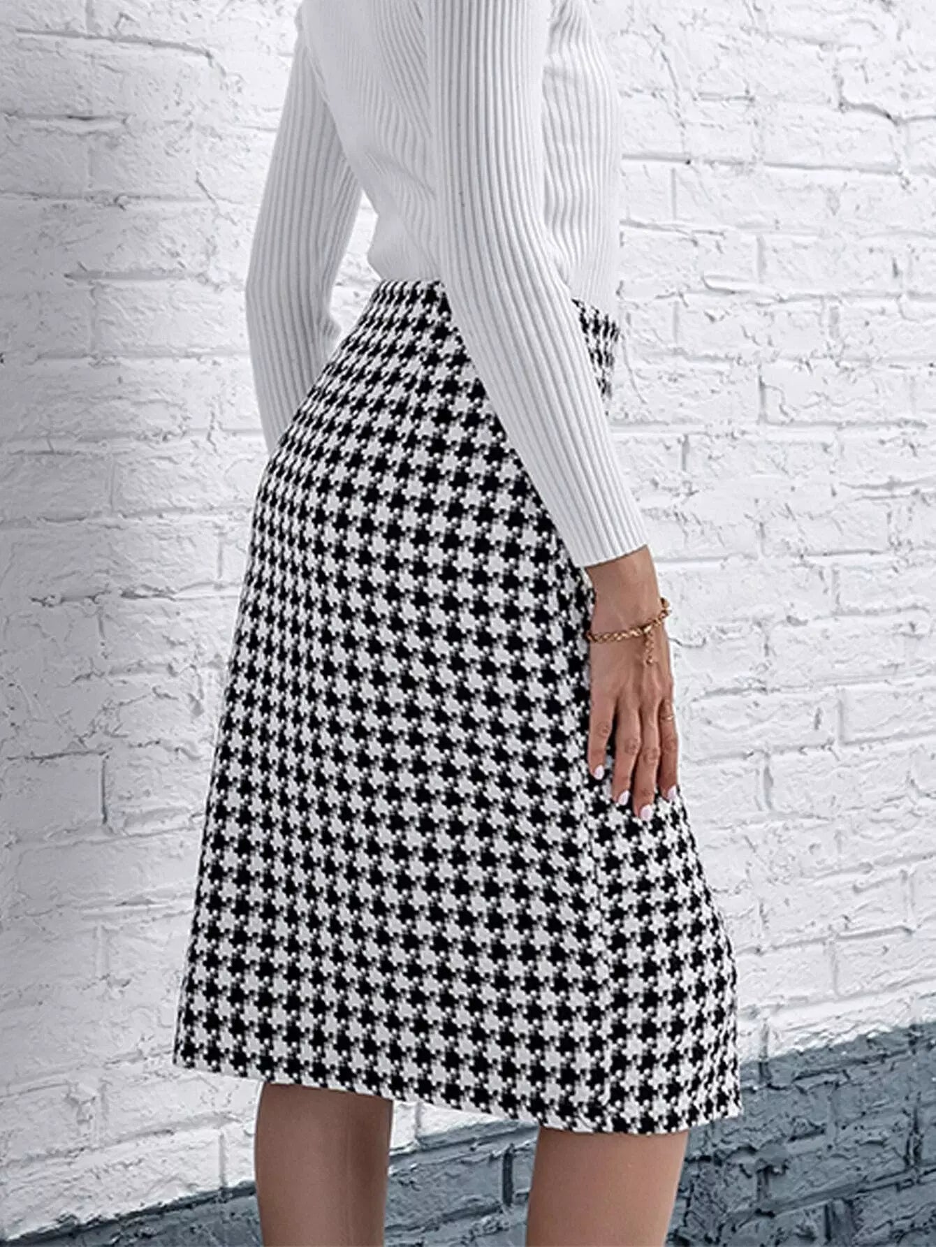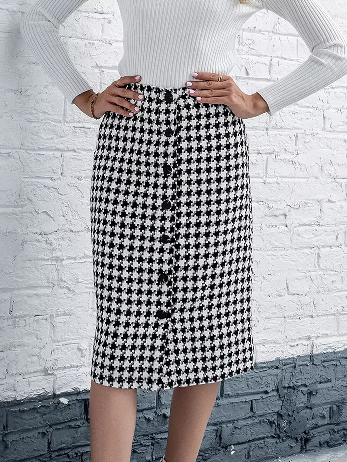 تنورة تويد بنقشة مربعات بأزرار أمامية
