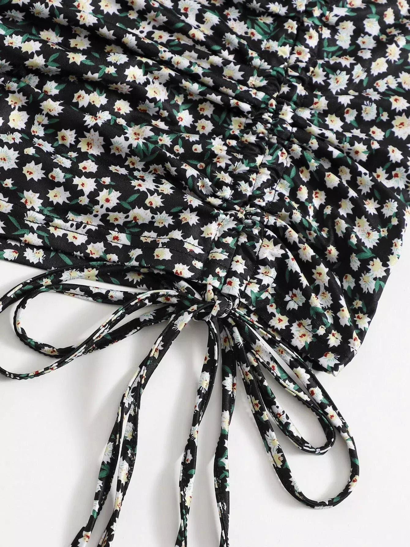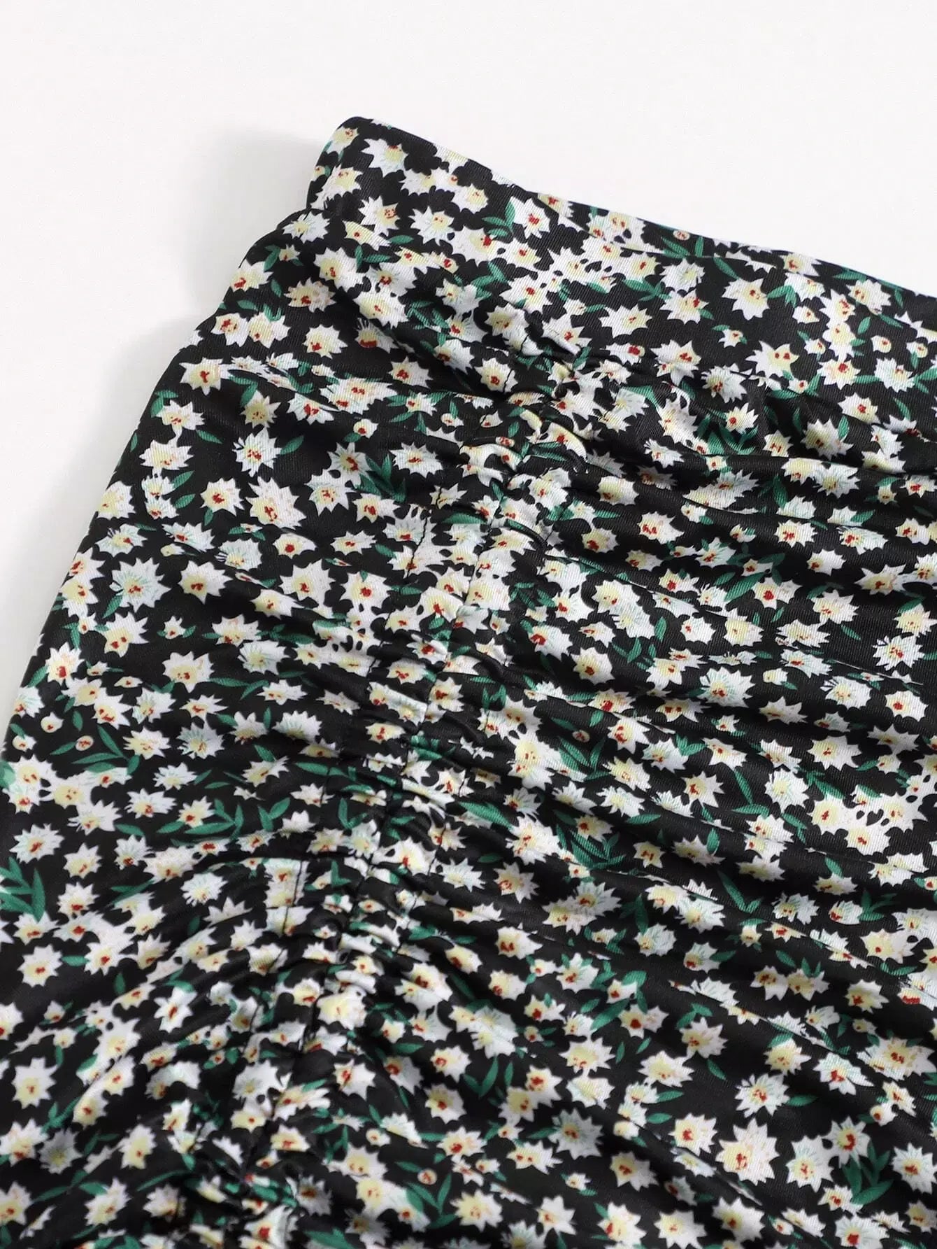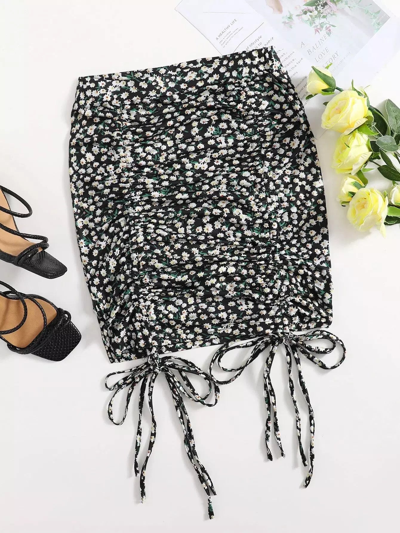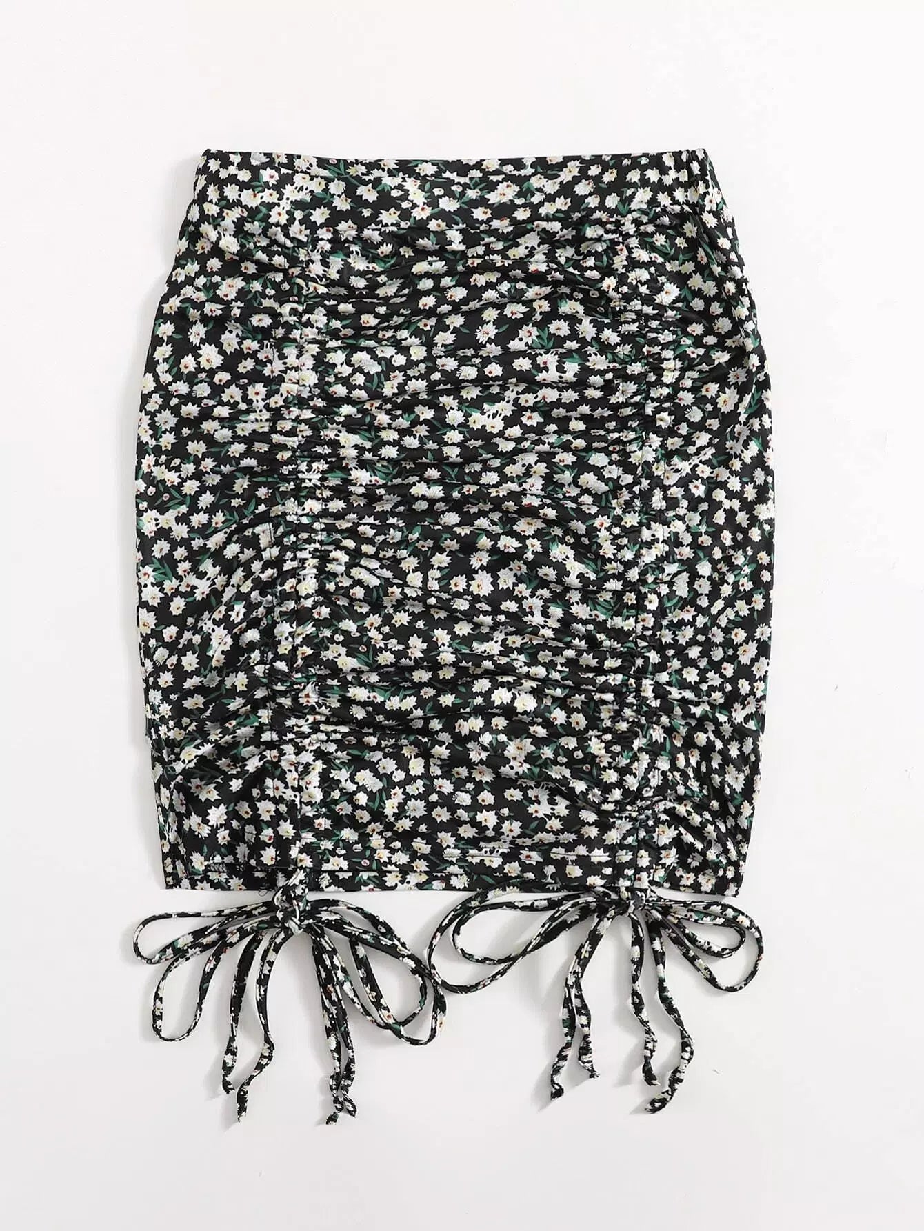 تنورة ضيقة مزينة بنقشة زهور صغيرة مع رباط وتفاصيل مجعدة