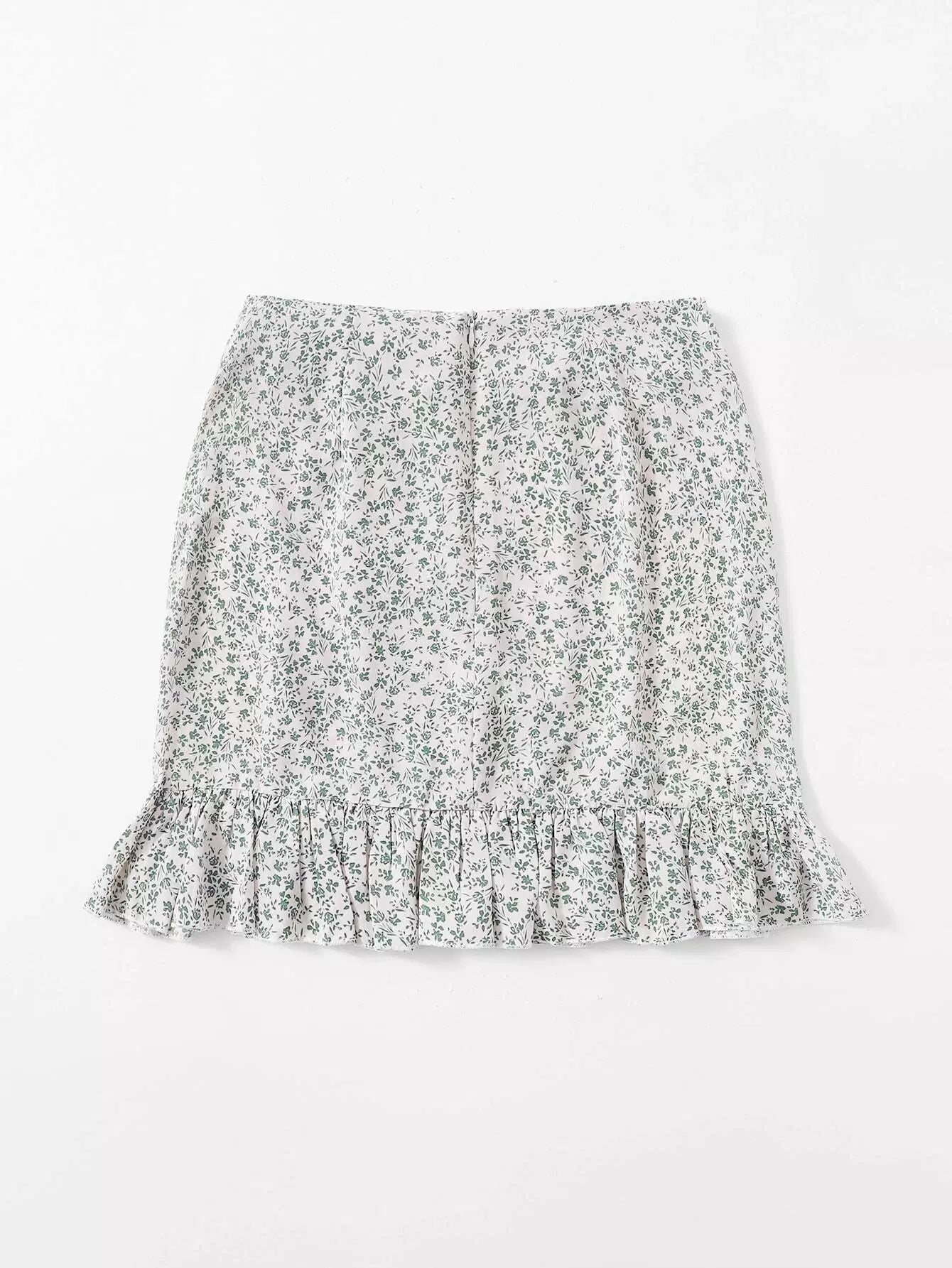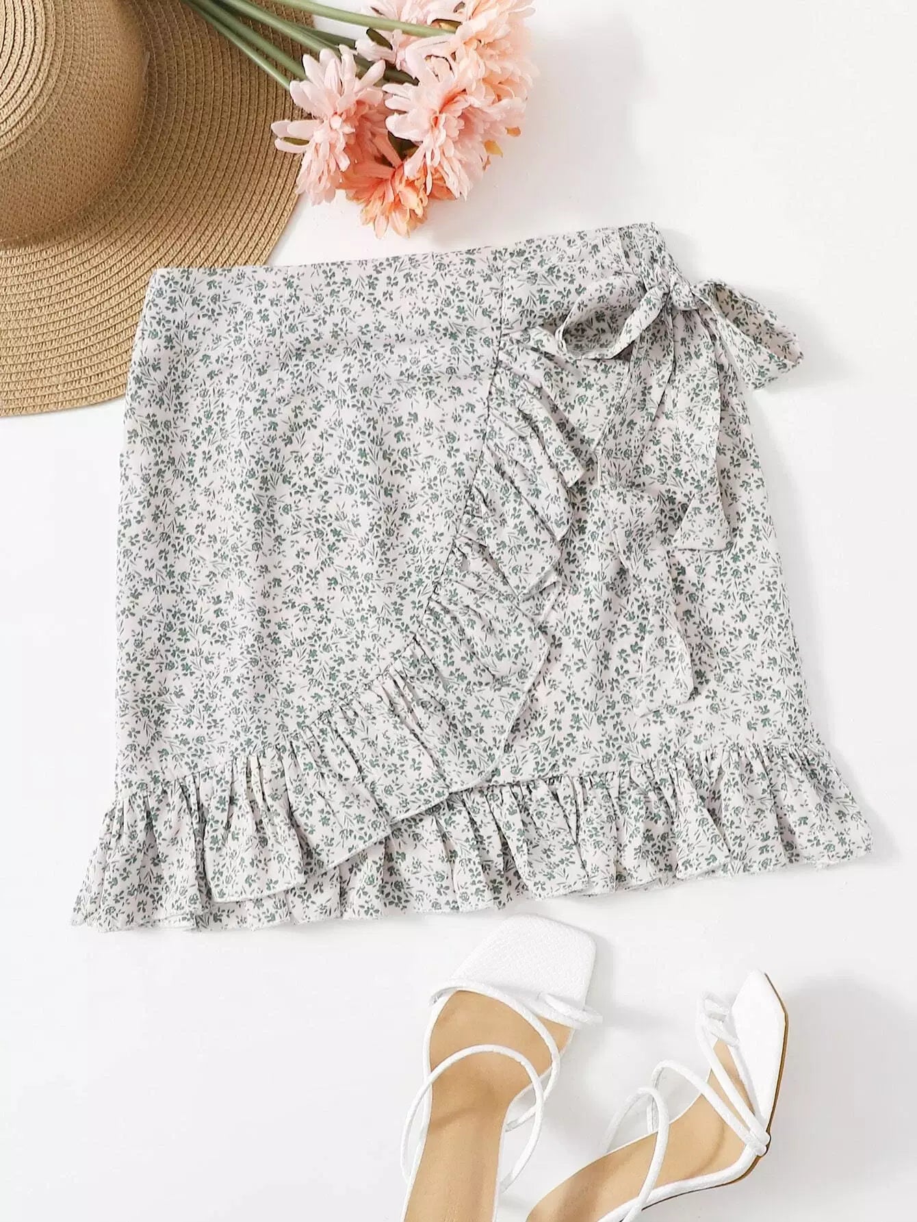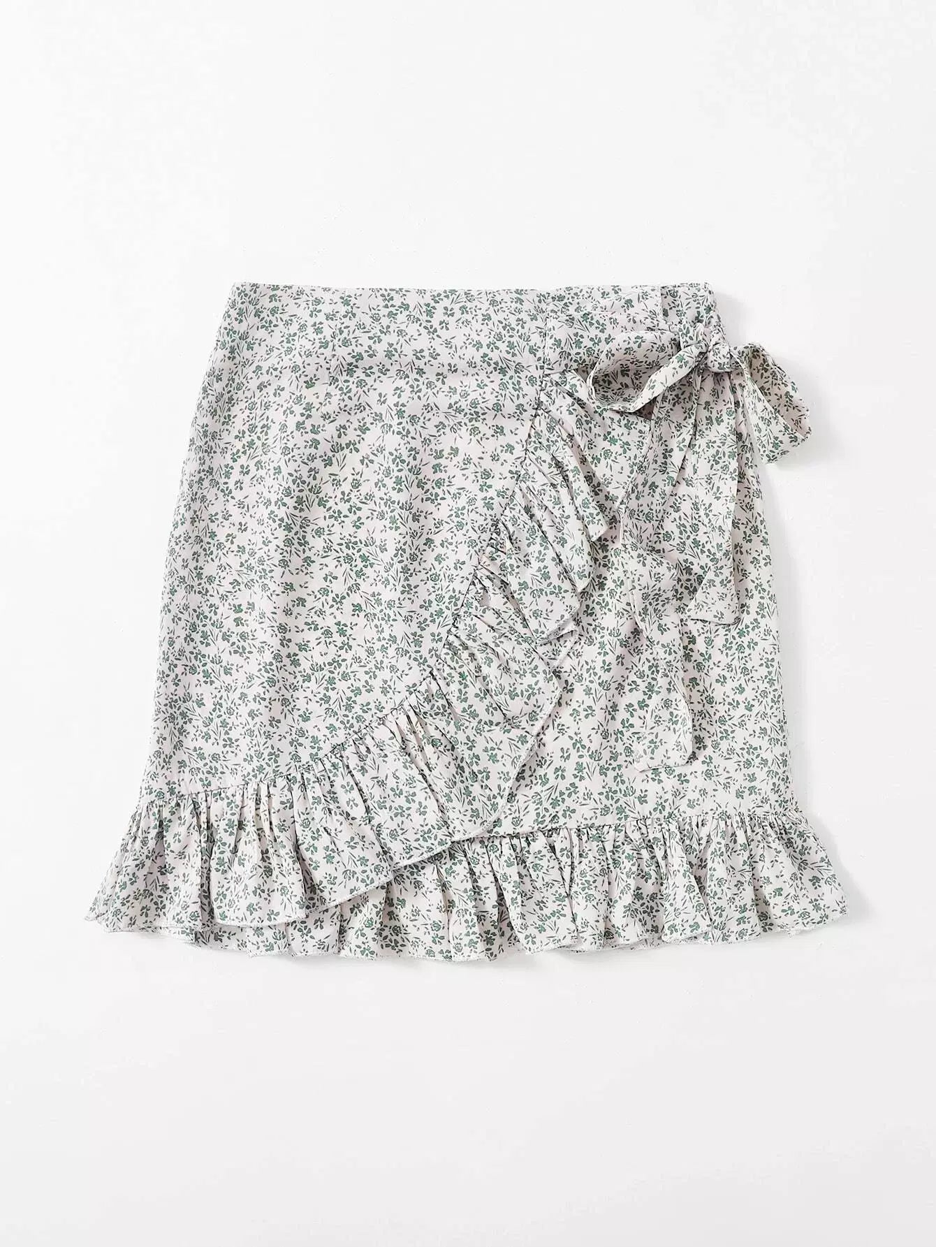 النساء - تنورة ذات حاشية مكشكشة جانبية وعقدة زهور