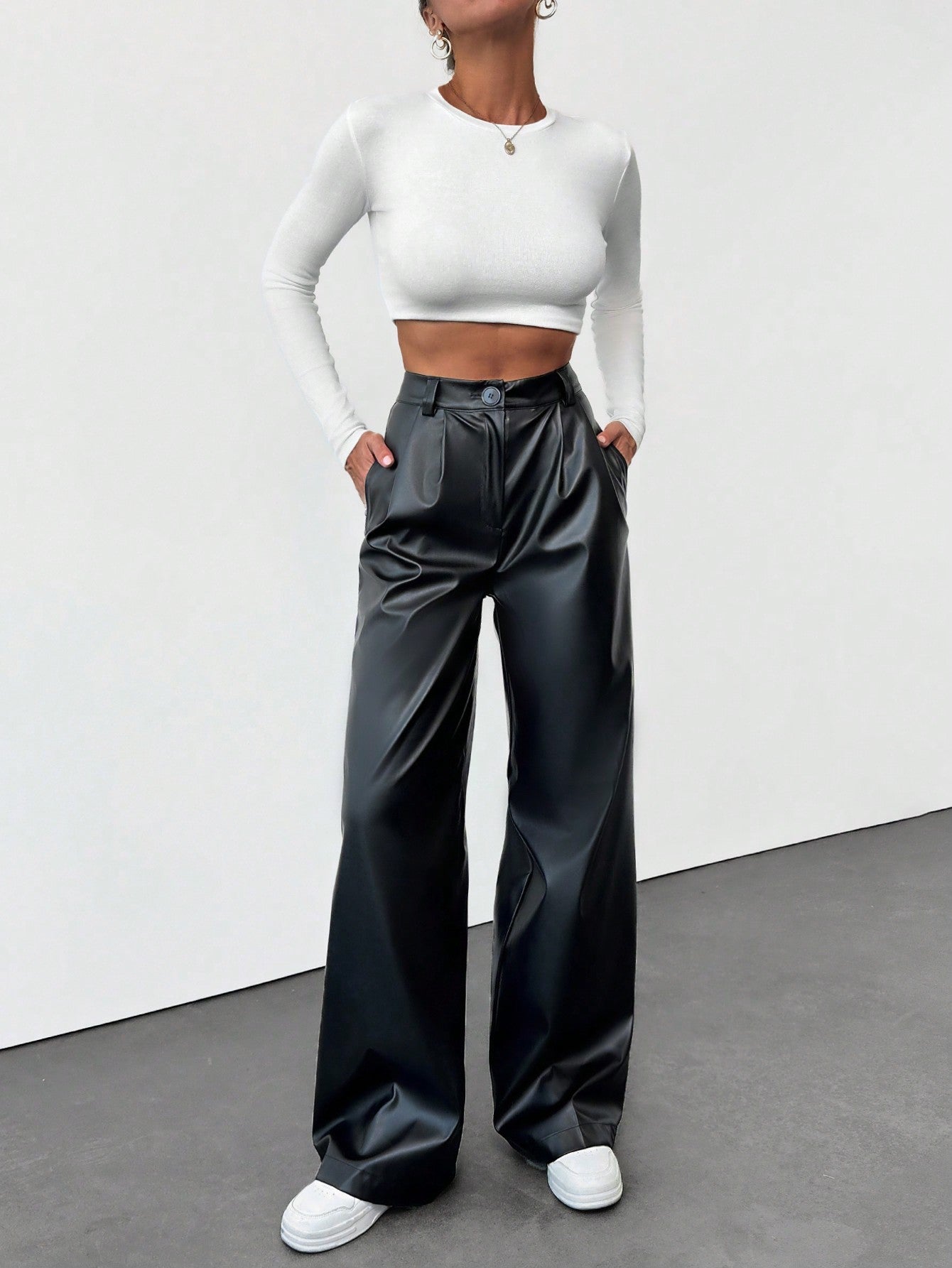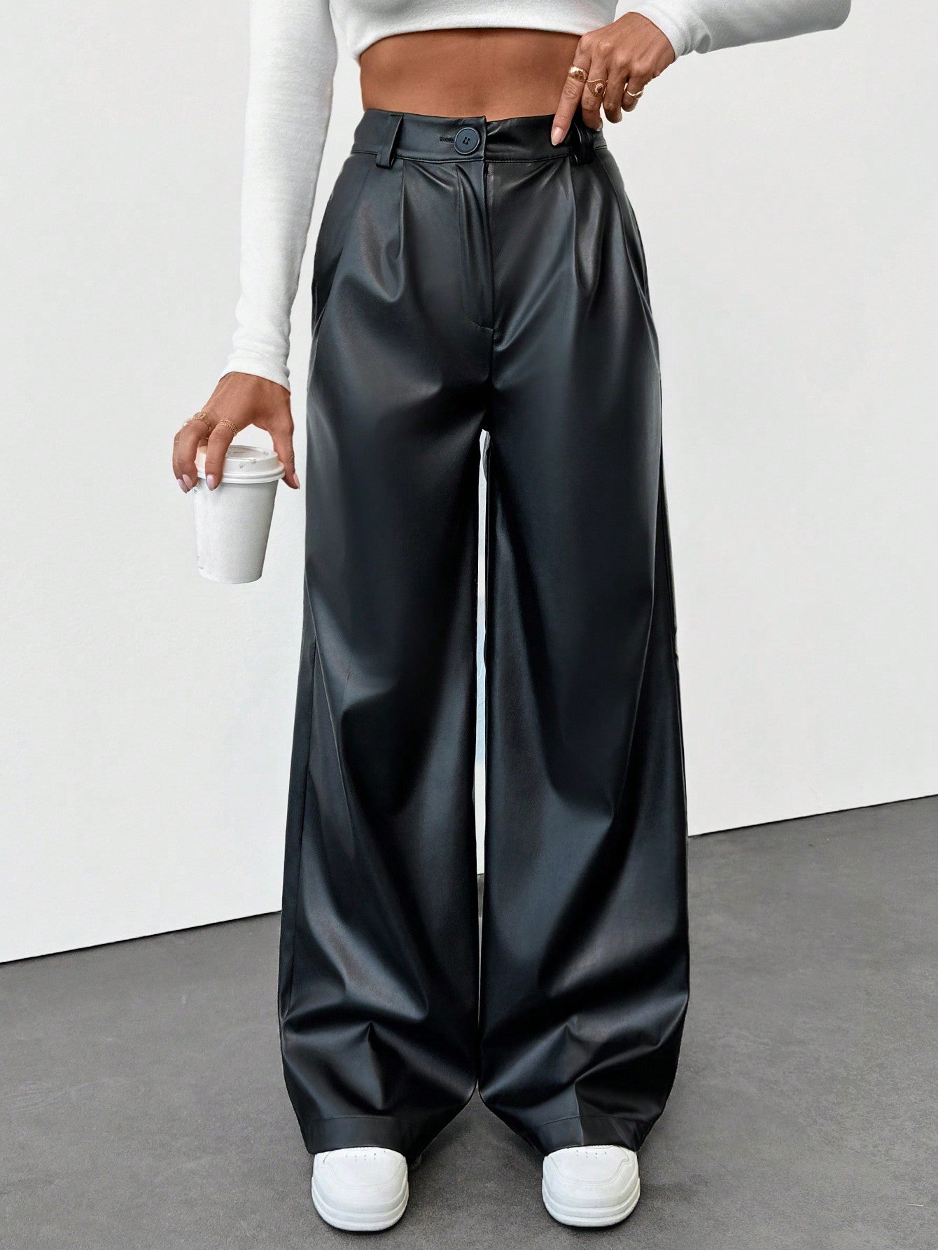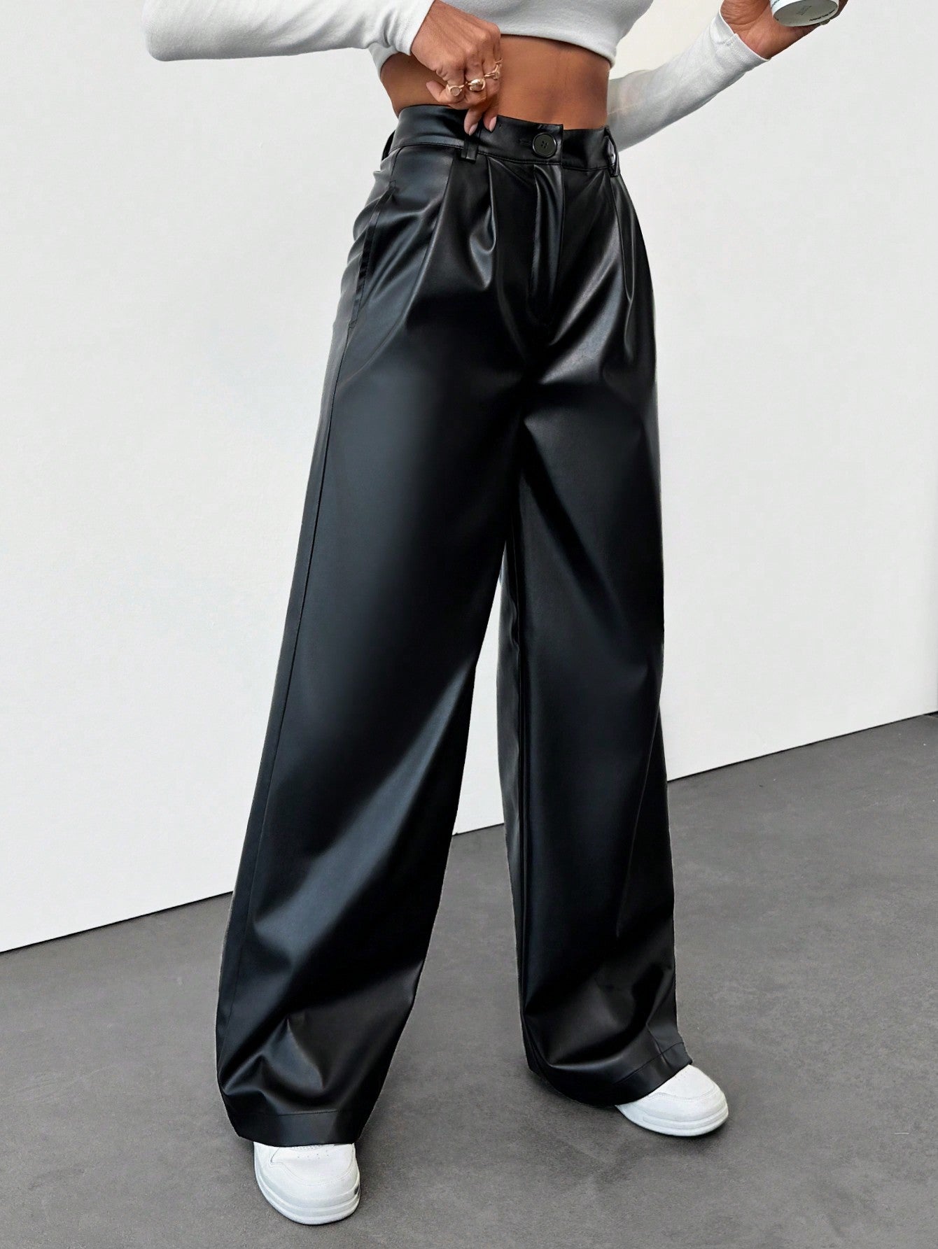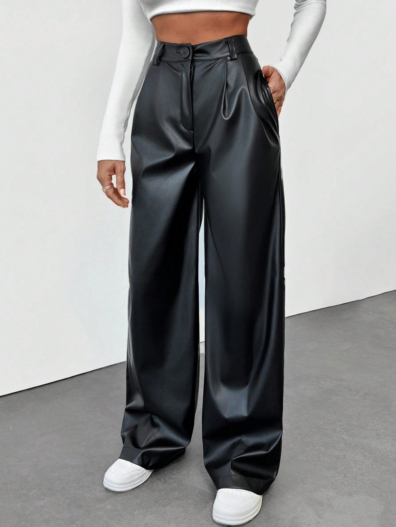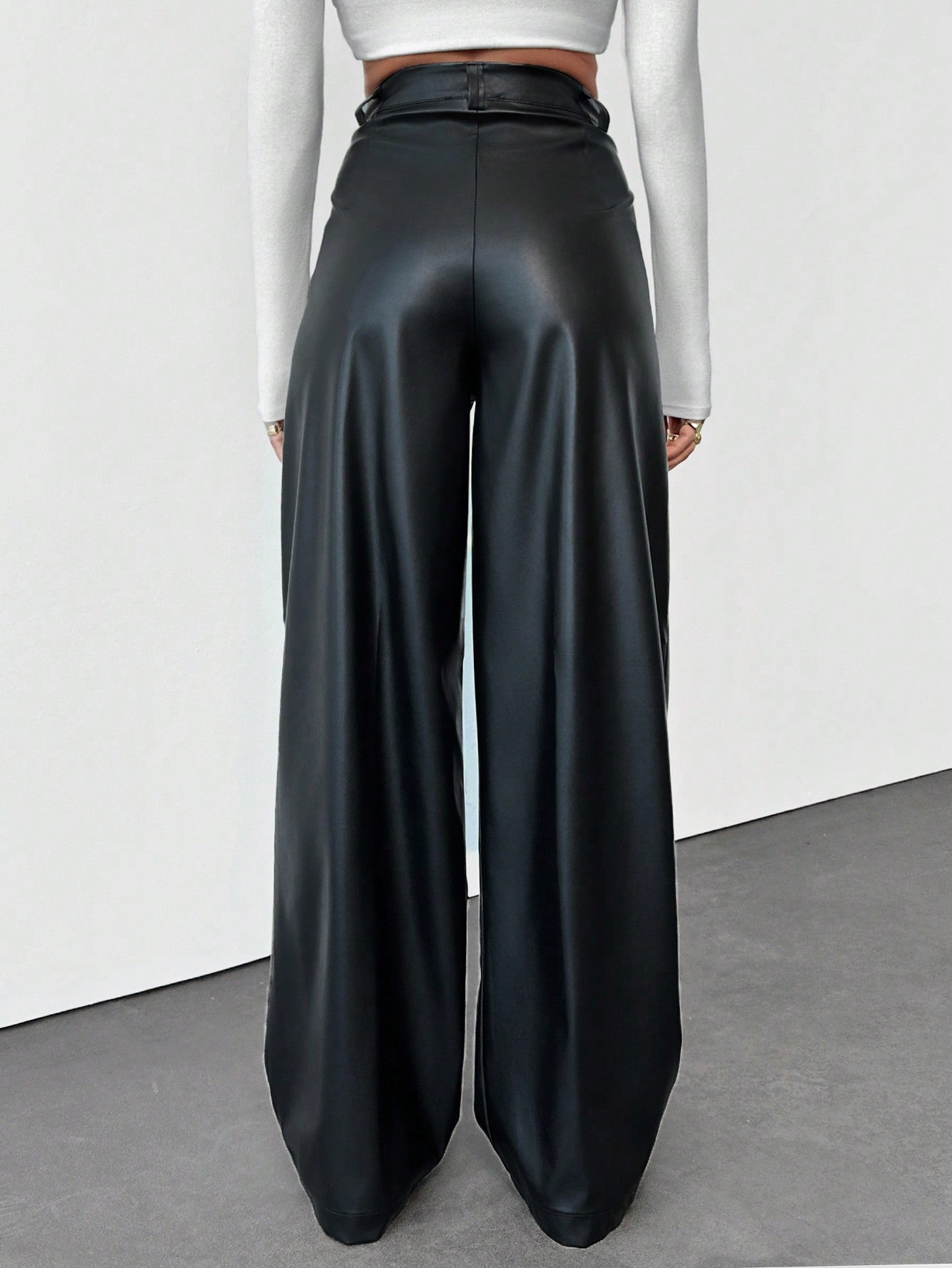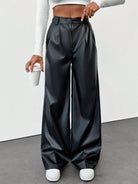 تنبيه من يورو ميوز! بنطال جلدي صناعي عالي الخصر بسحاب أمامي، بقصة مريحة.
