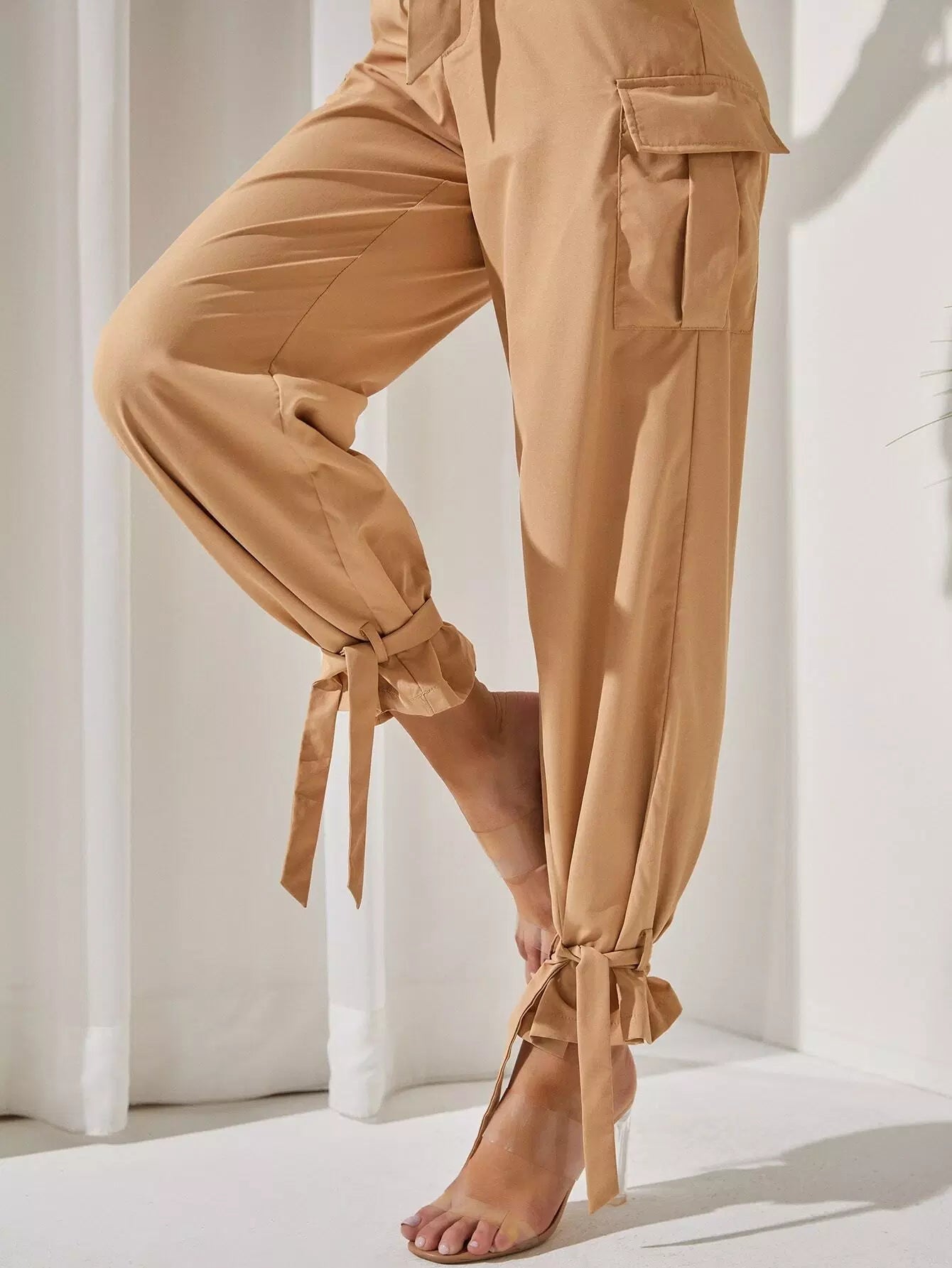 سروال بحاشية وعقدة وجيب قلاب بدون حزام
