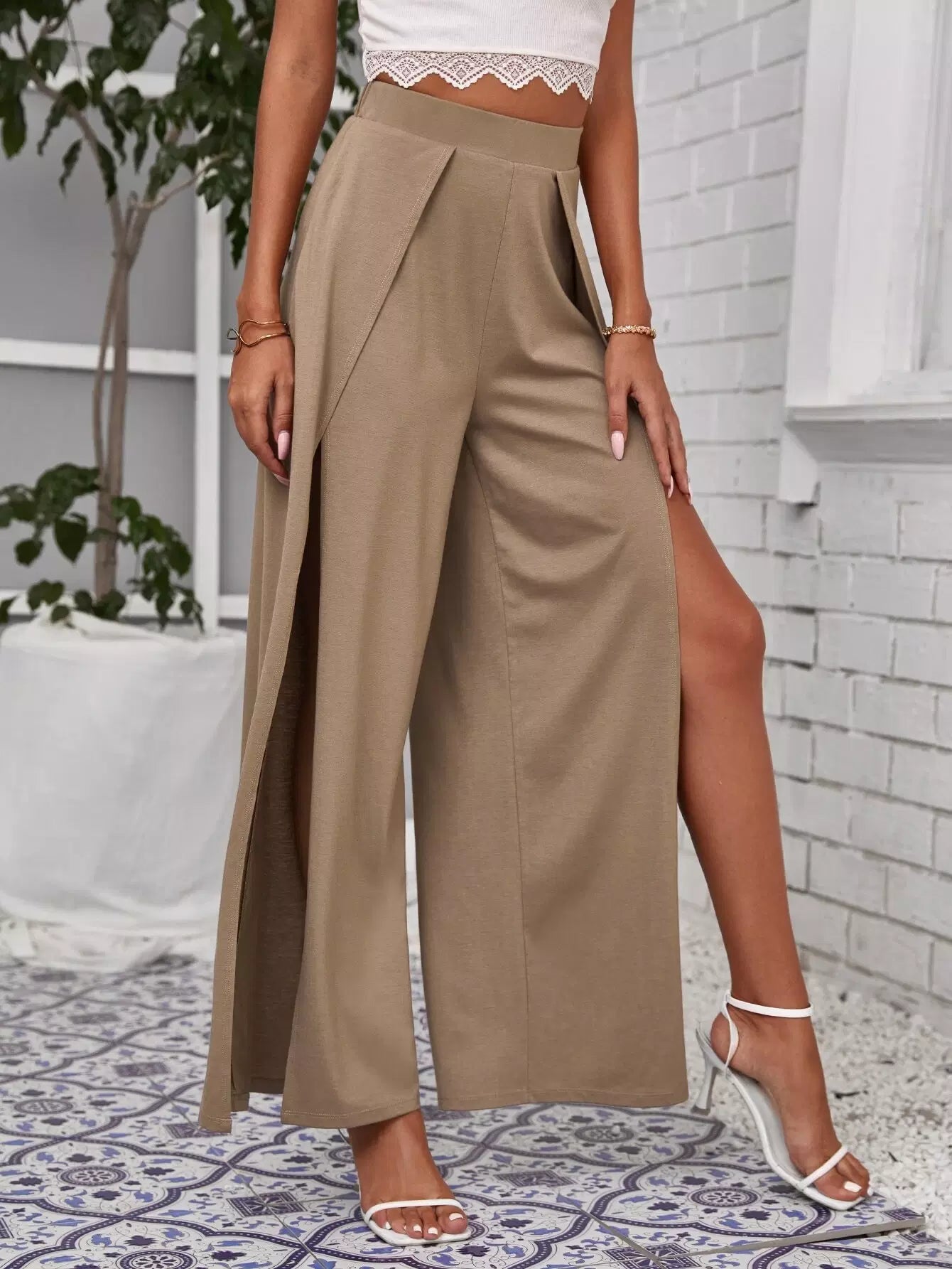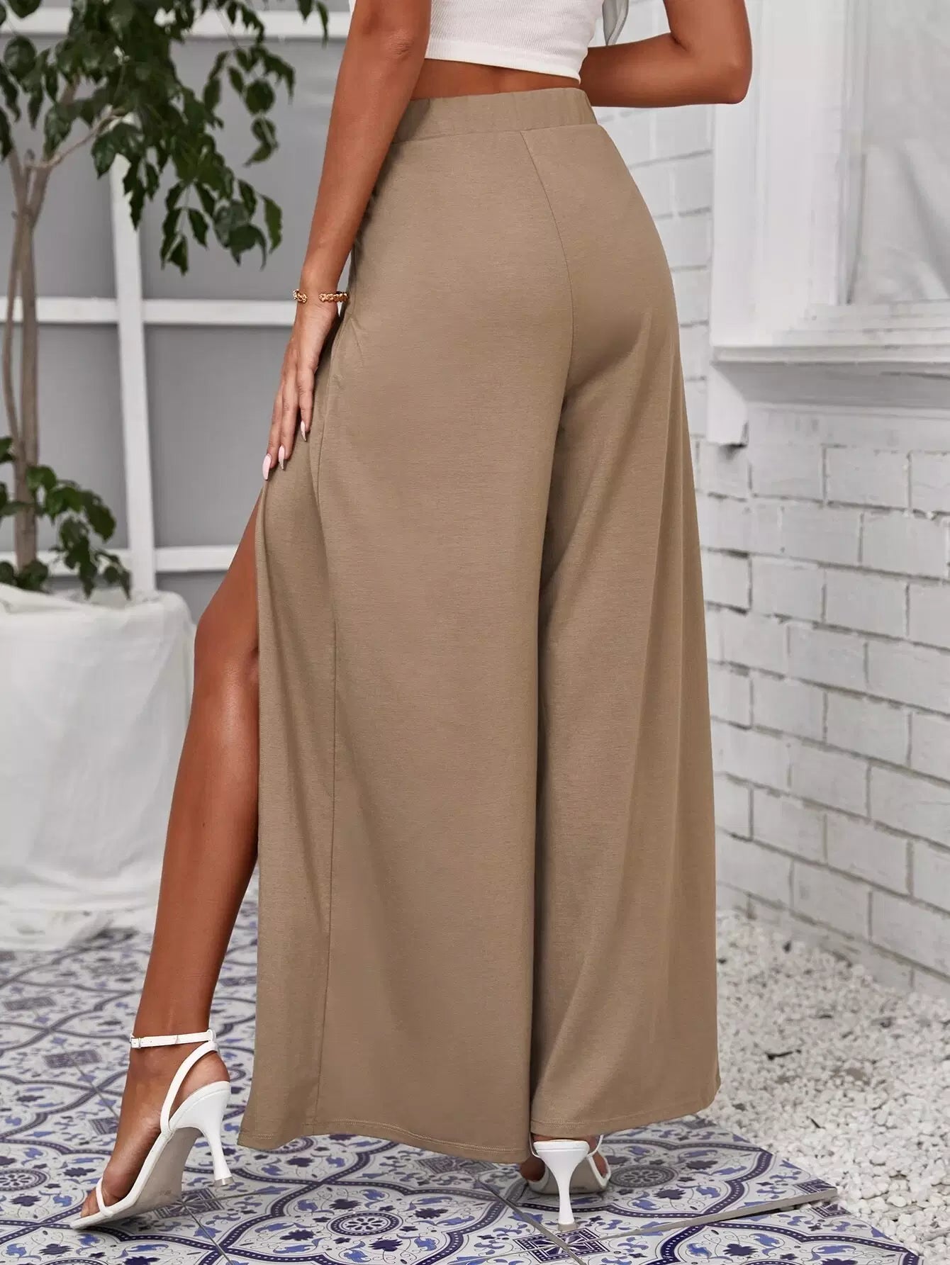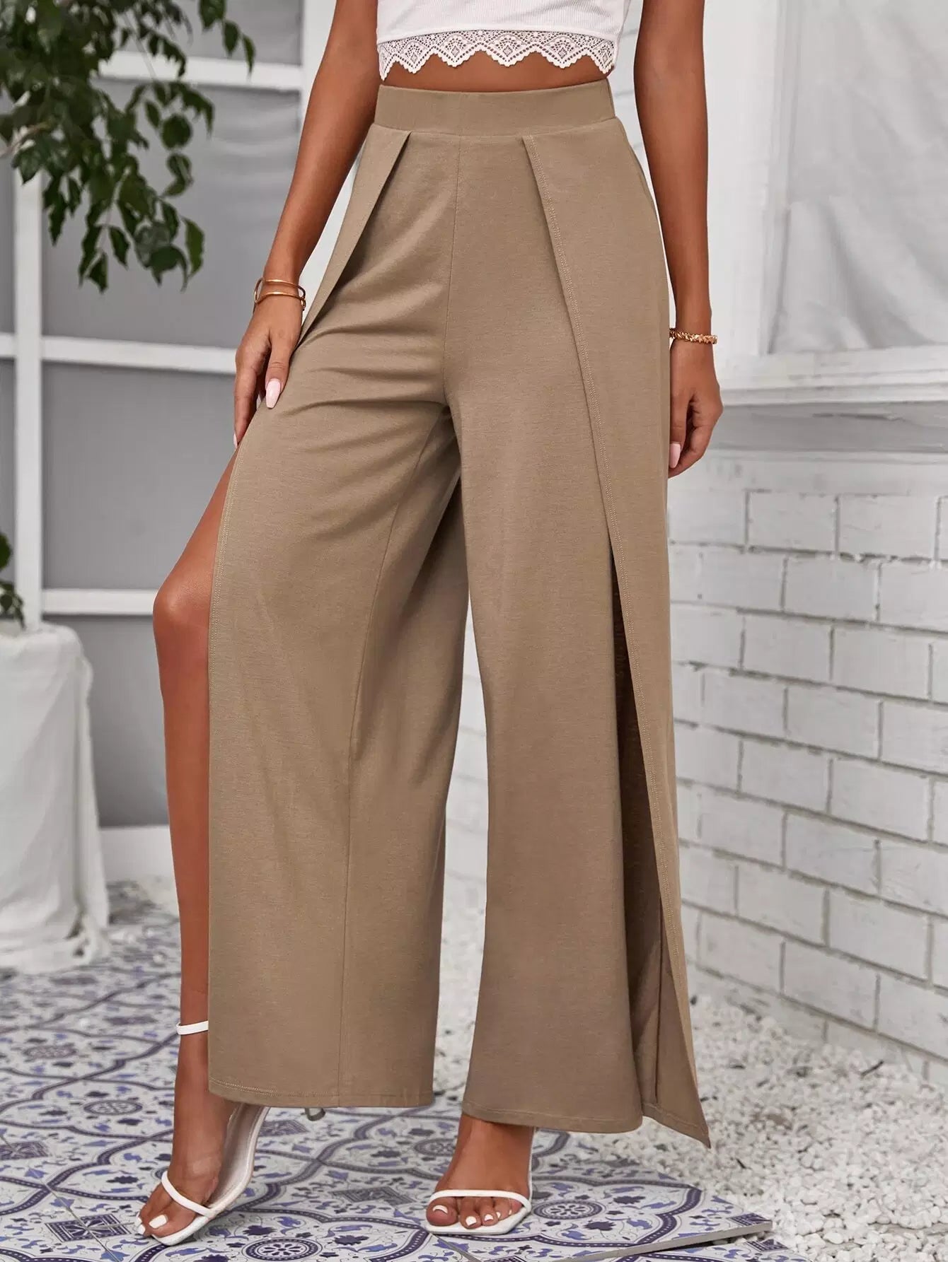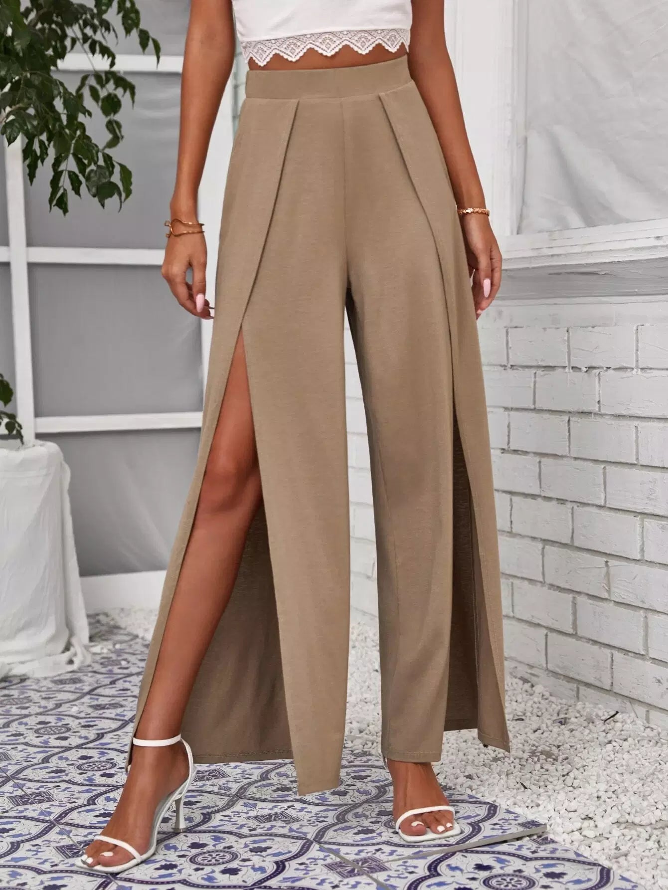 بنطلون بفتحة أمامية مطوية من الأمام ومقسمة من الفخذين