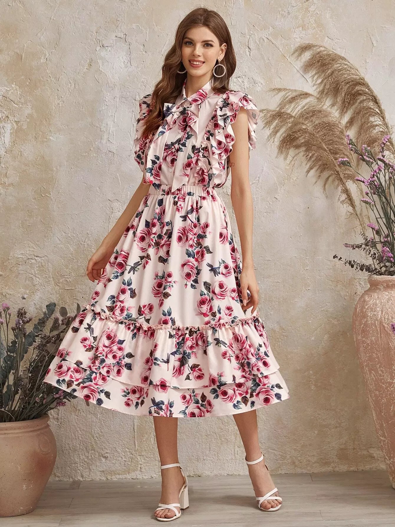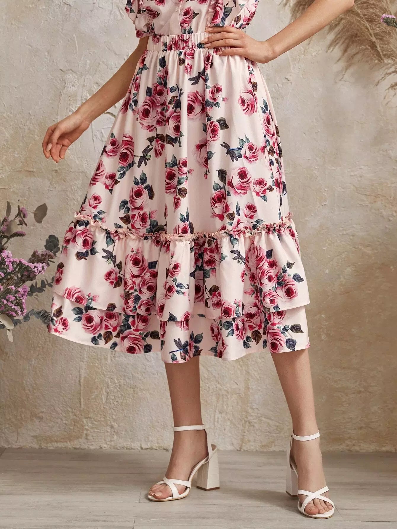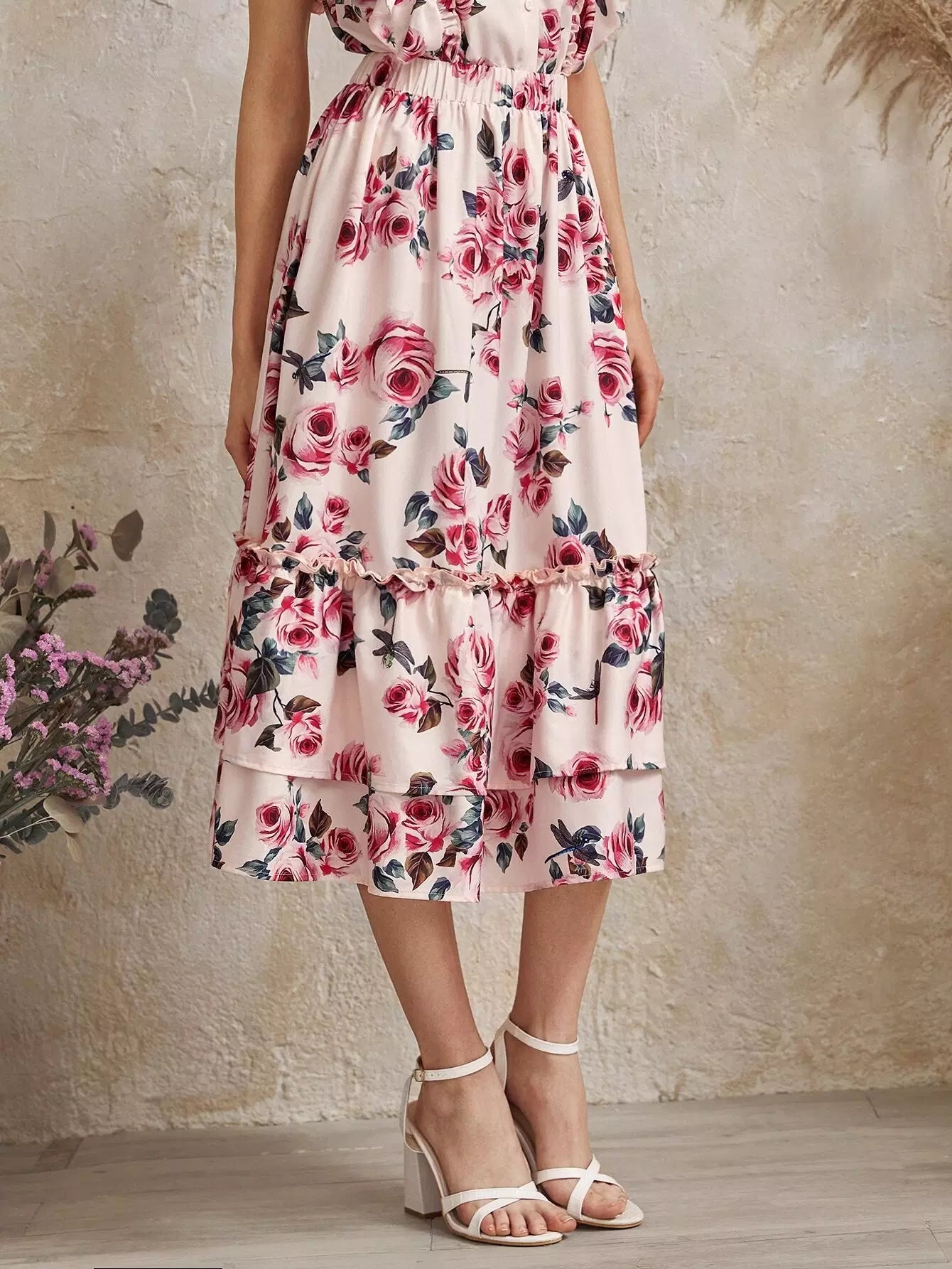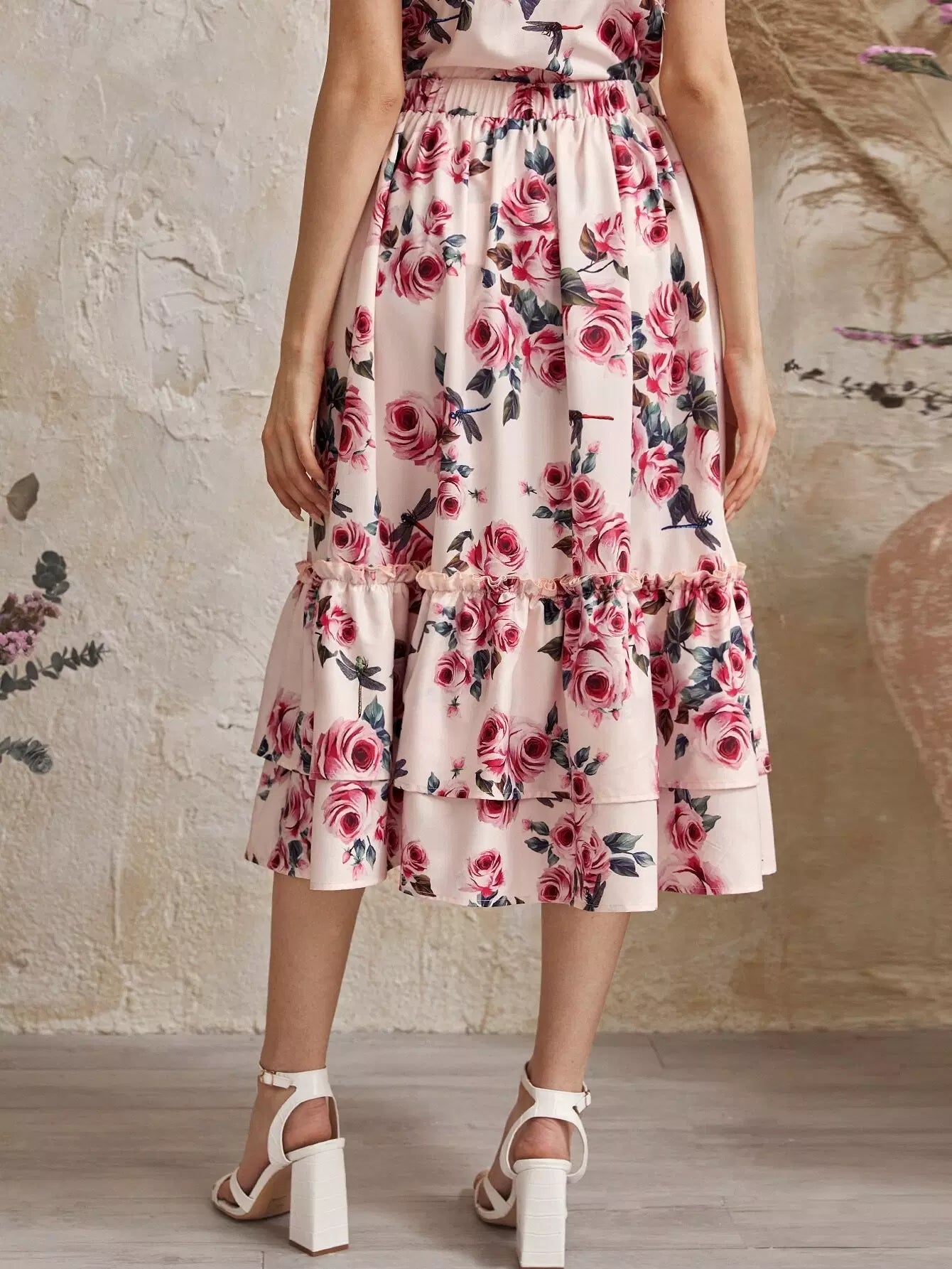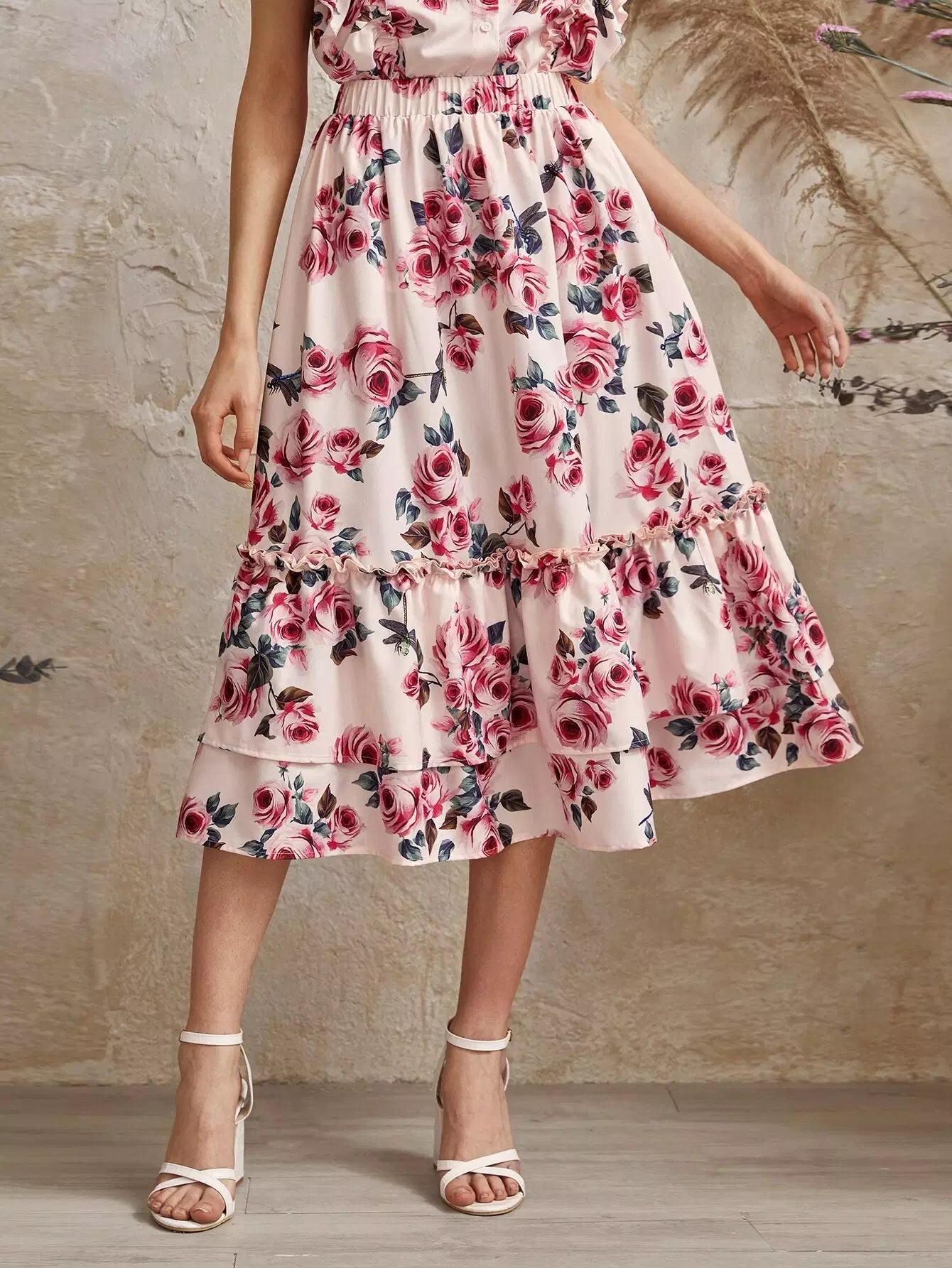 للنساء - تنورة بطبعة زهور وحاشية مكشكشة
