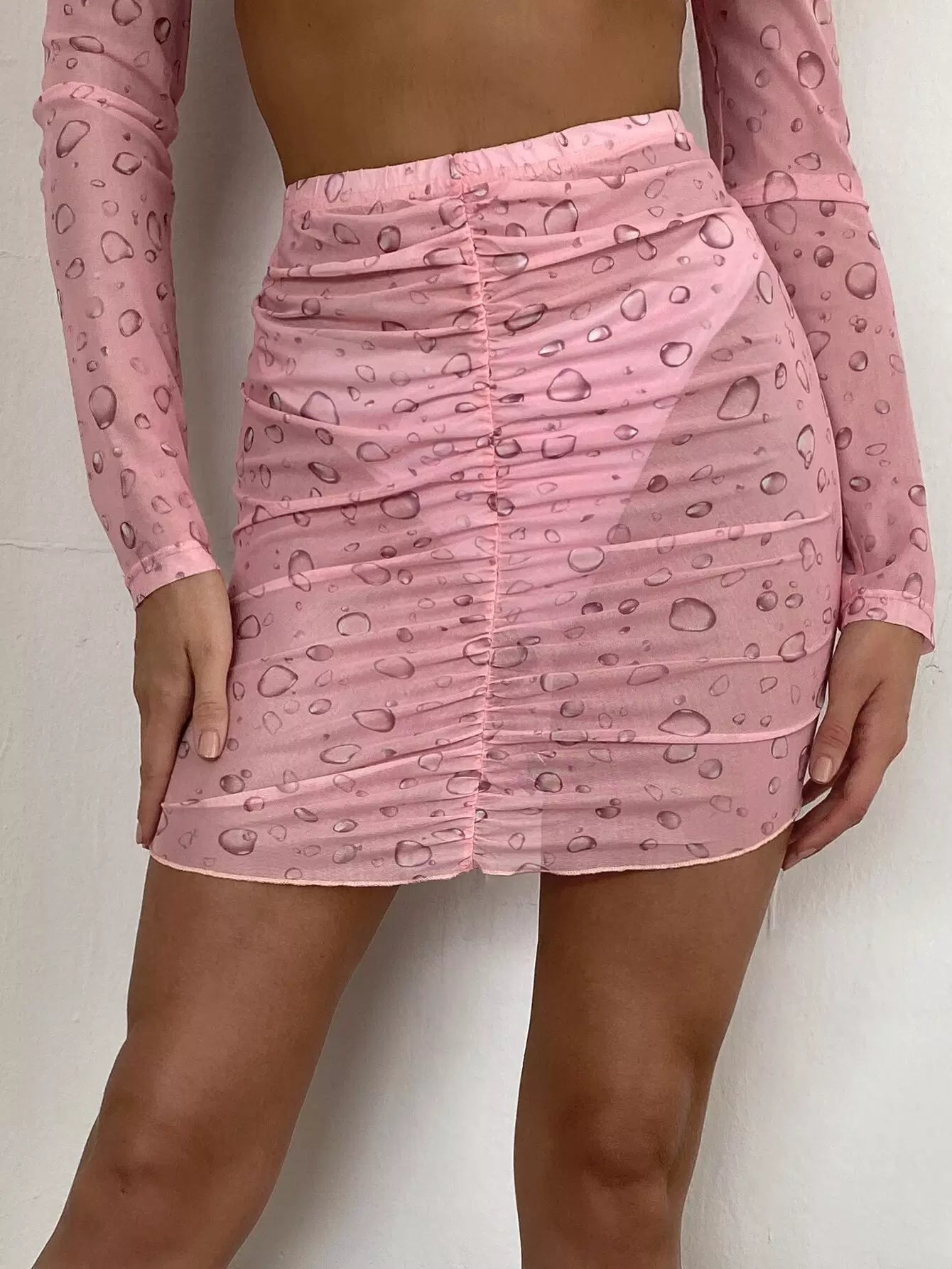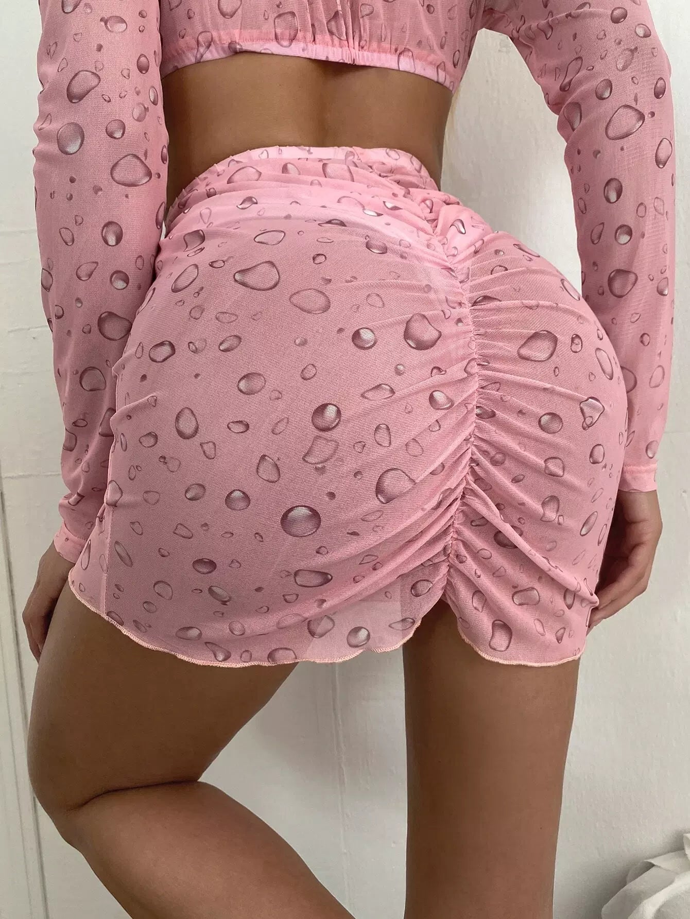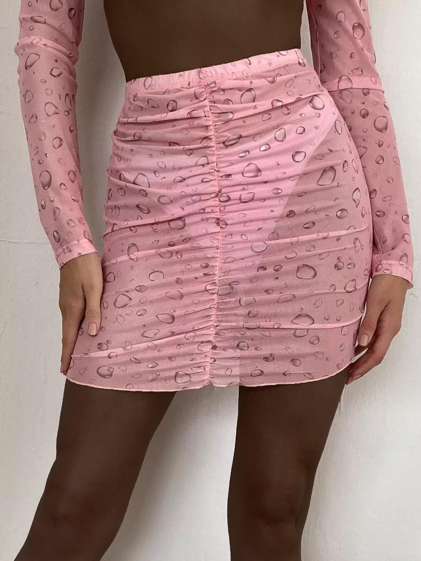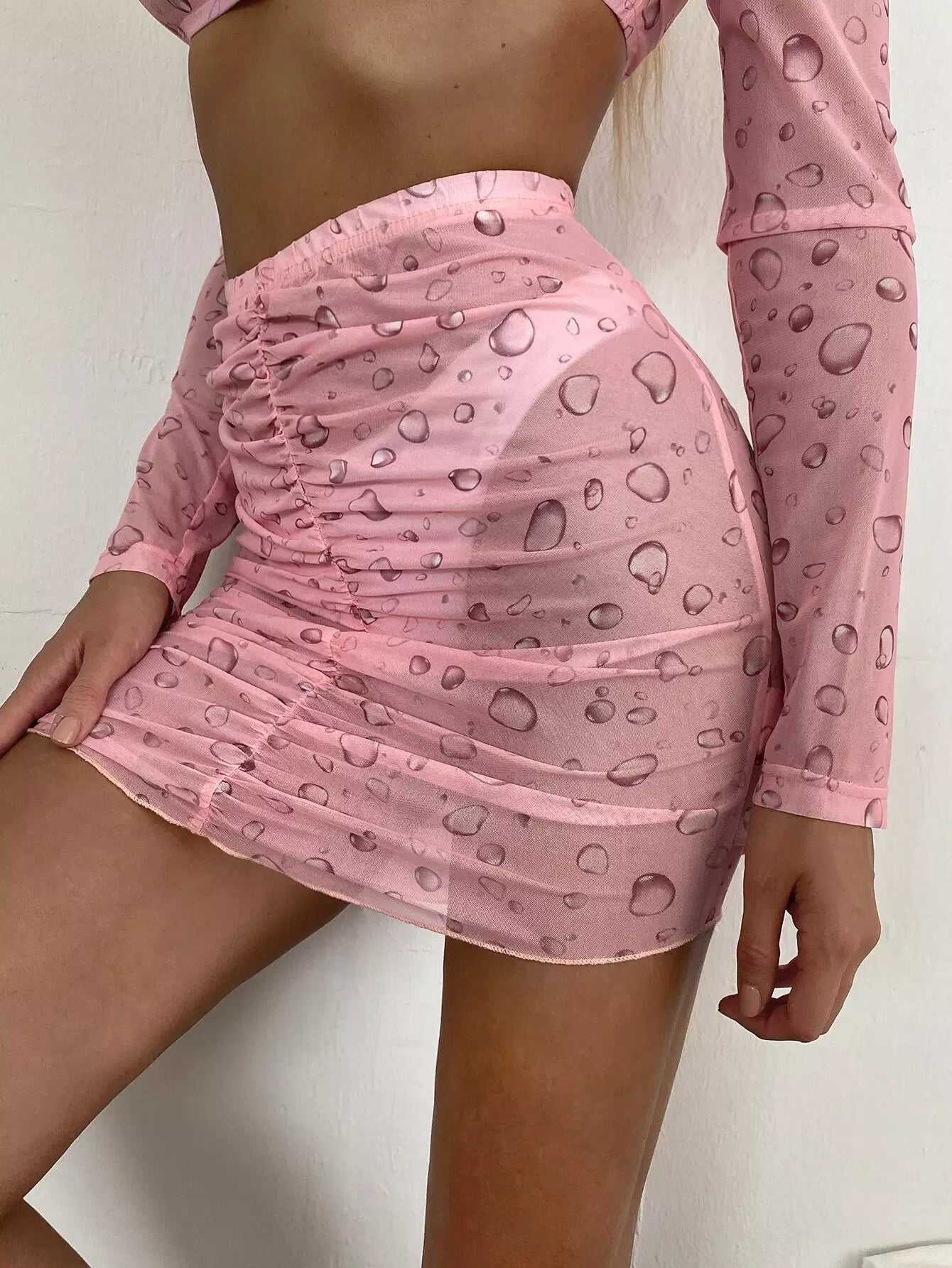 تنورة شبكية شفافة بطبعة جرافيك مكشكشة بدون سروال داخلي