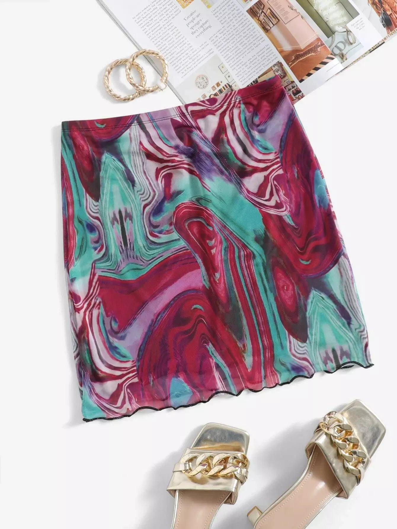للنساء - تنورة قصيرة شبكية بطبعات رخامية وحواف خس