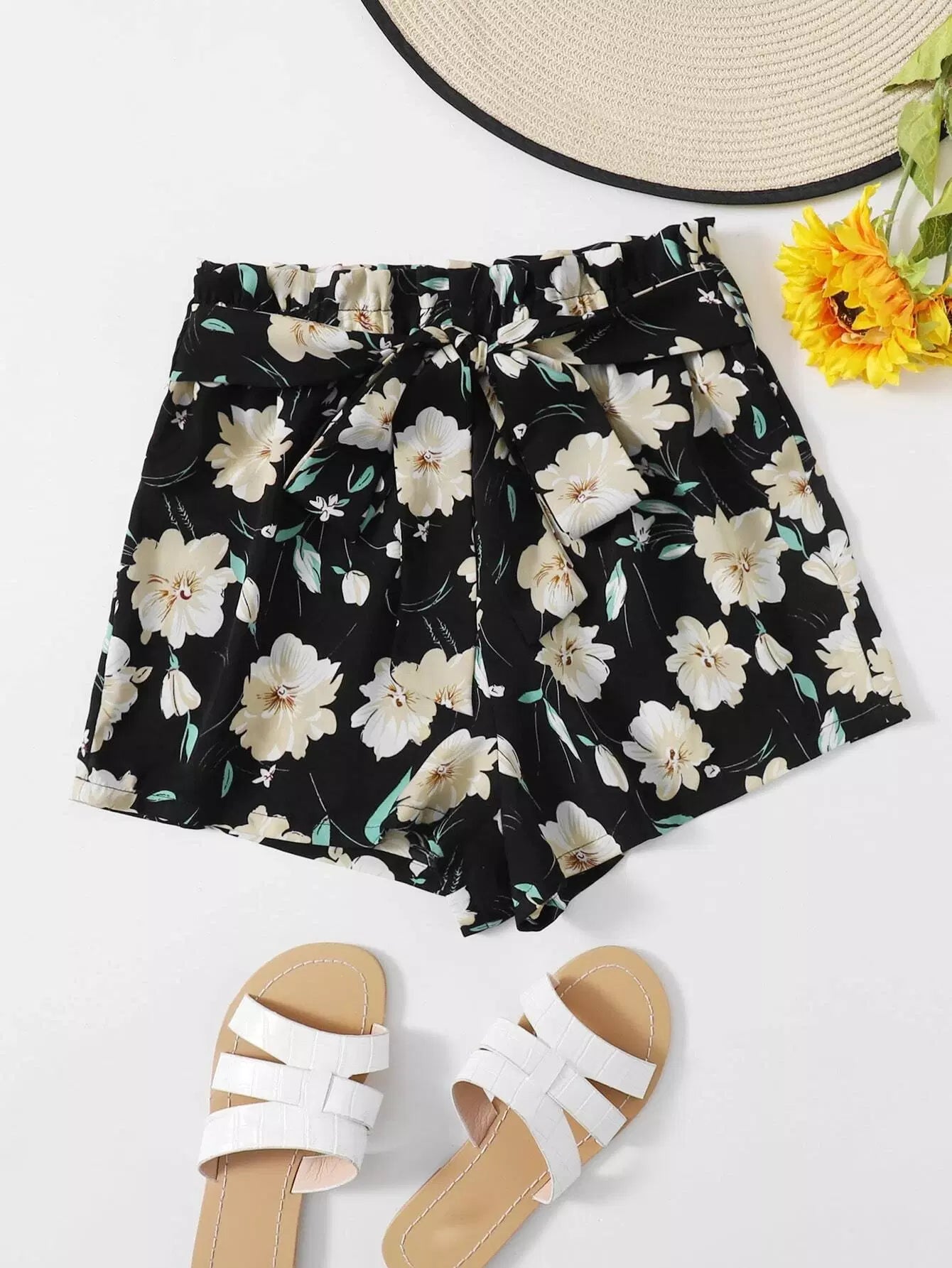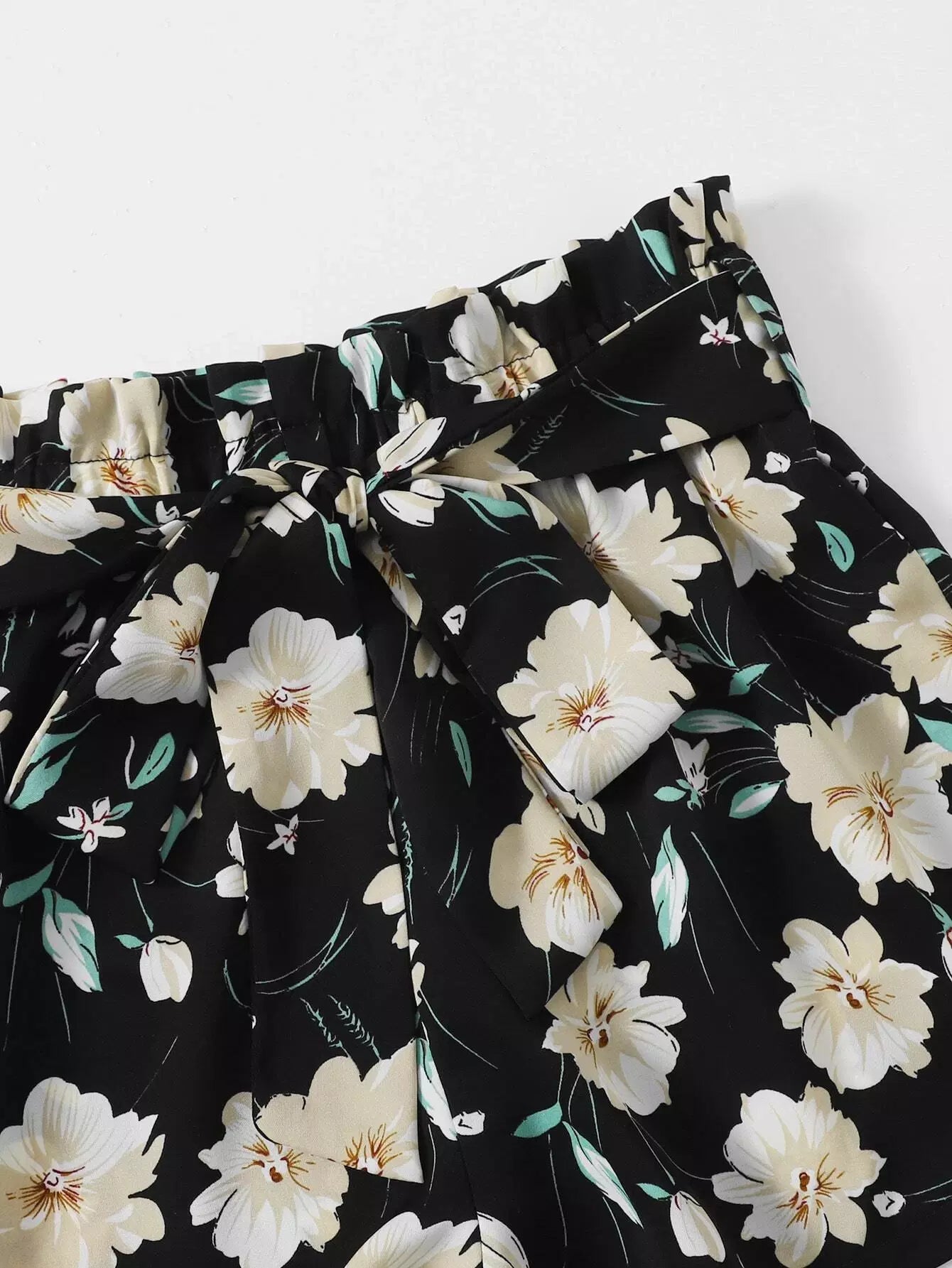 Paperbag الخصر الأزهار السراويل دون حزام
