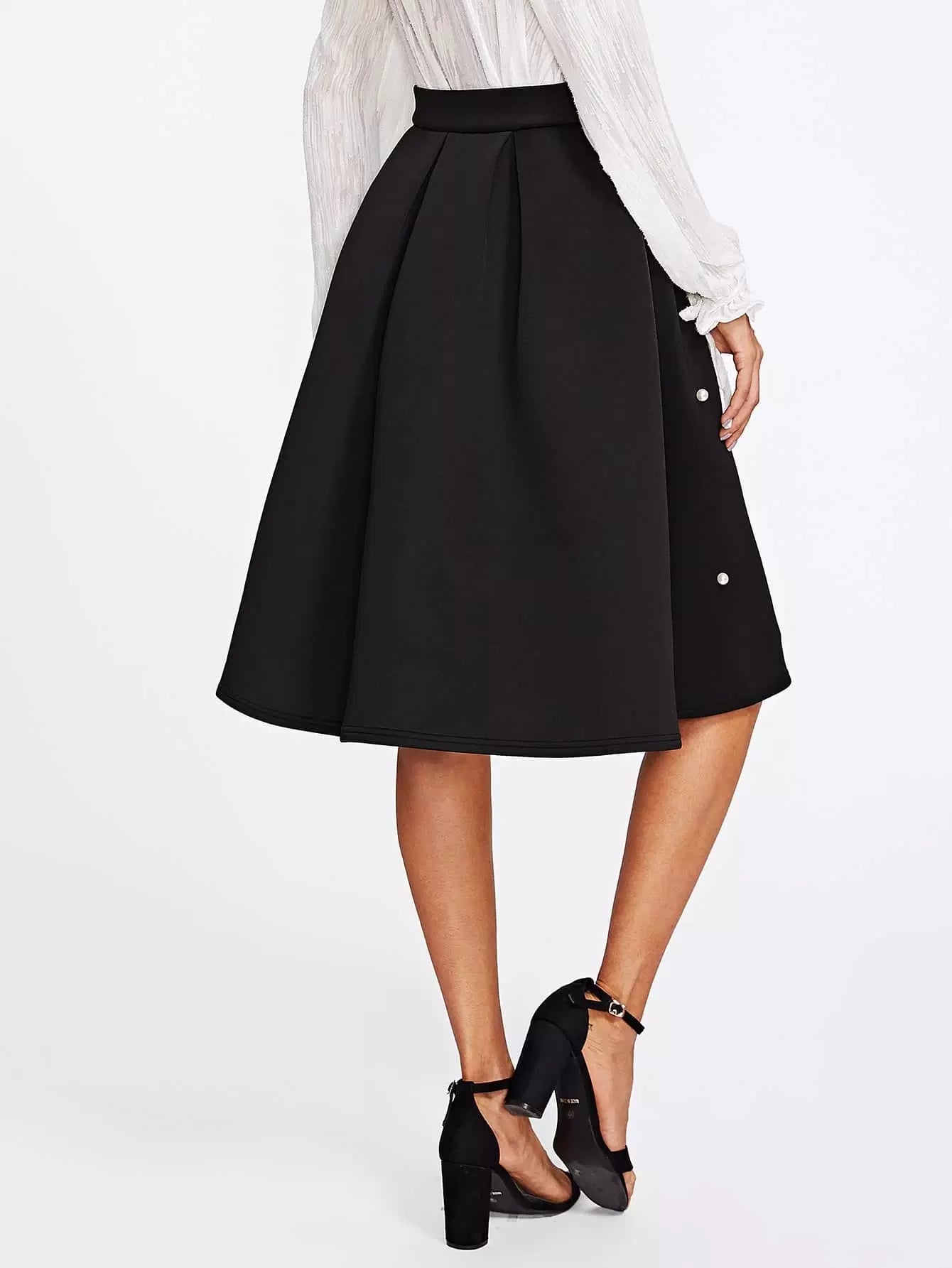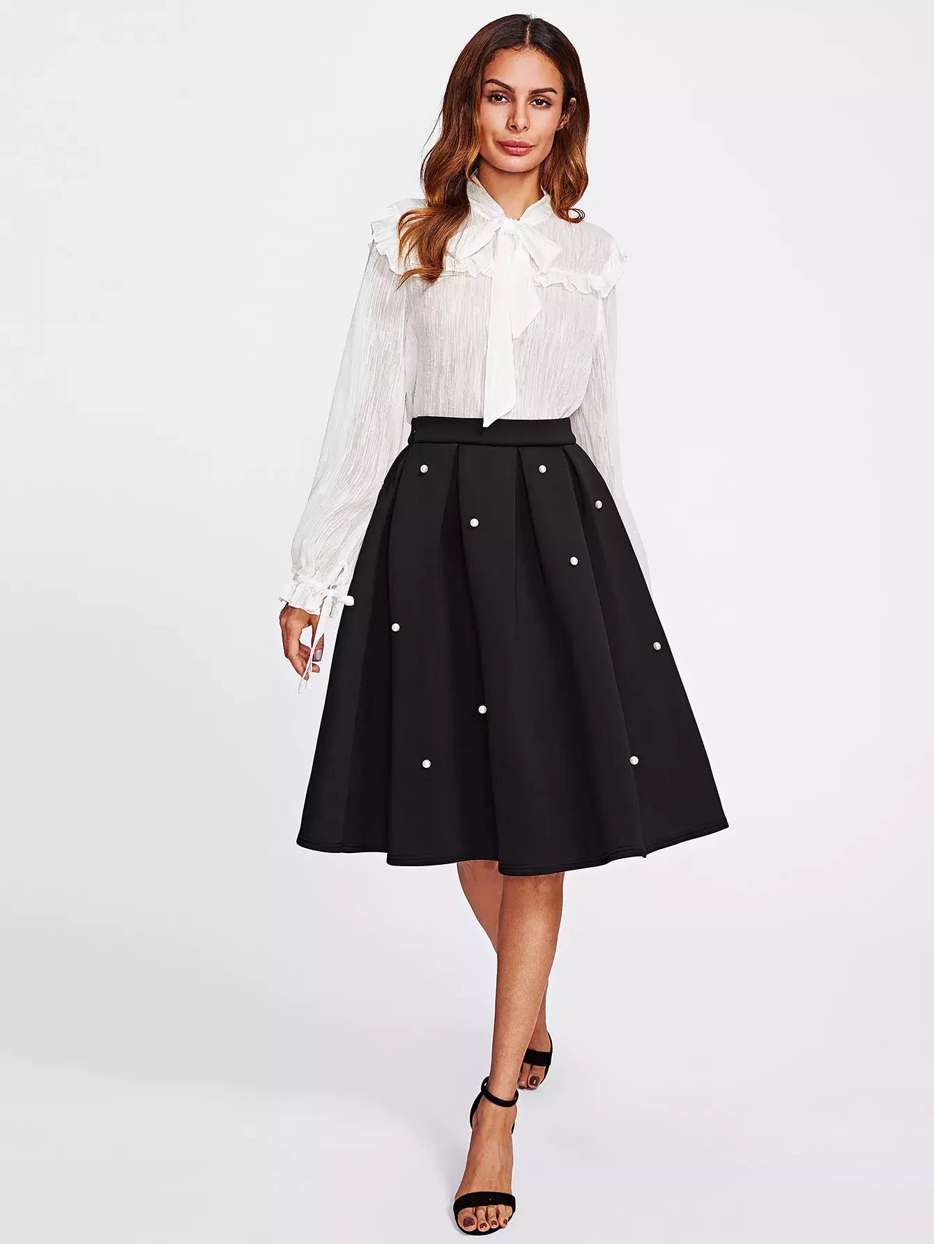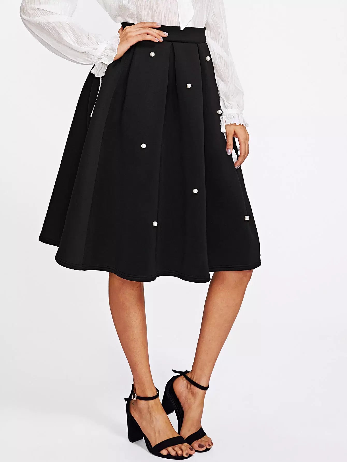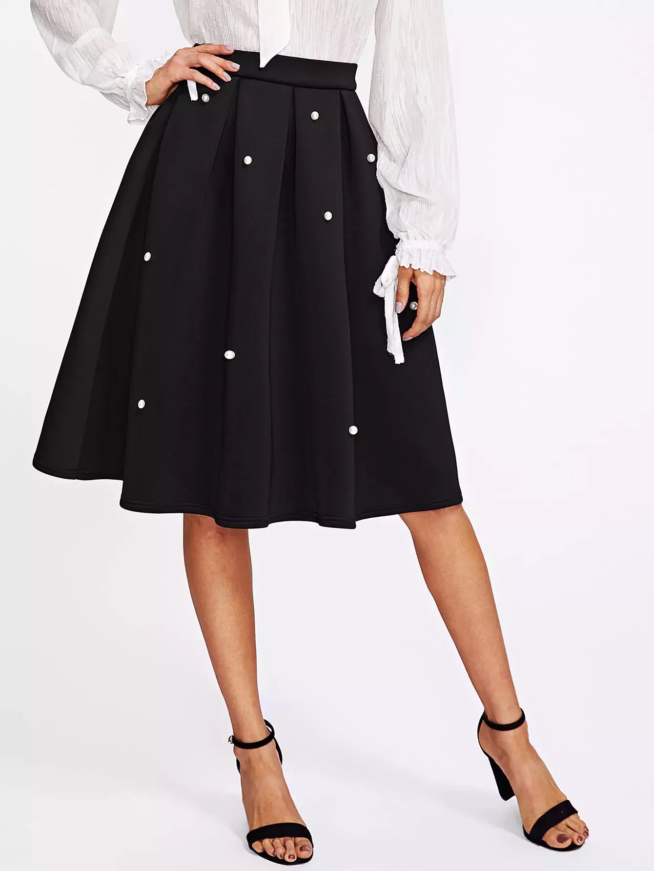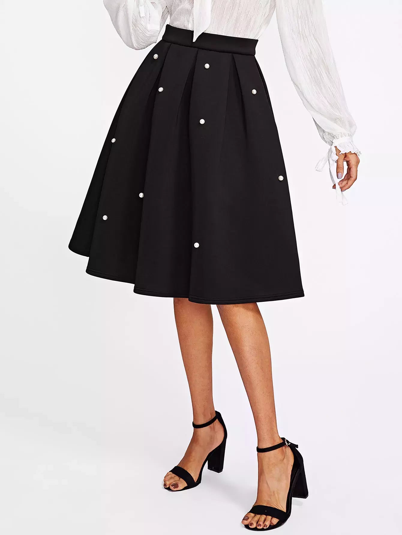 تنورة دائرية دائرية مطوية مزينة باللؤلؤ ومزينة باللؤلؤ