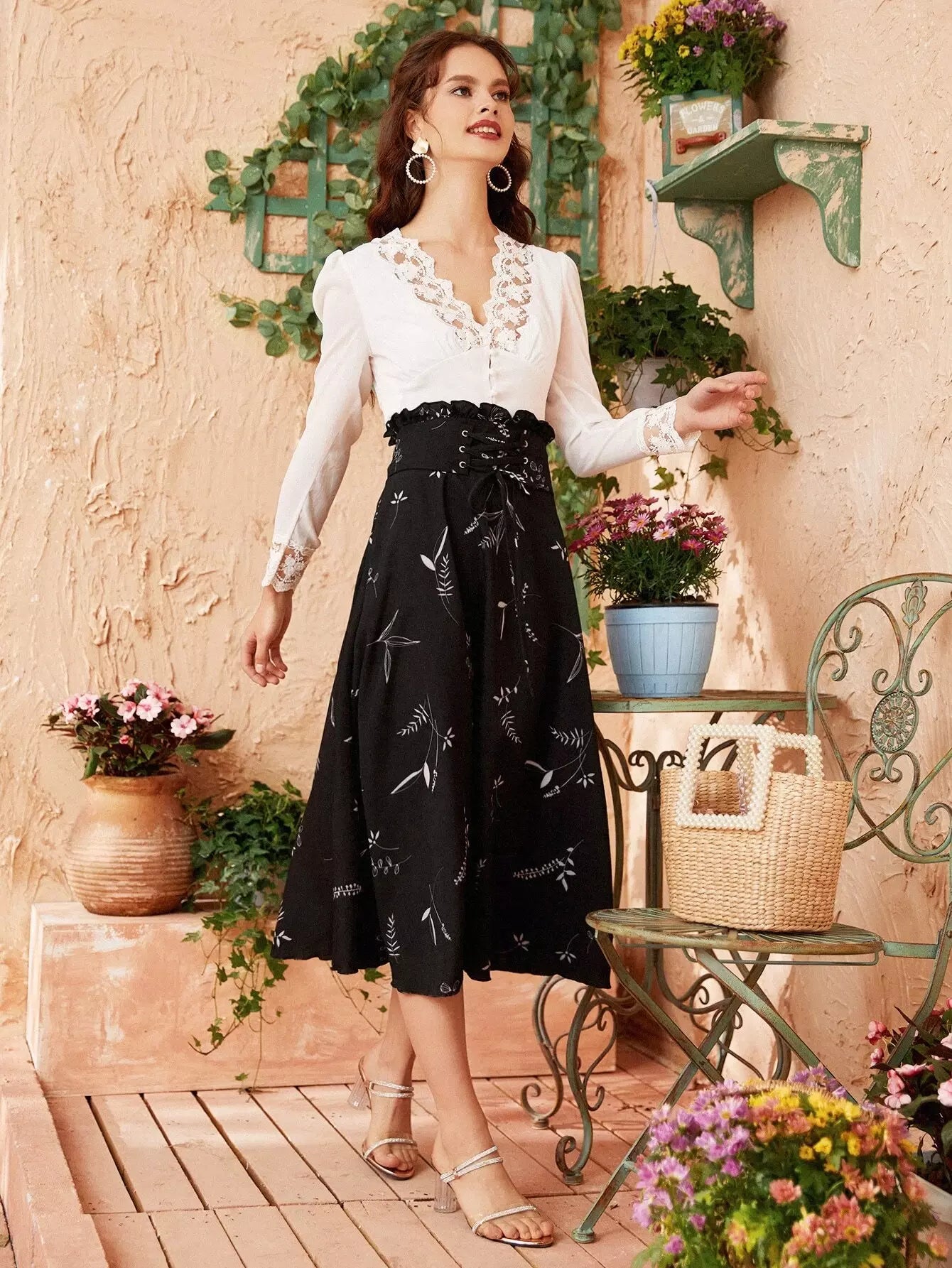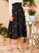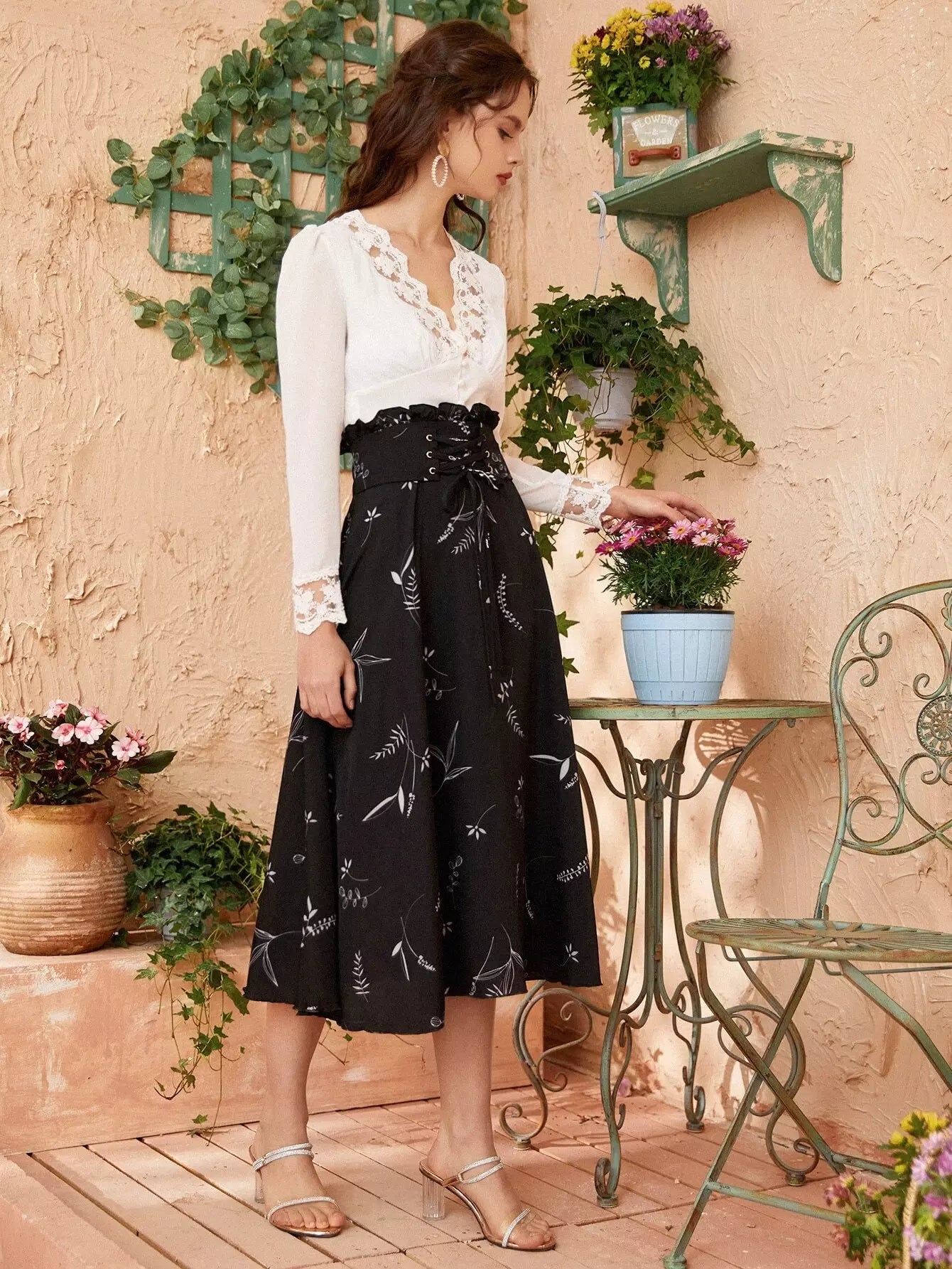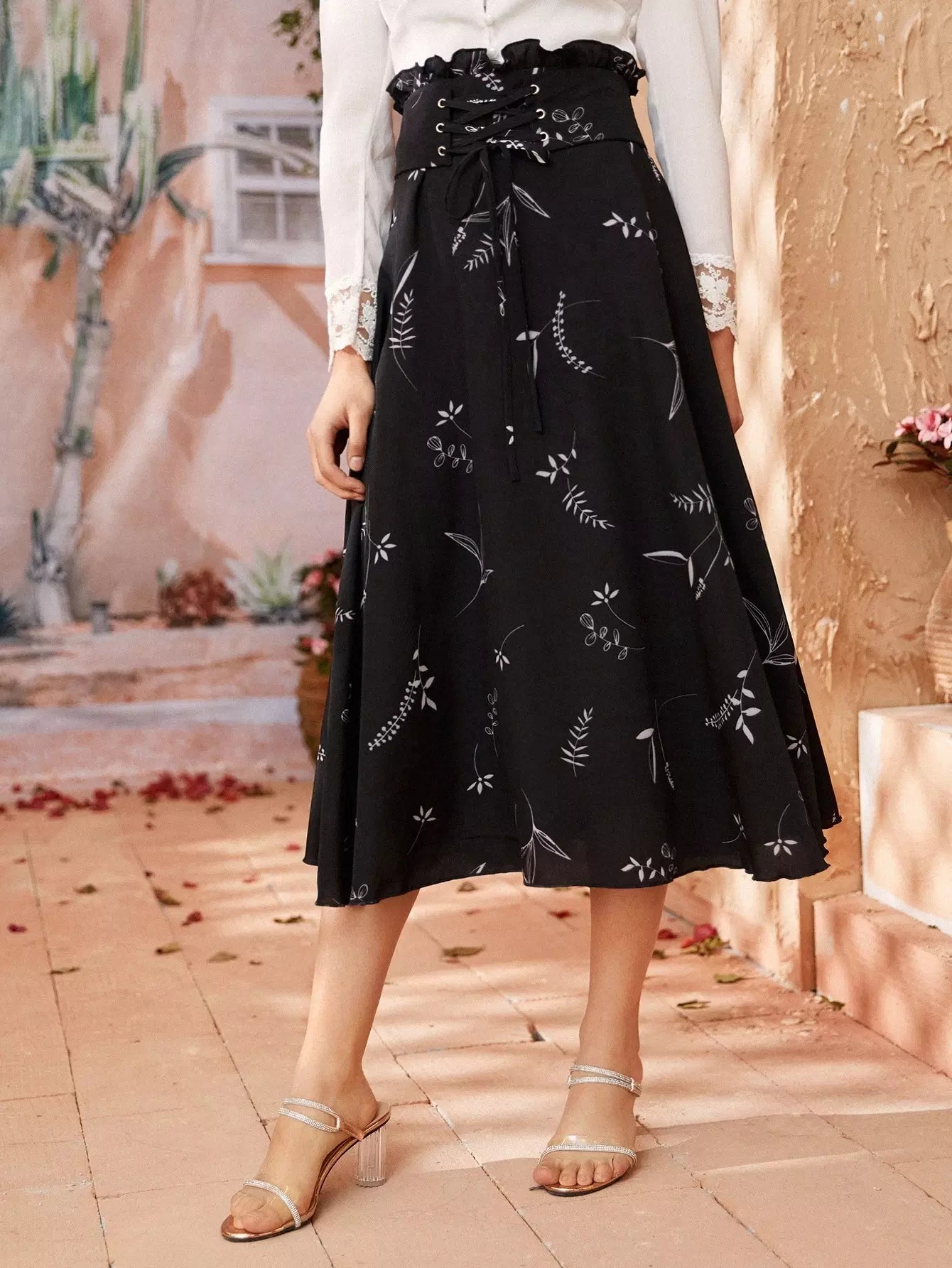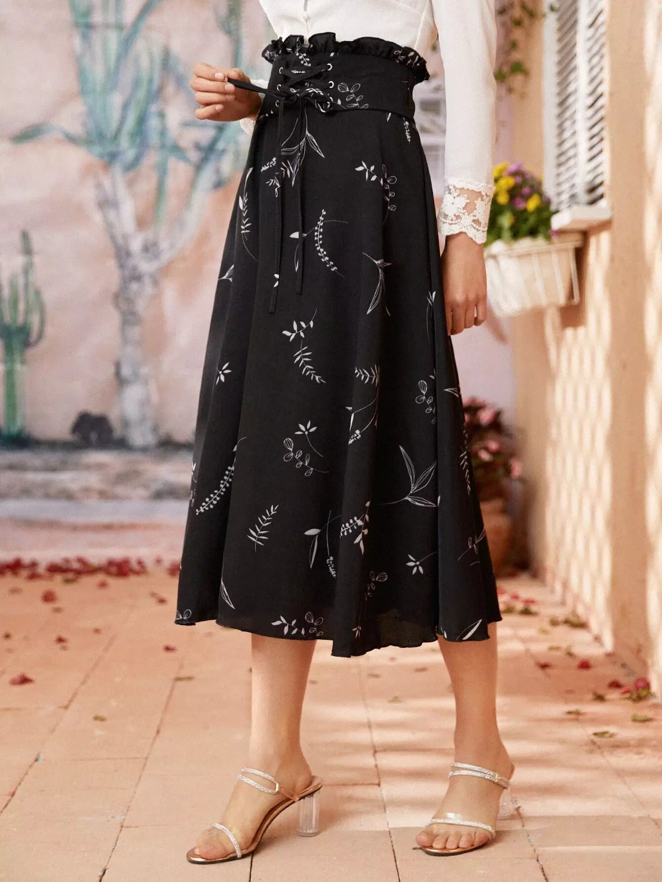 تنورة خصر من الدانتيل مطبوع عليها نباتات بأربطة على شكل كيس ورقي