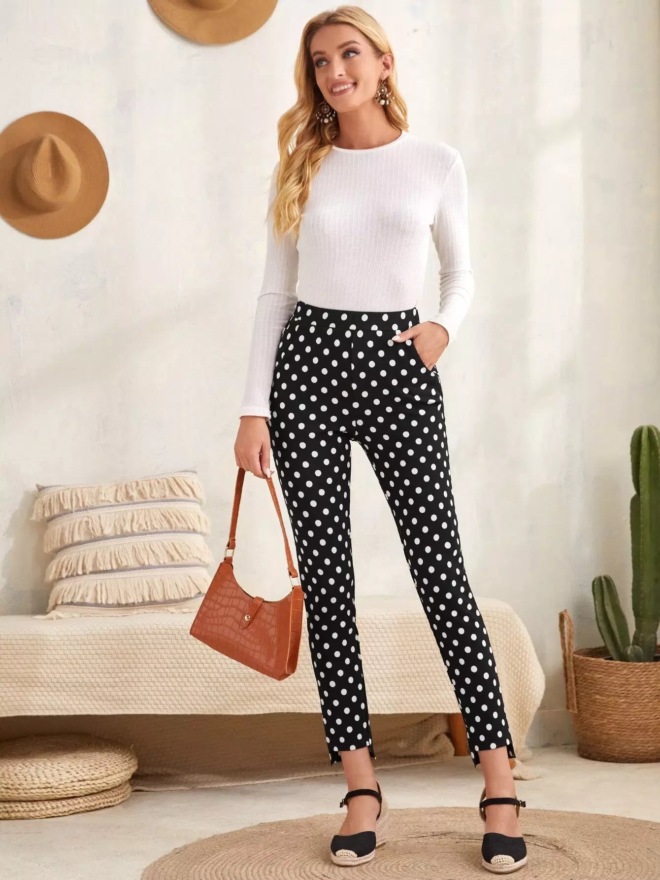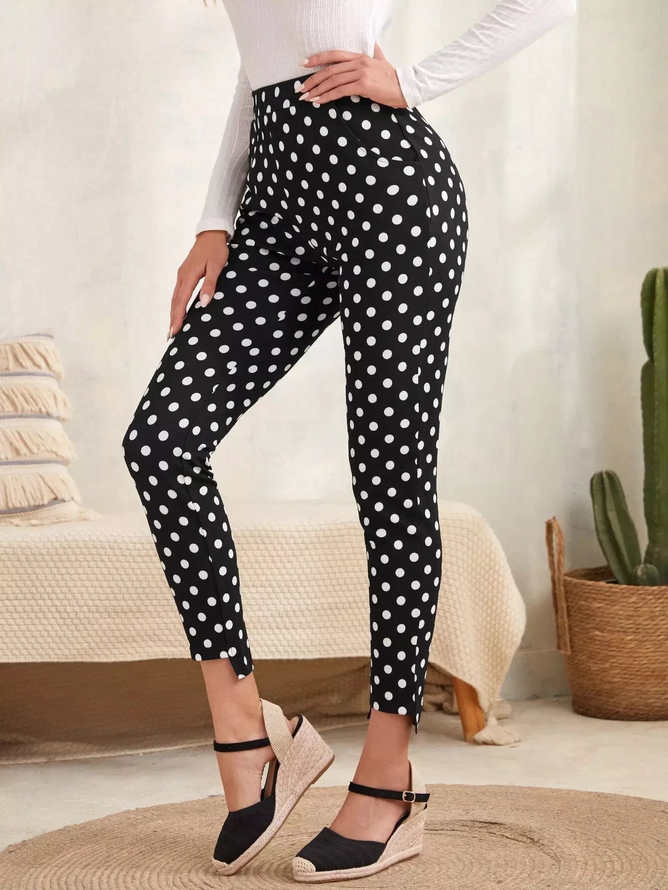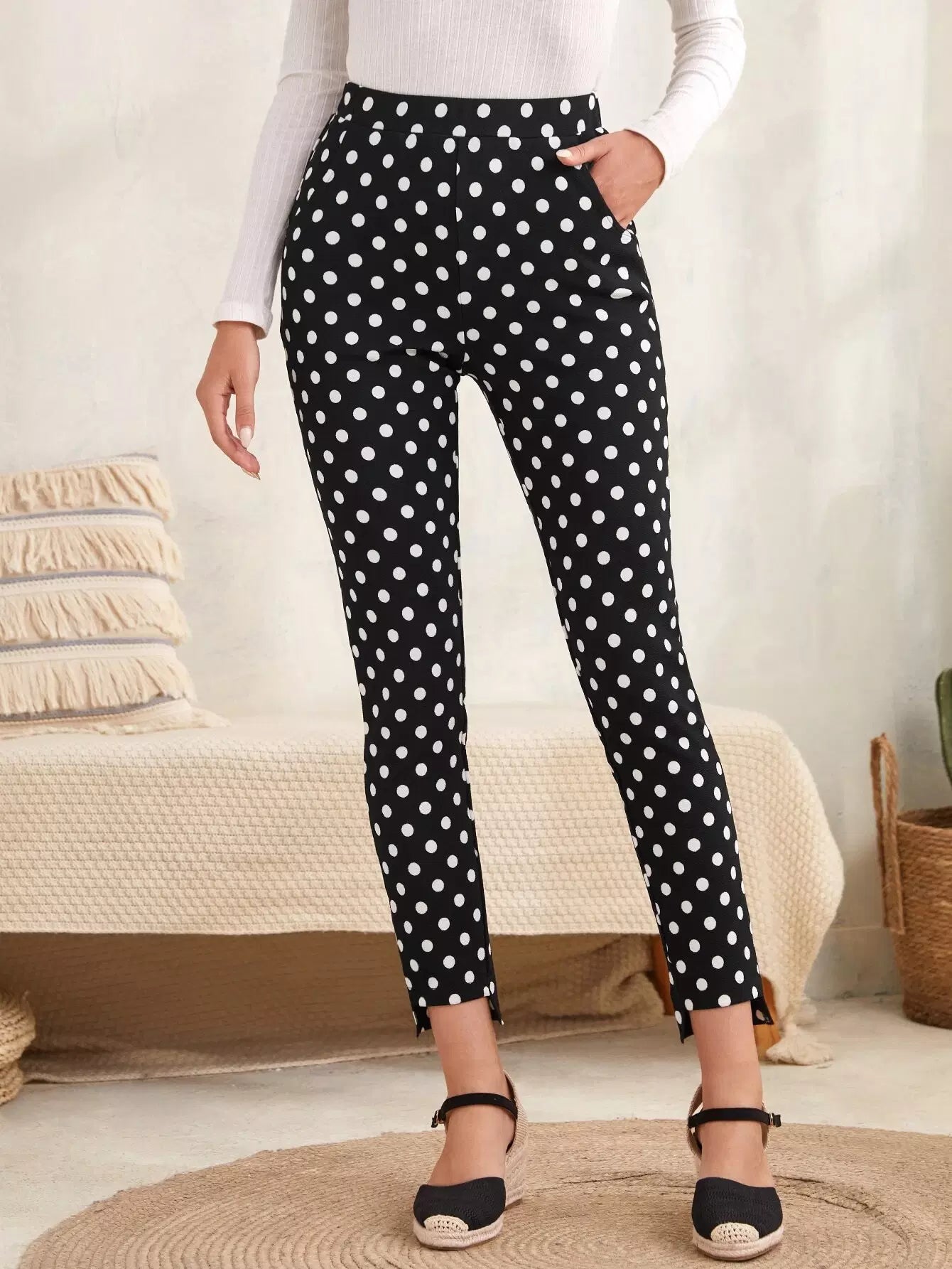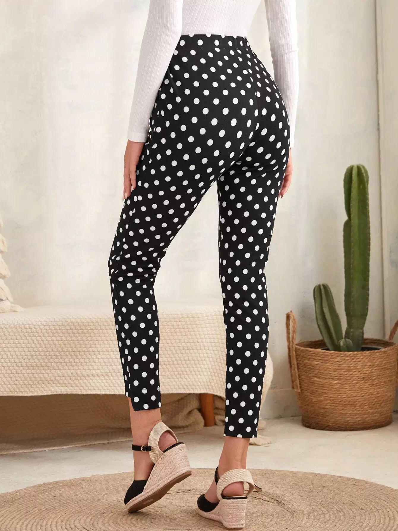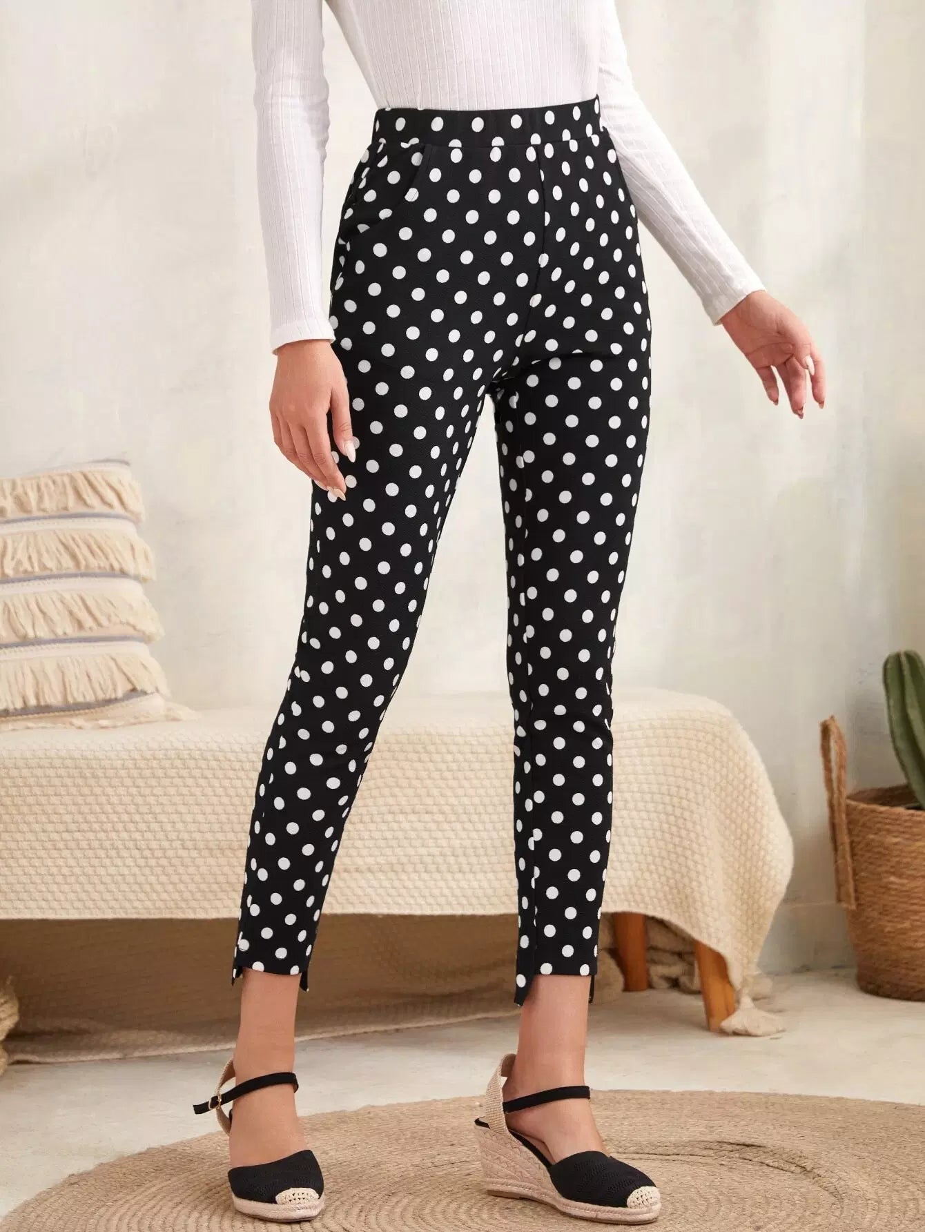بنطال ضيق منقوش بنقاط البولكا وحاشية مرتفعة ومنخفضة