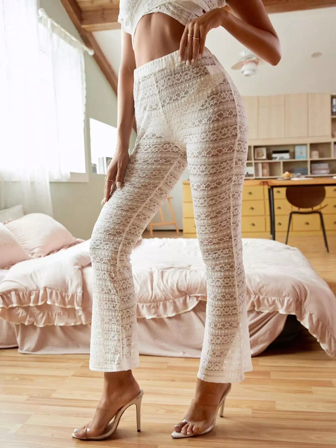 بنطلون شفاف من الدانتيل المطاطي بخصر مطاطي واسع الساقين