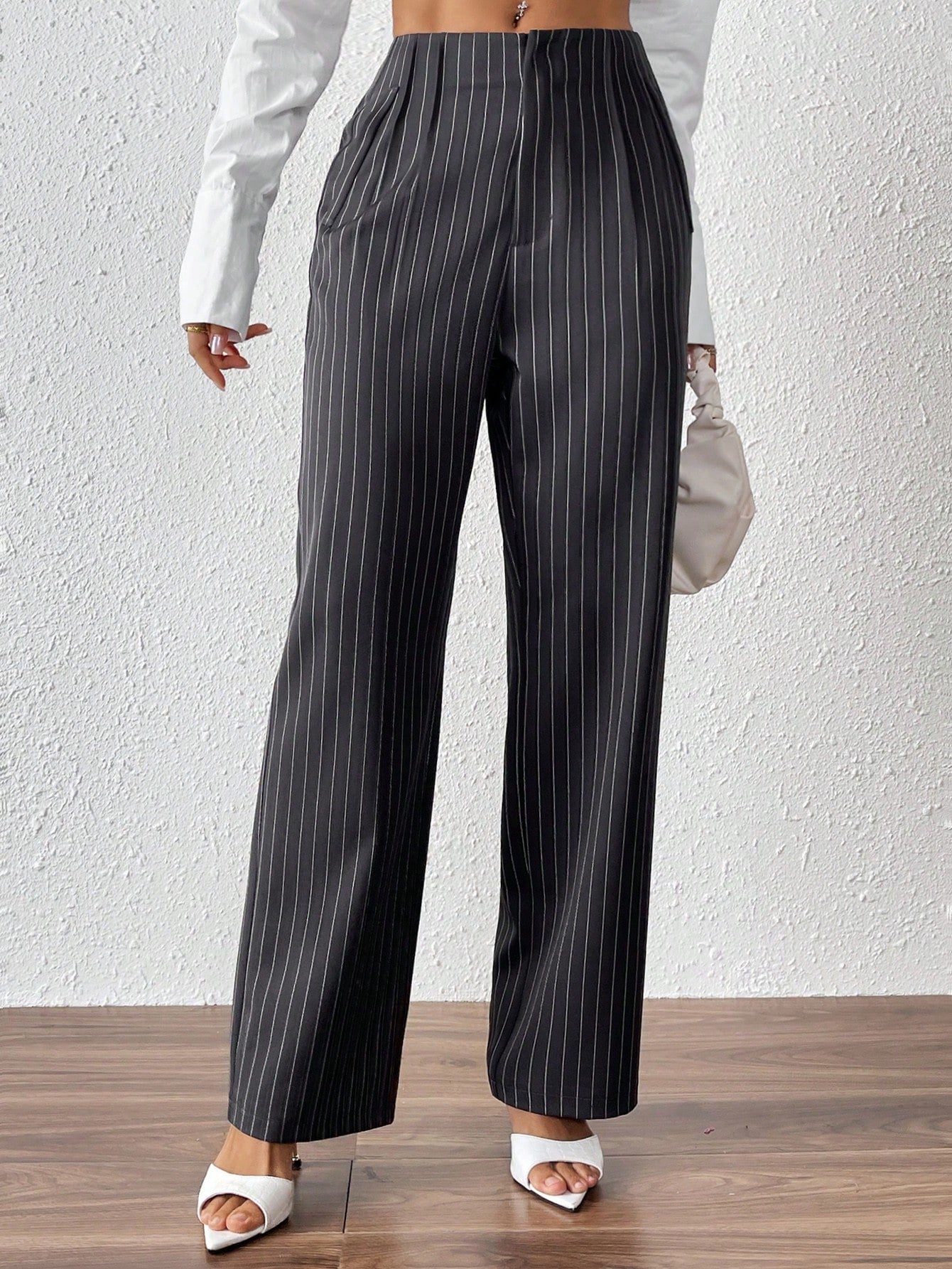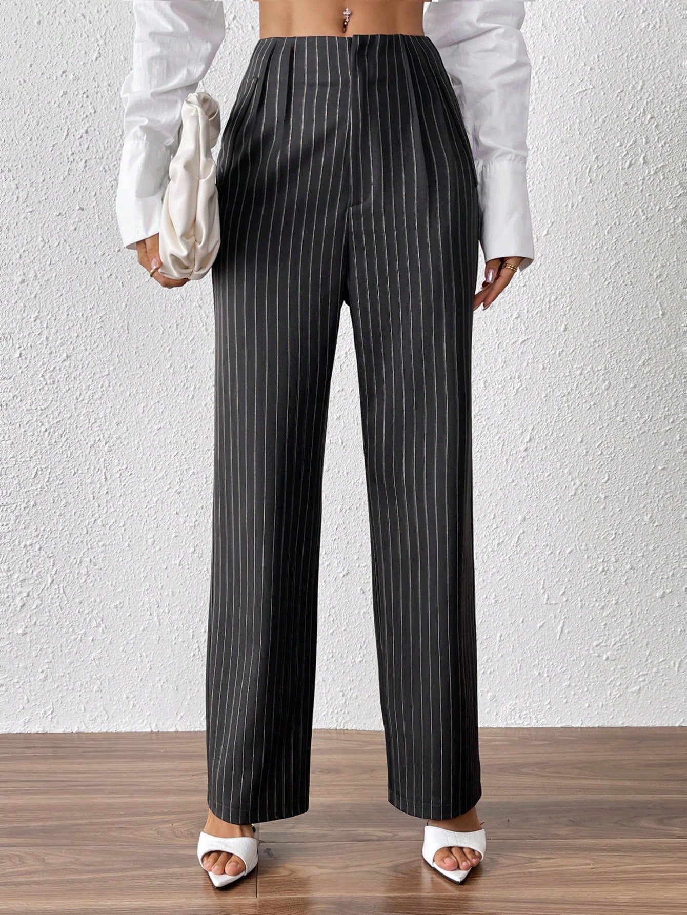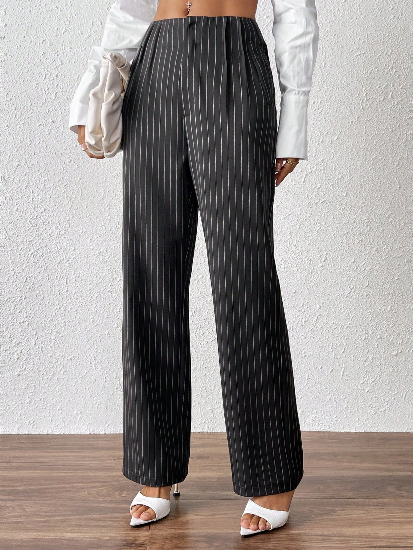 بنطلون نسائي فضفاض مخطط بساق مستقيمة من SHEIN PETITE مناسب للعمل/المناسبات غير الرسمية