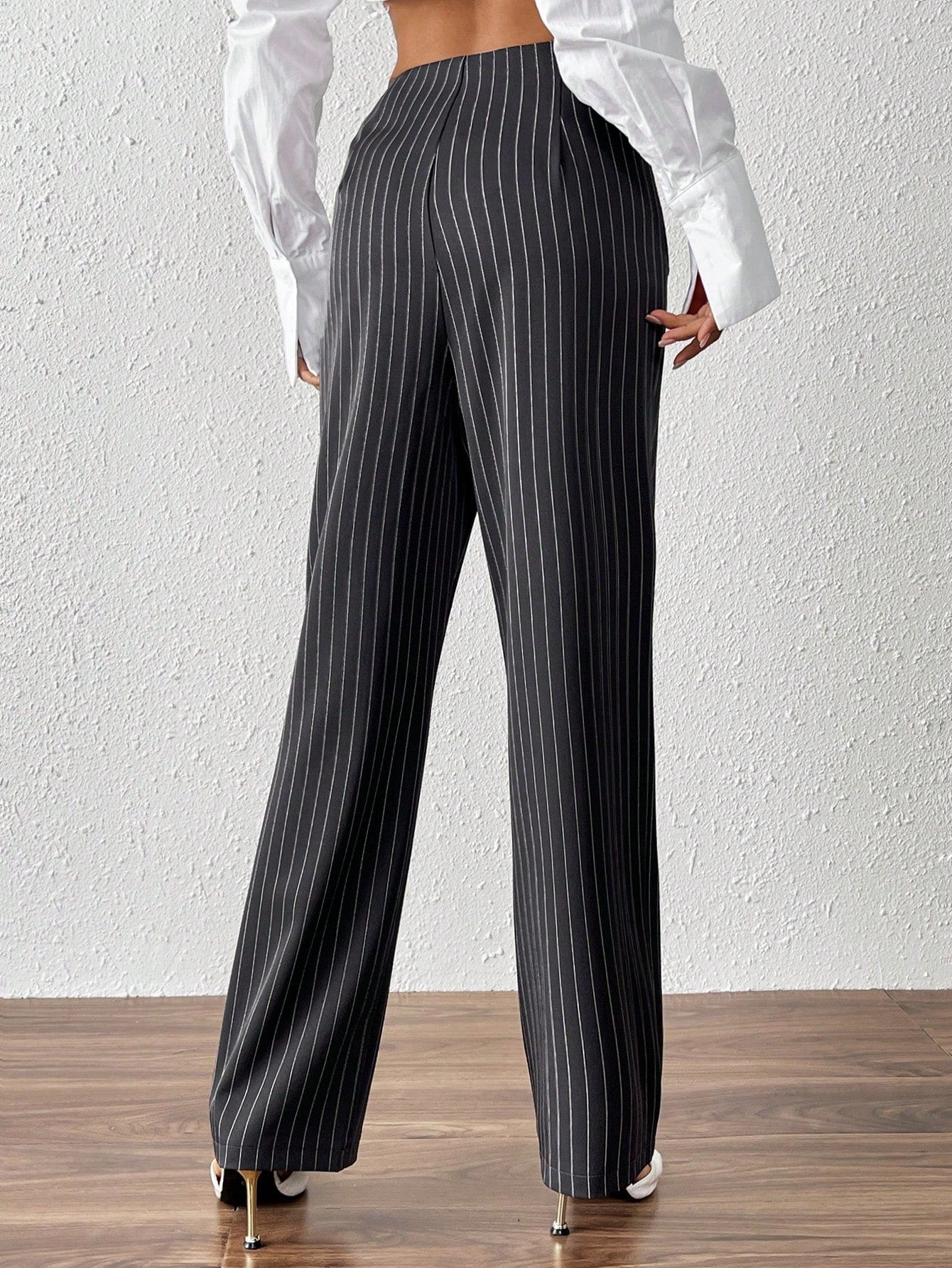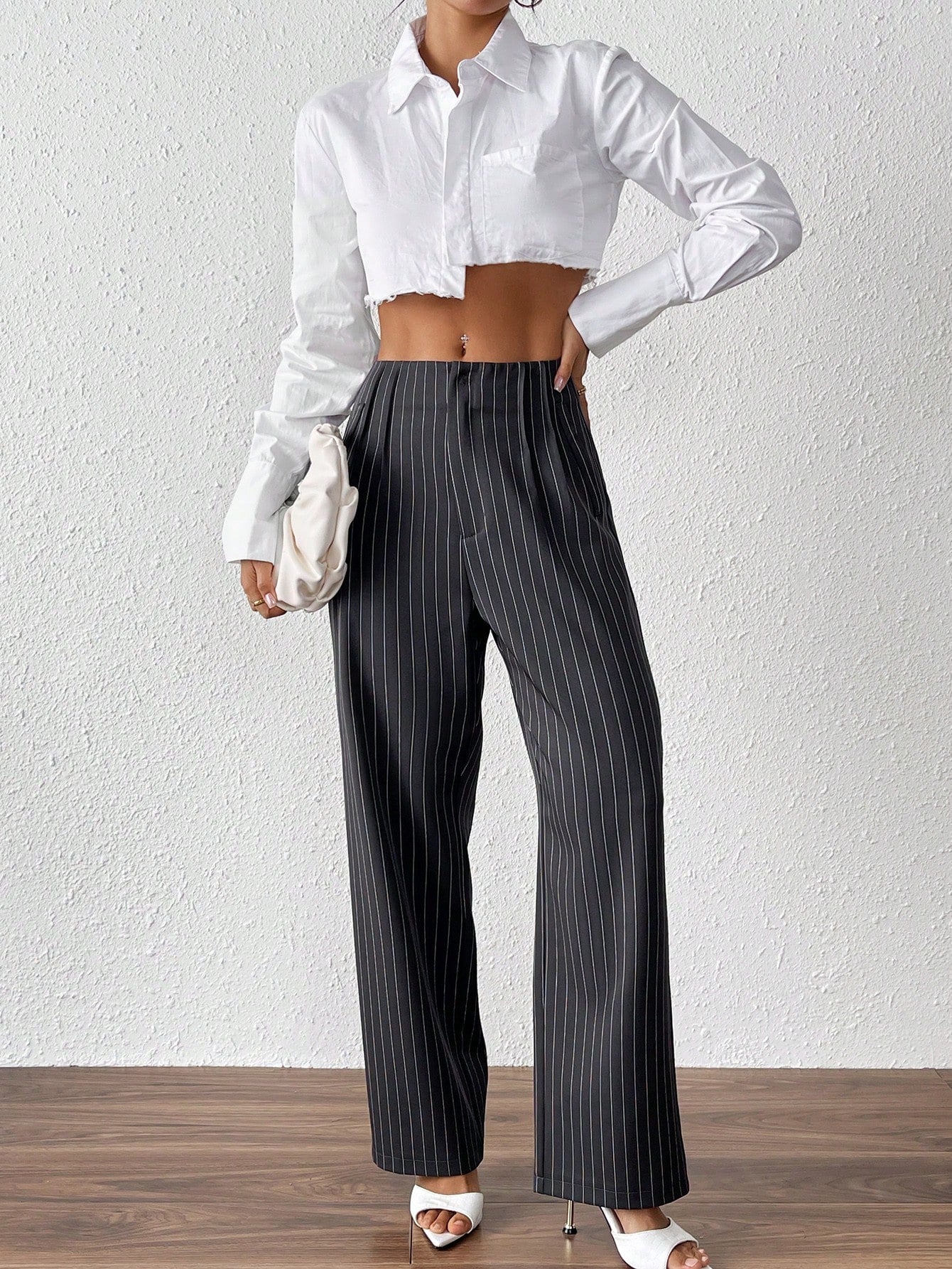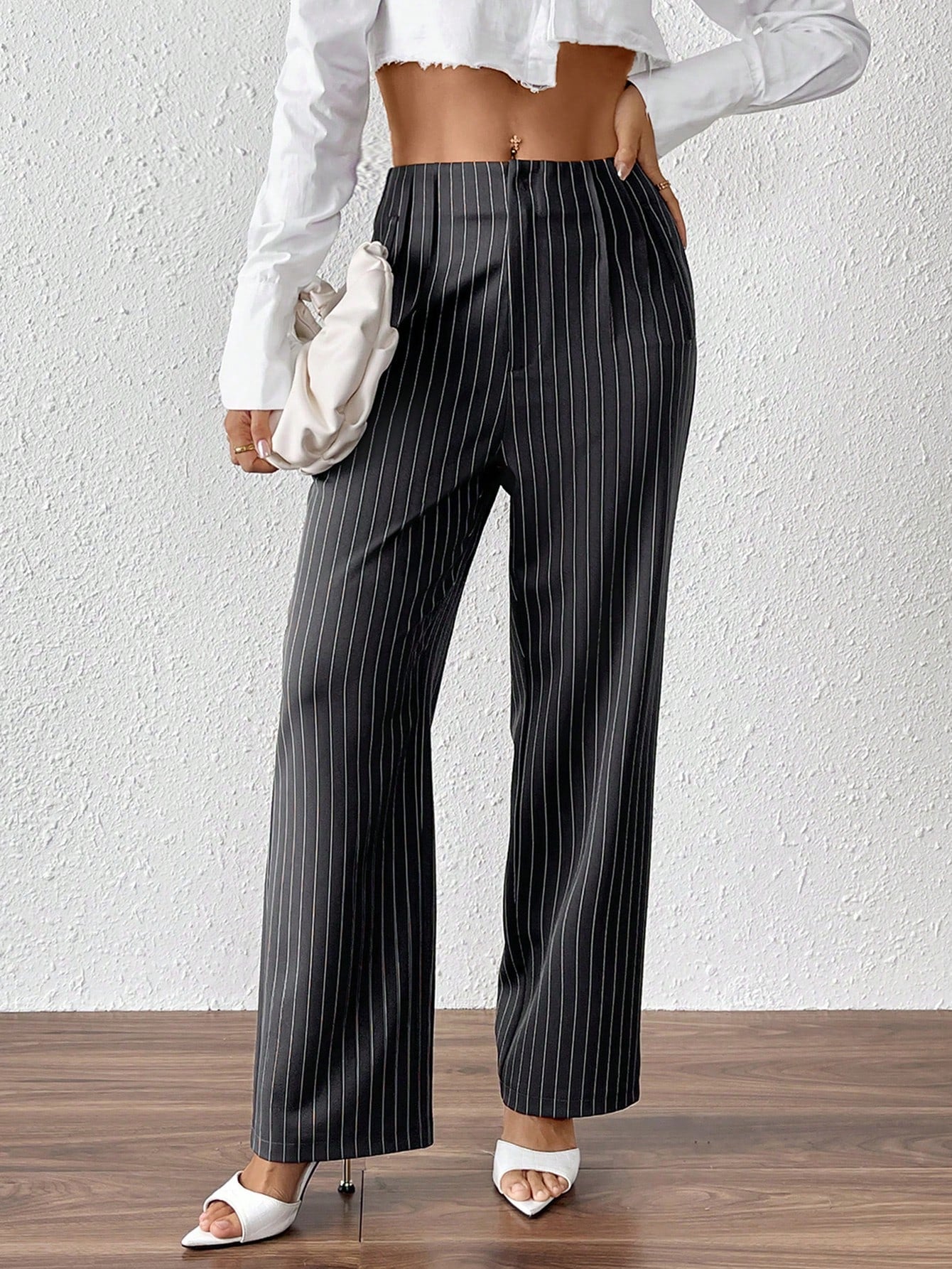 بنطلون نسائي فضفاض مخطط بساق مستقيمة من SHEIN PETITE مناسب للعمل/المناسبات غير الرسمية