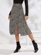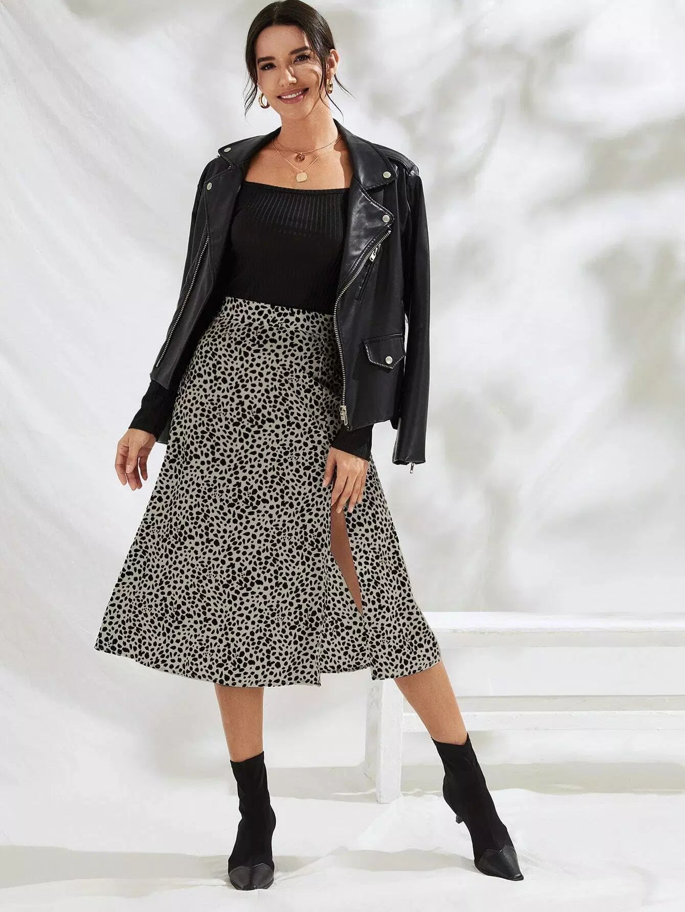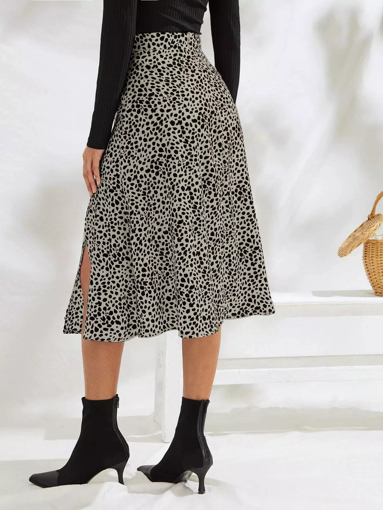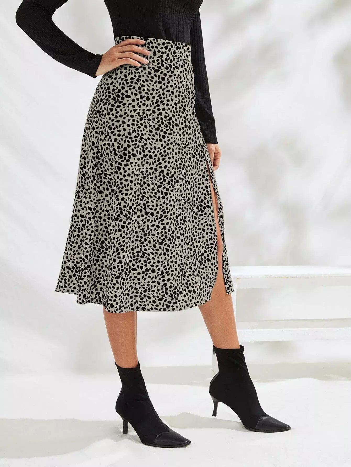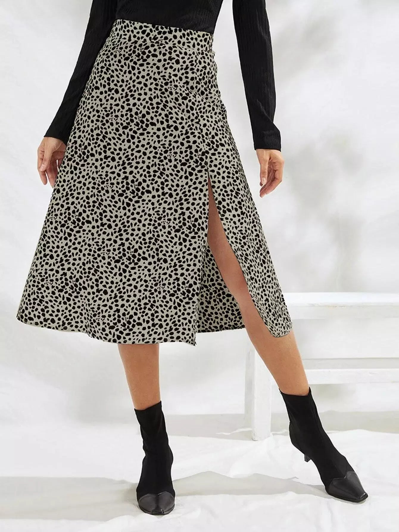 تنورة متوسطة الطول بطبعة مرقطة منقسمة الفخذين على شكل حرف A