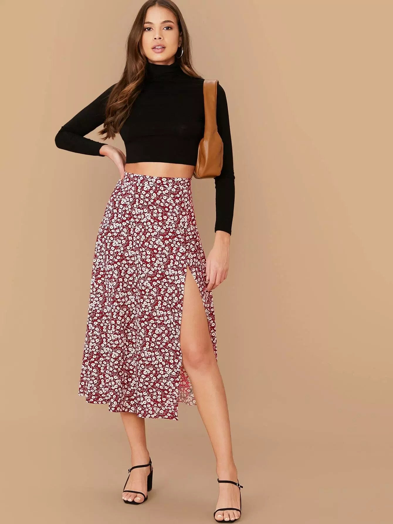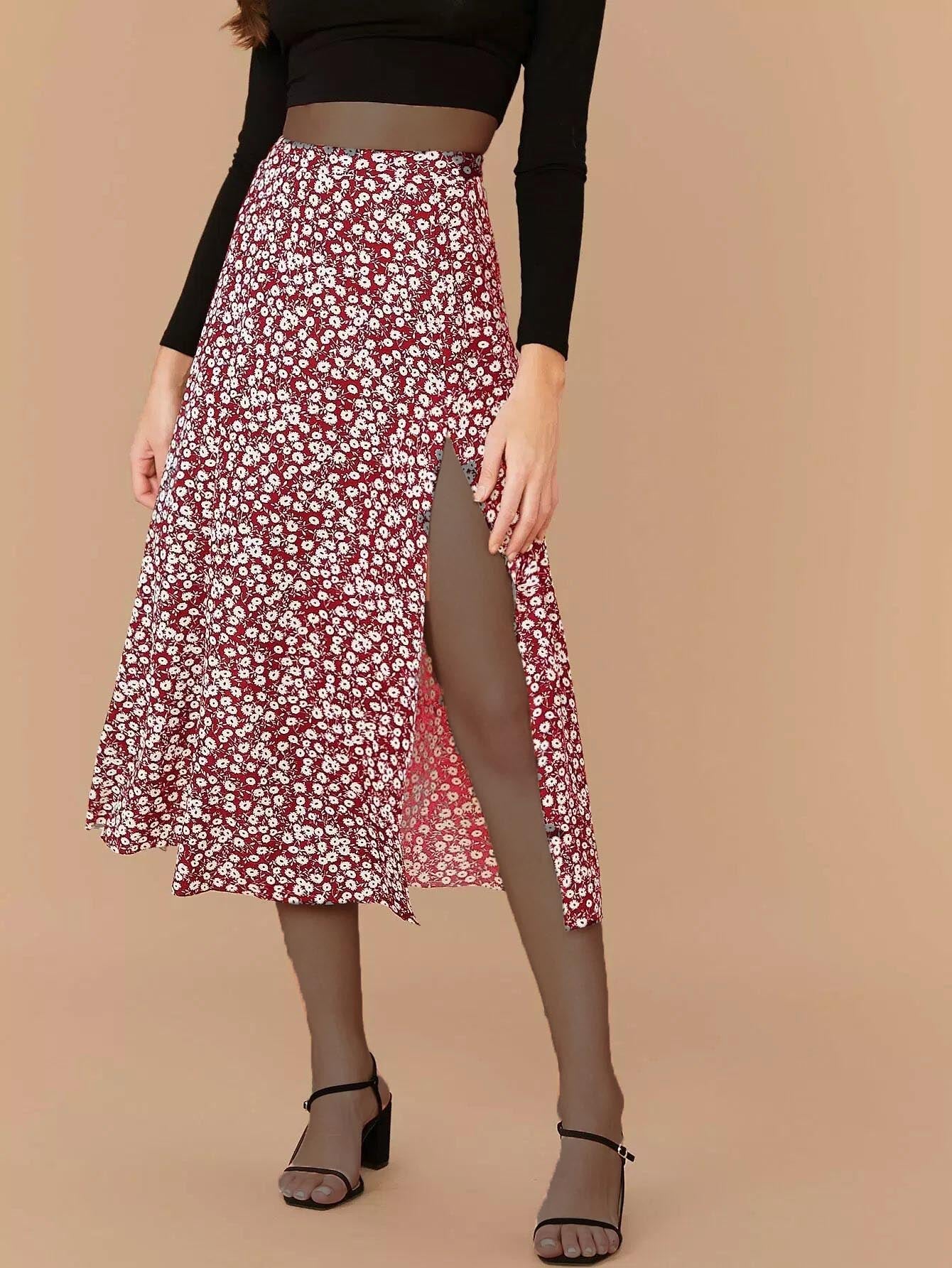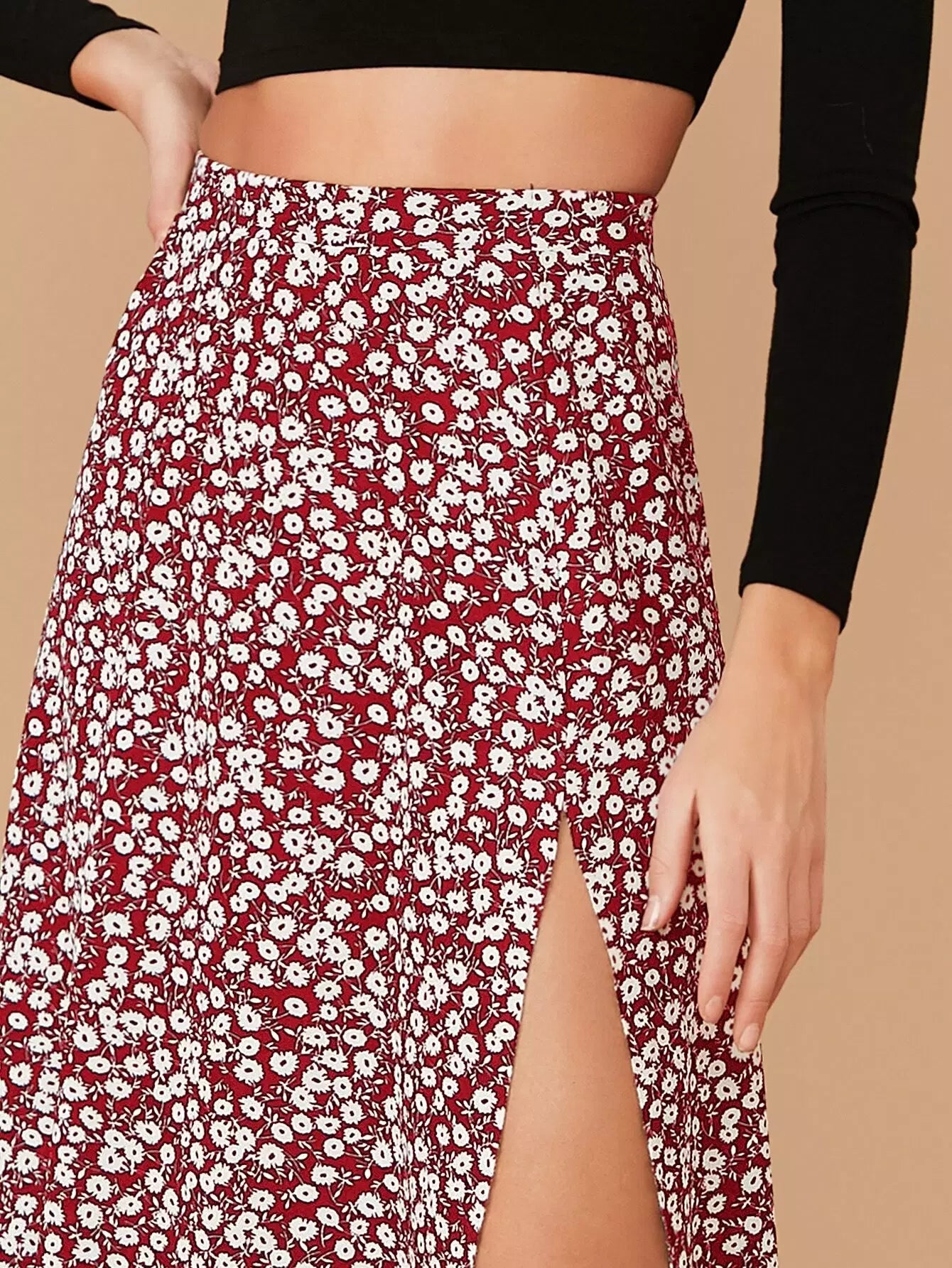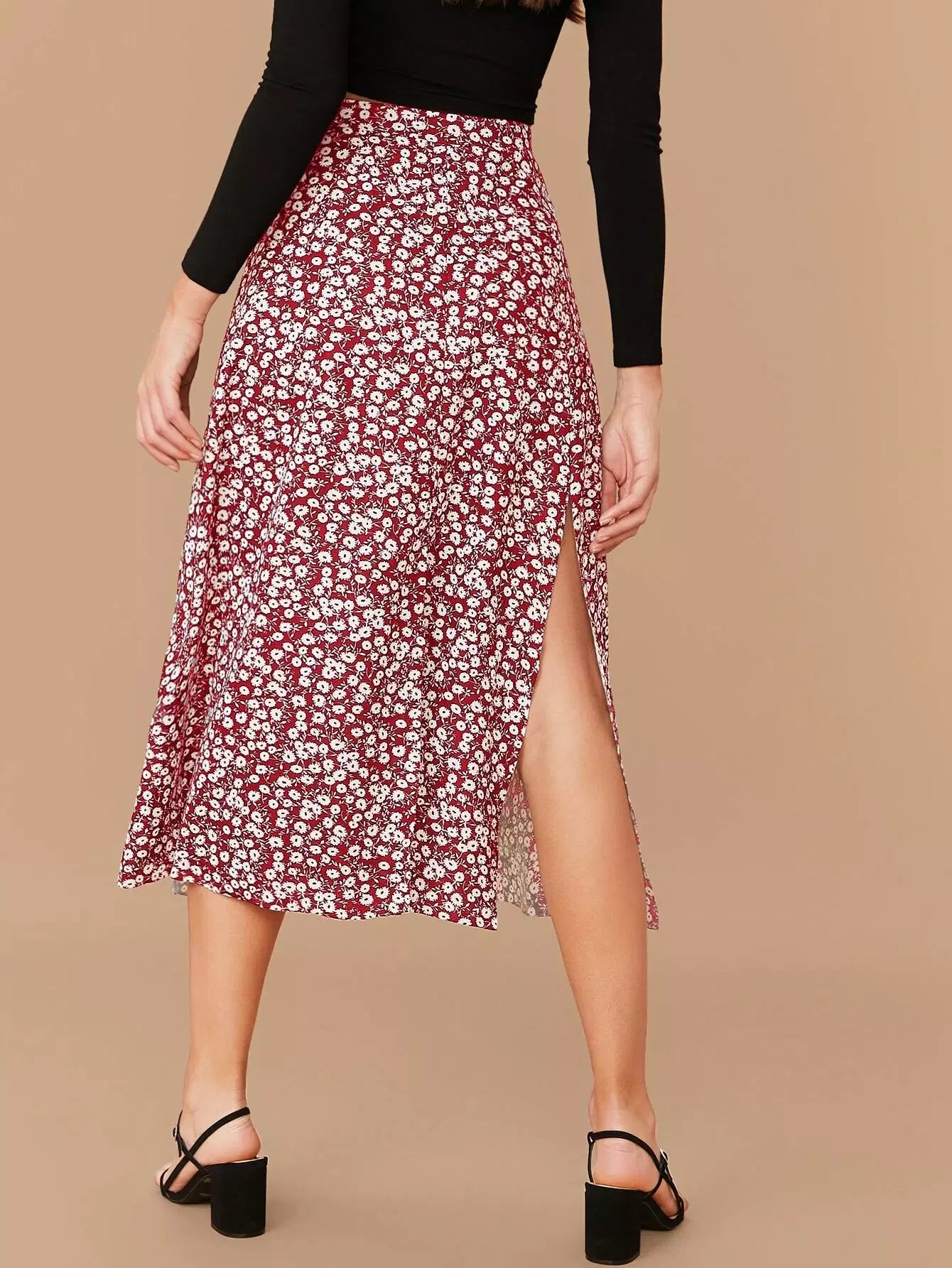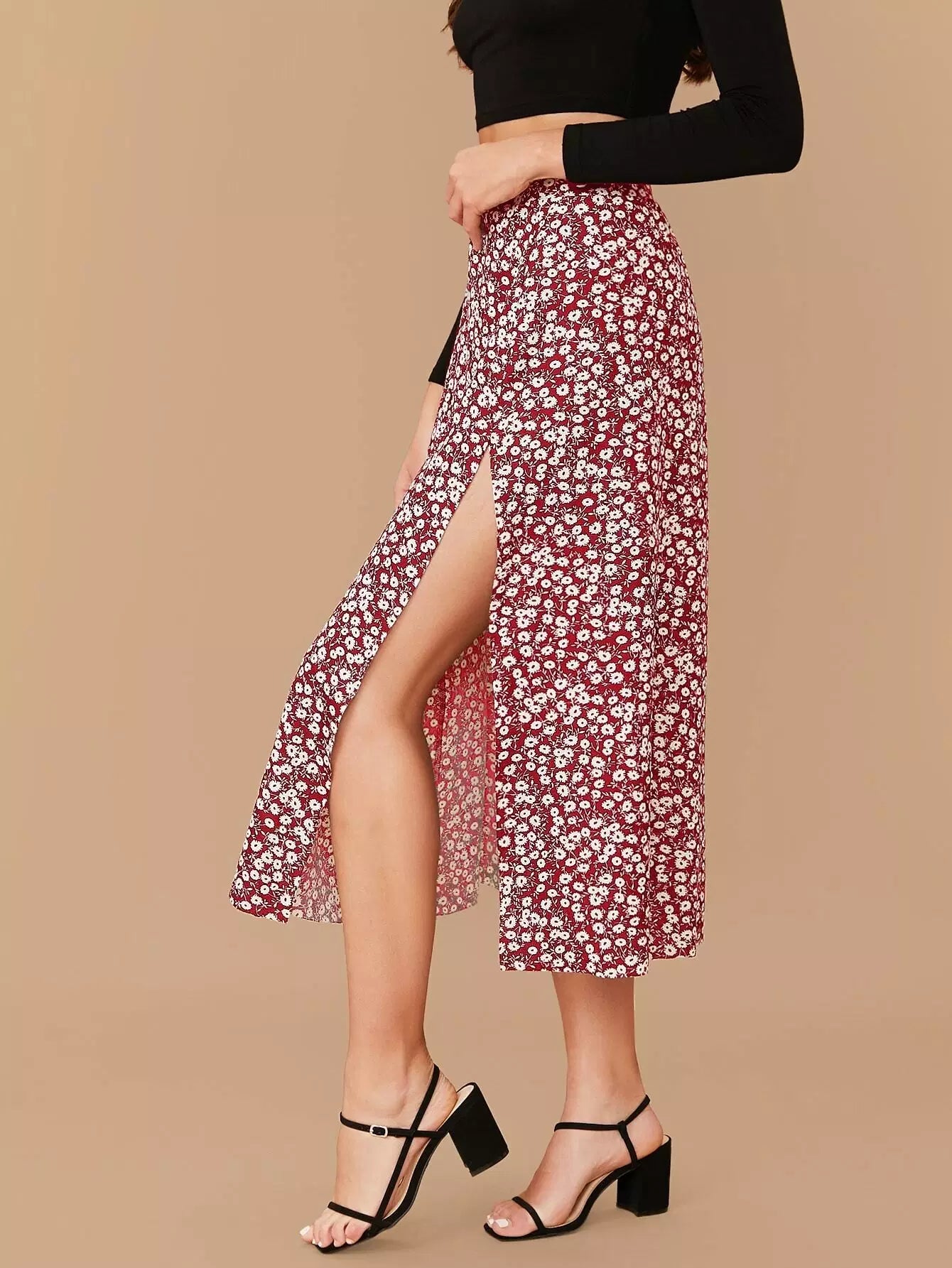 تنورة بطبعة زهور صغيرة مقسمة حتى الفخذ