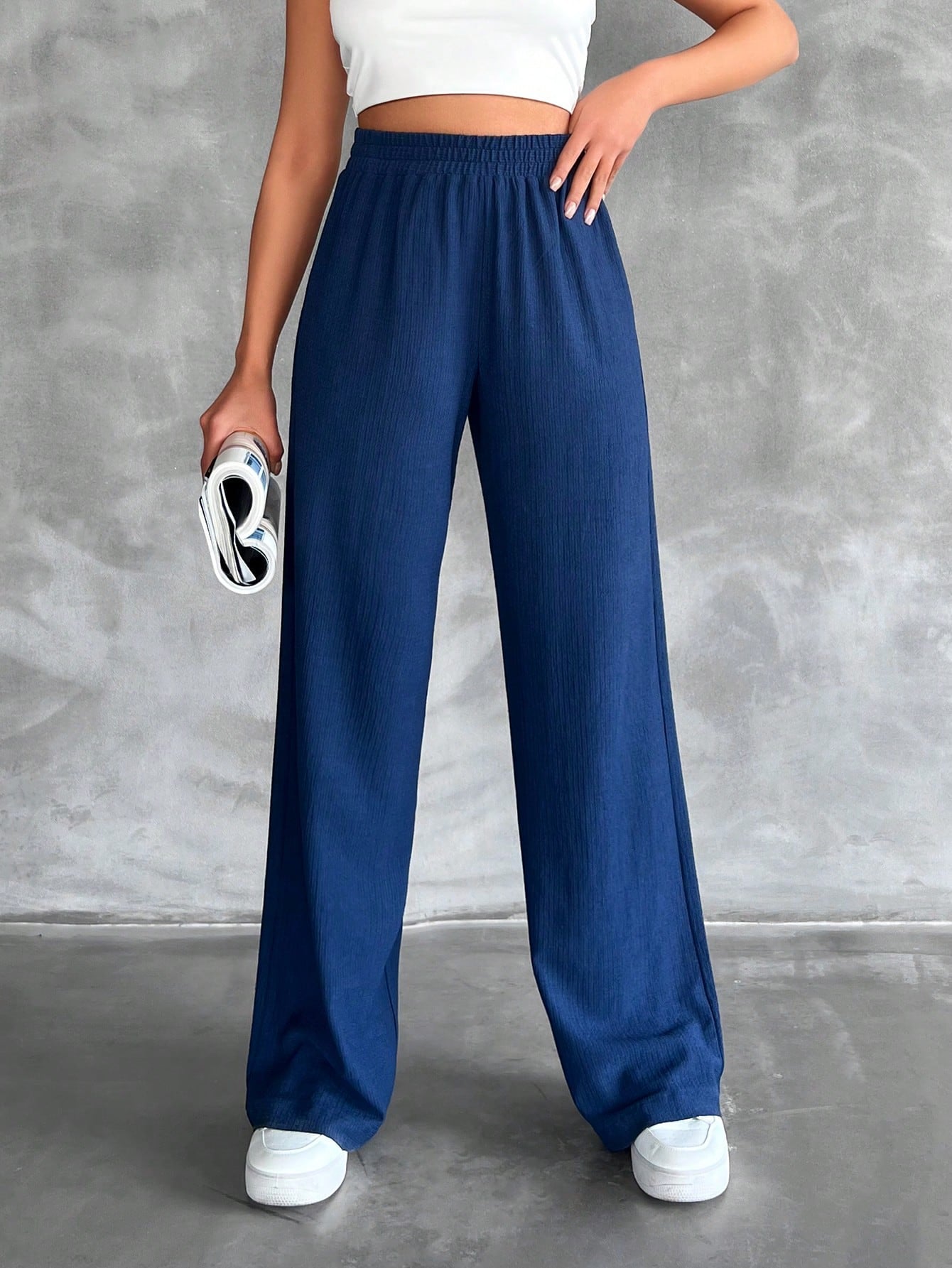 بنطال قطني طويل بمقاس طويل، سادة، بخصر مطاطي وقصة مستقيمة