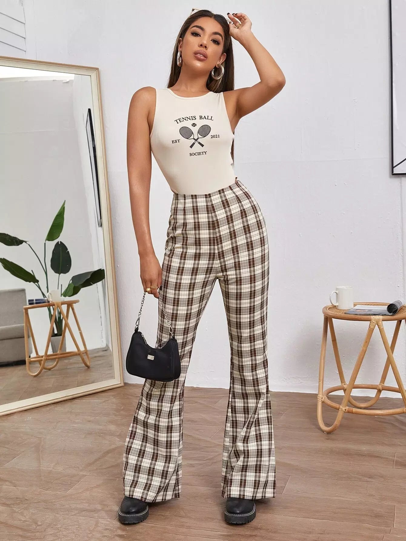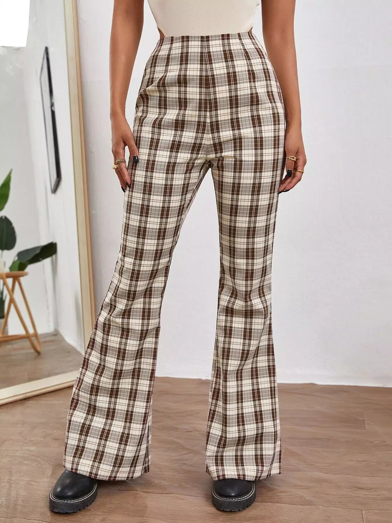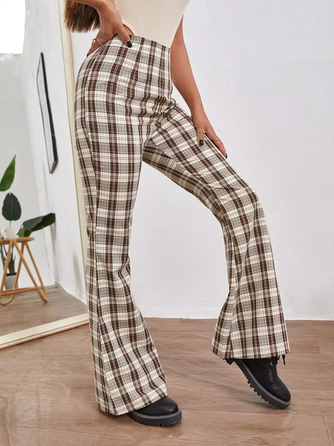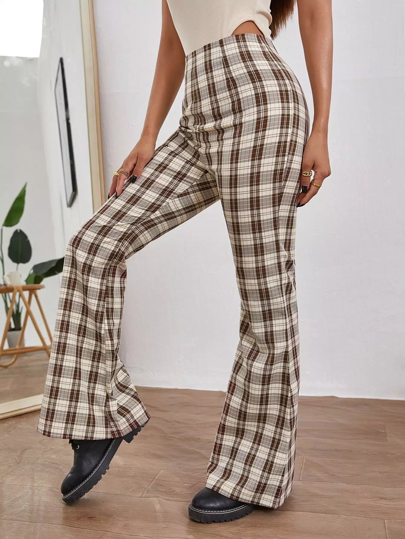 بنطلون بطبعة تارتان واسع الساقين