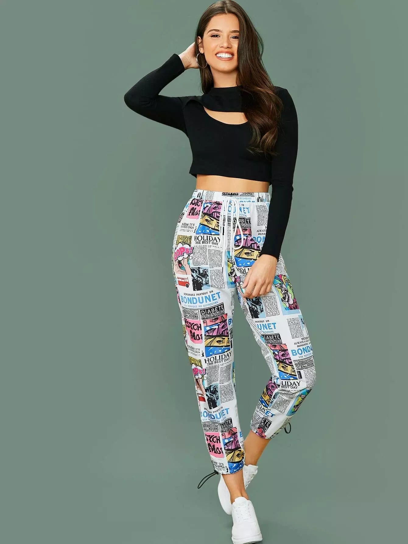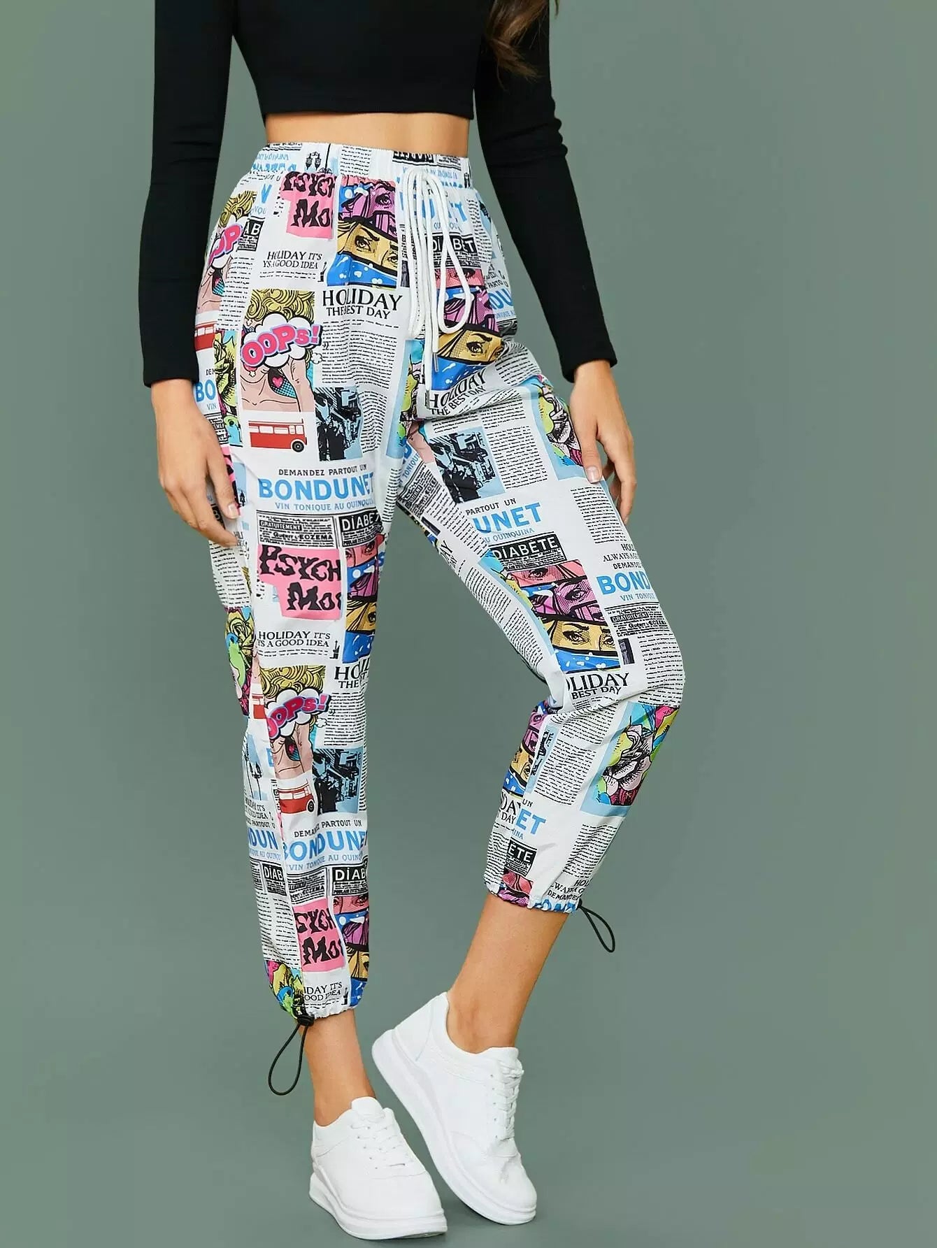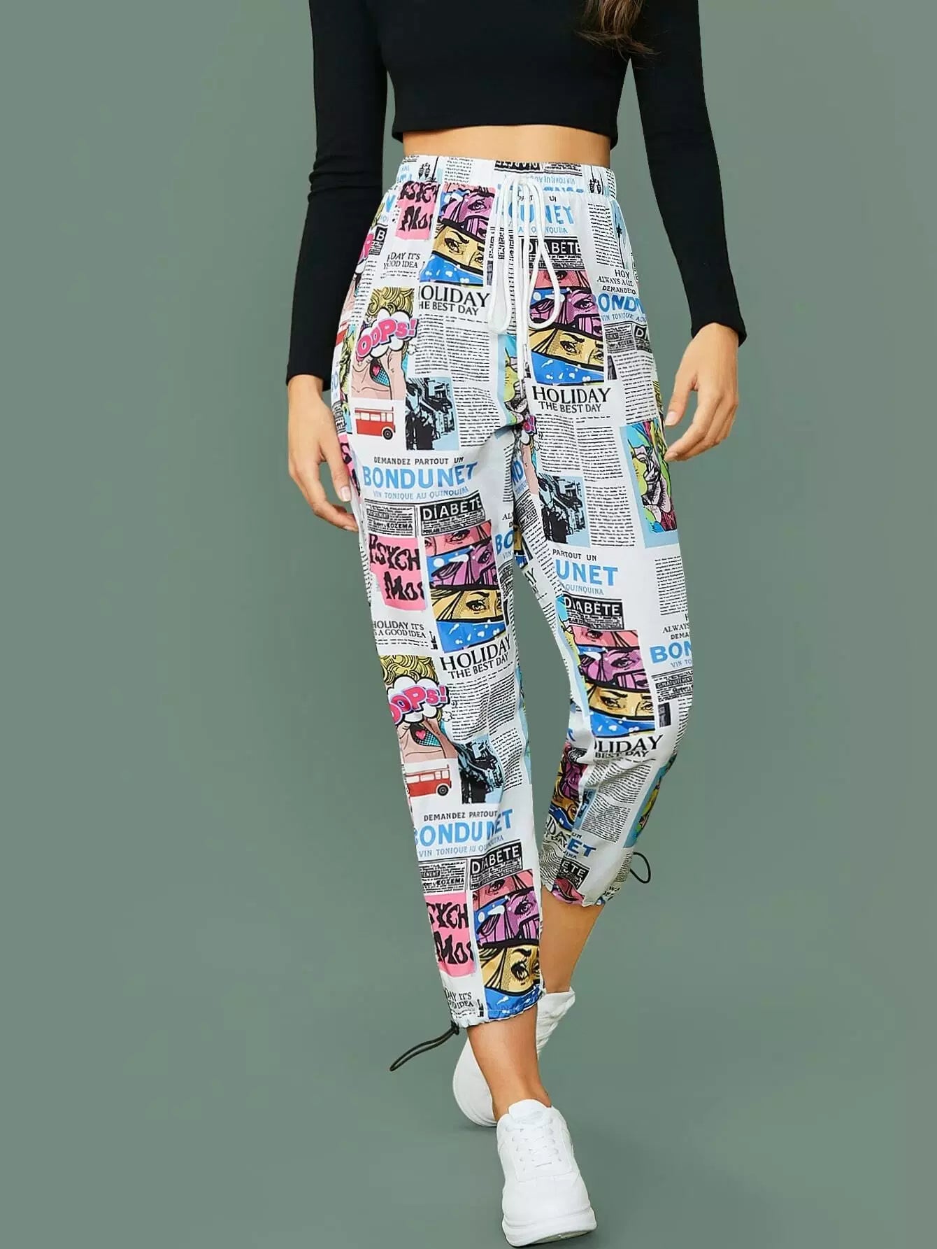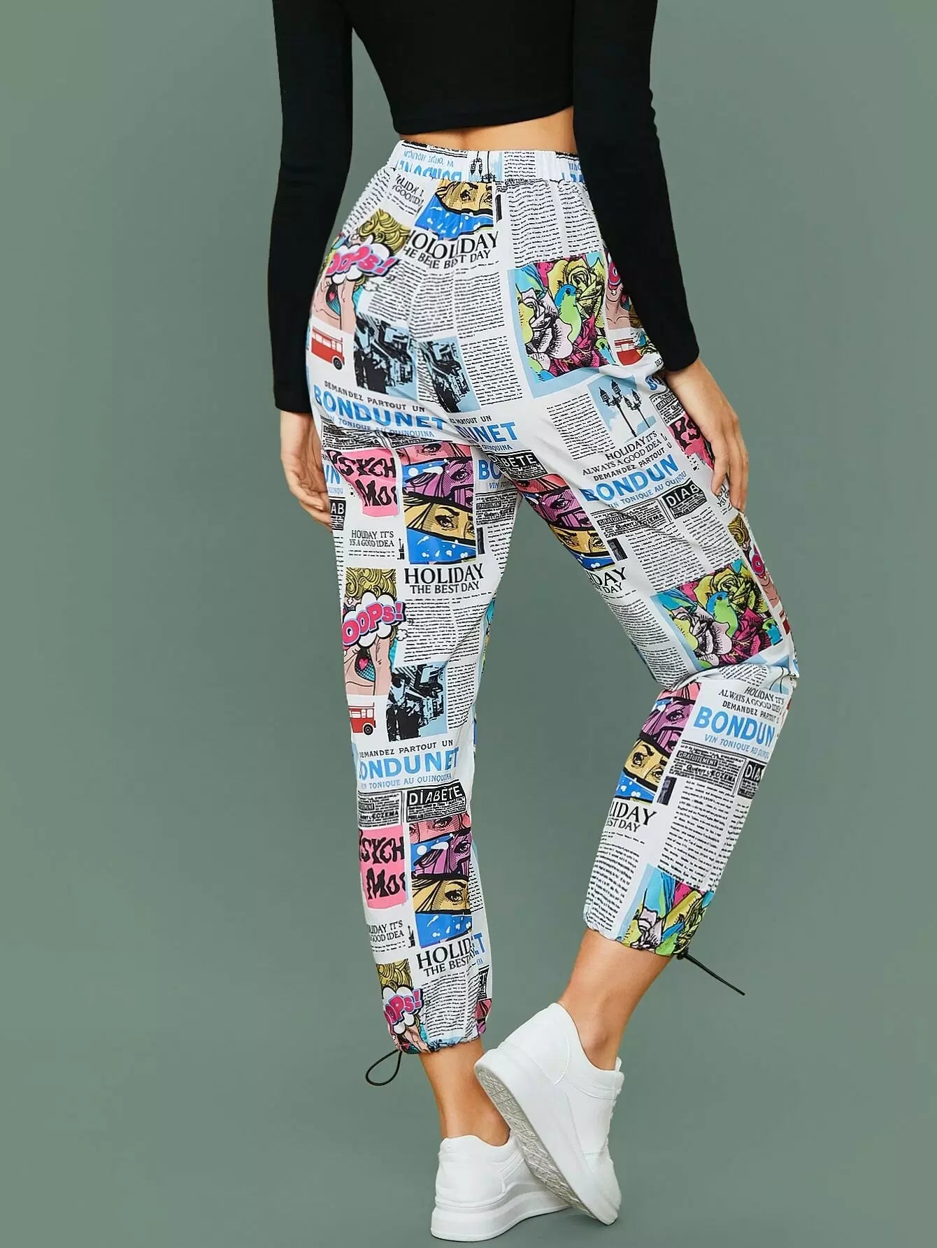 للنساء - بنطال مطبوع عليه صحيفة وأكمام برباط عند الخصر