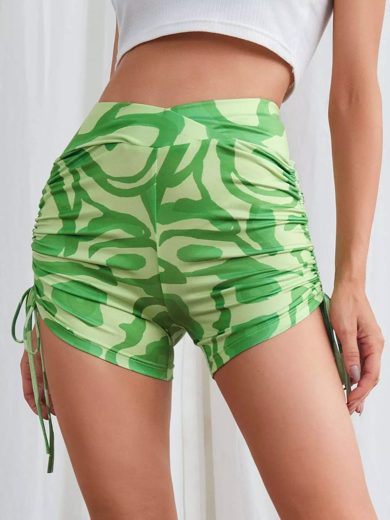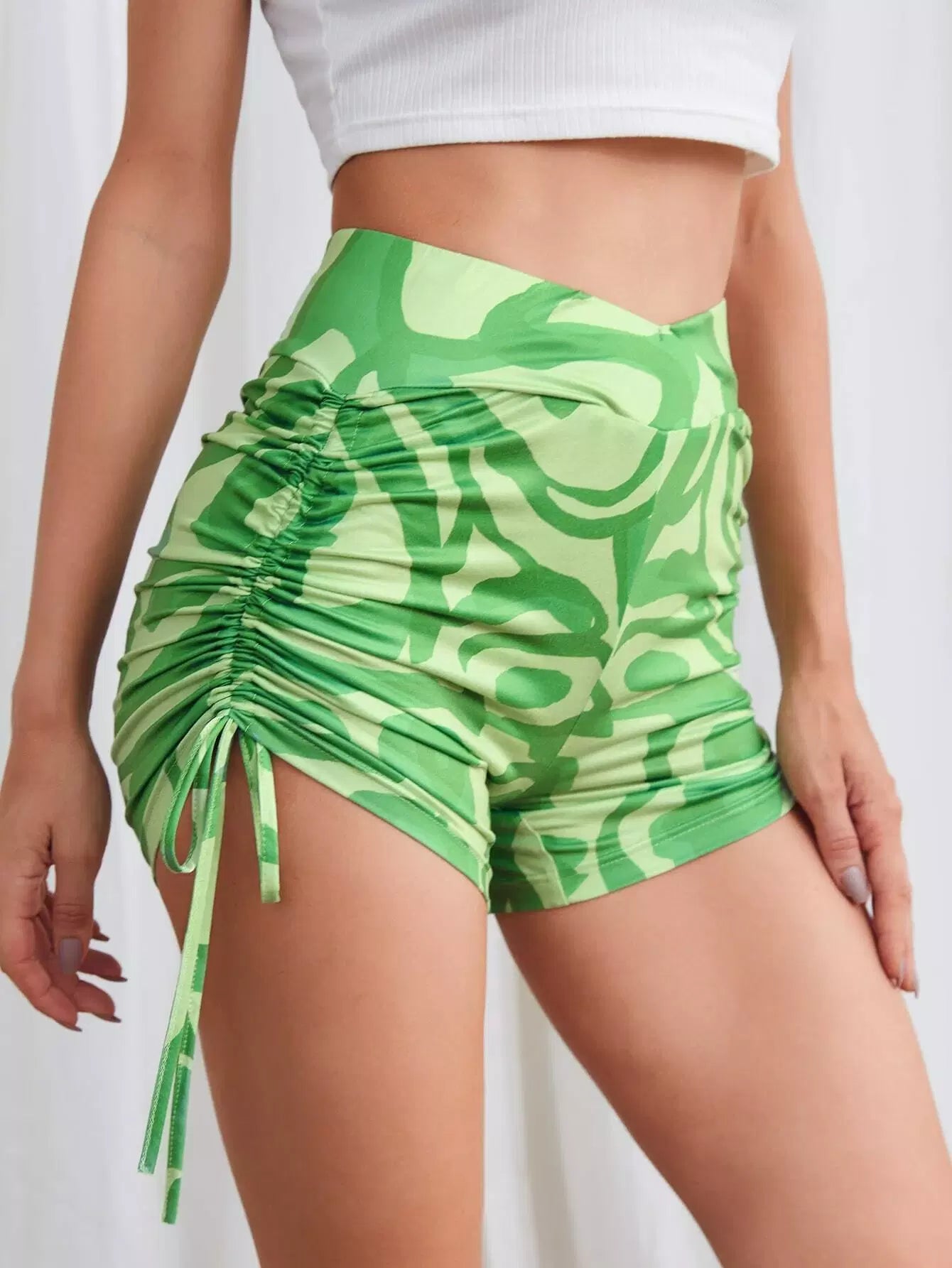 سروال قصير بحزام خصر غير متماثل بحزام خصر برباط رباط بطبعة جرافيك