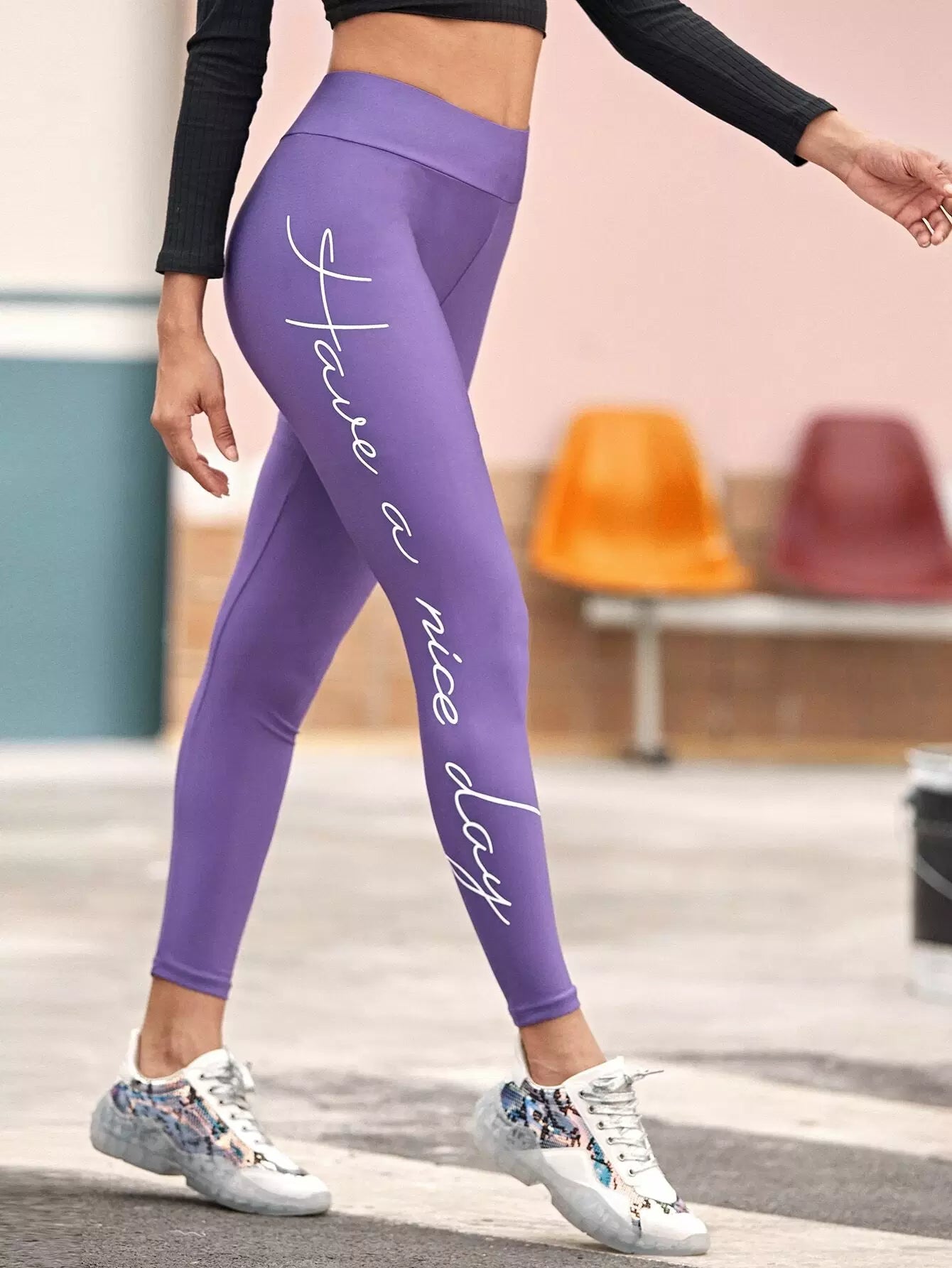 بنطال ضيق بخصر مطاطي مزين بشعارات جرافيك مطاطي