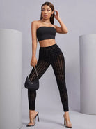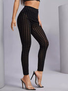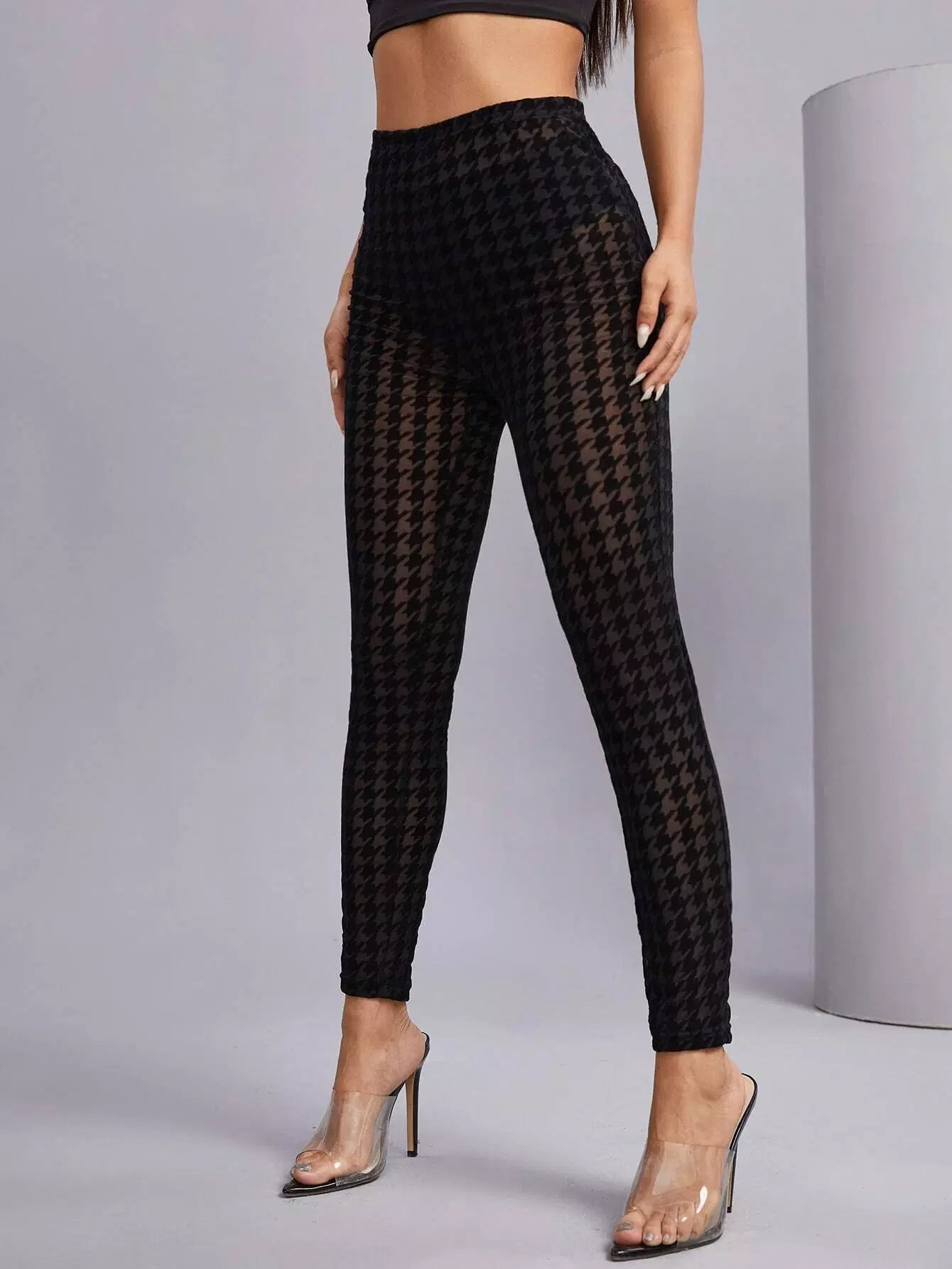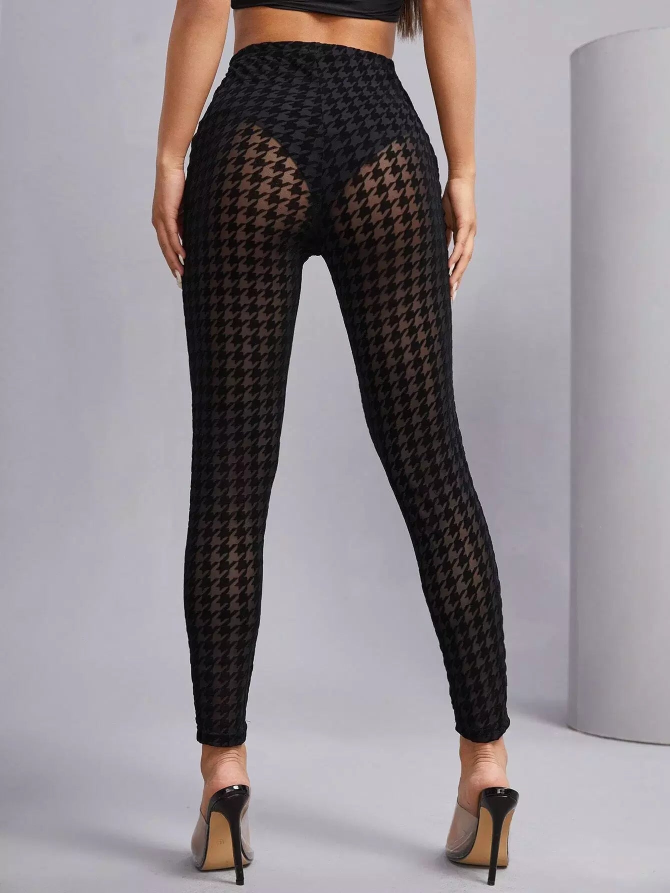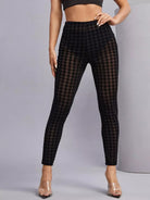 بنطال ضيق شفاف من قماش شبكي بنقشة مربعات بدون سروال داخلي