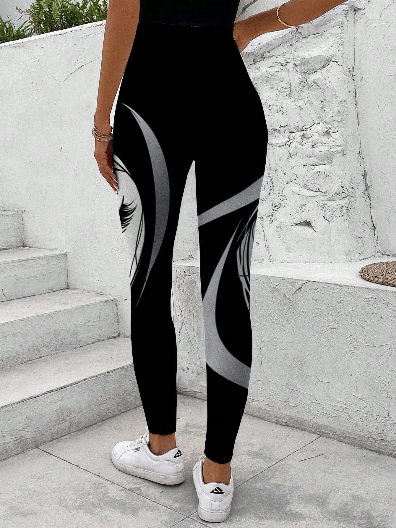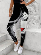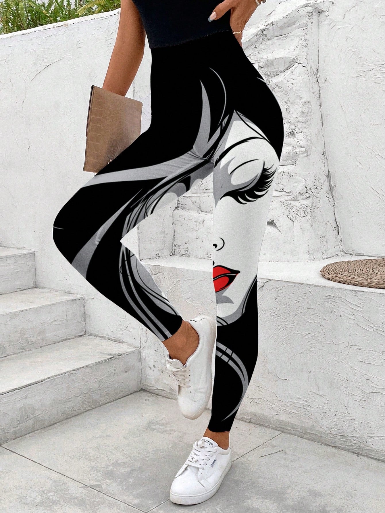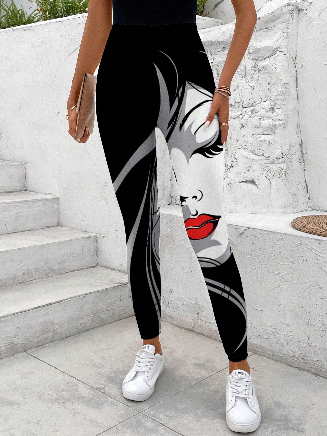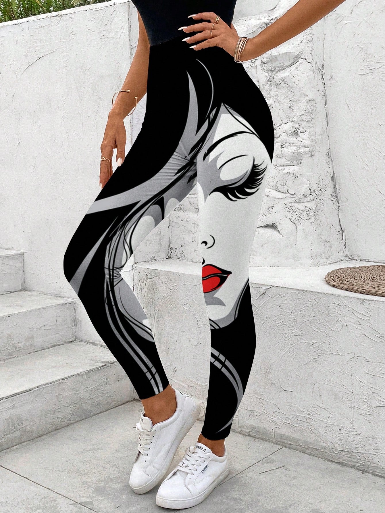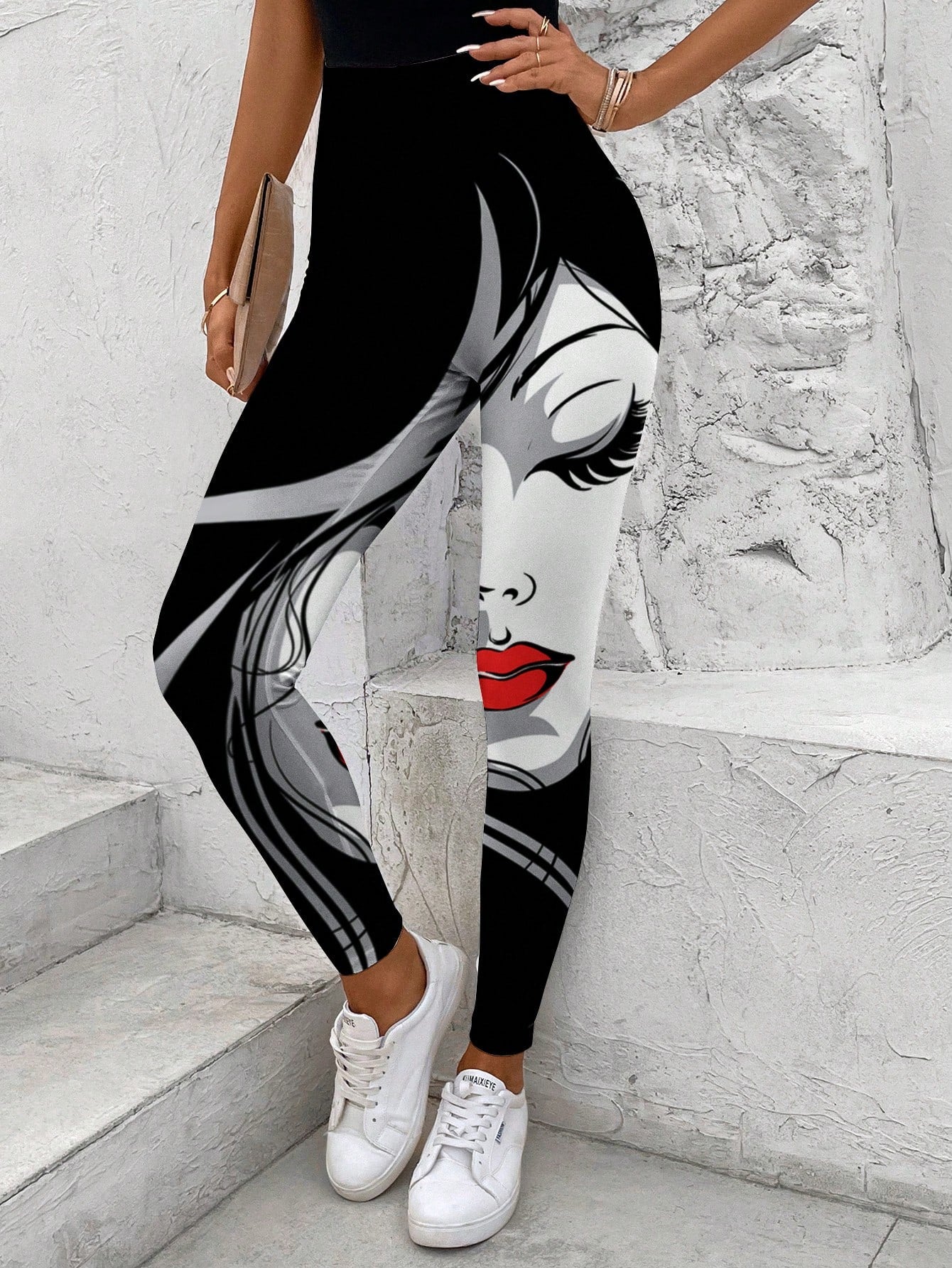 LUNE Women Abstract Face Printed Leggings, Casual Tight-Fitting Pants