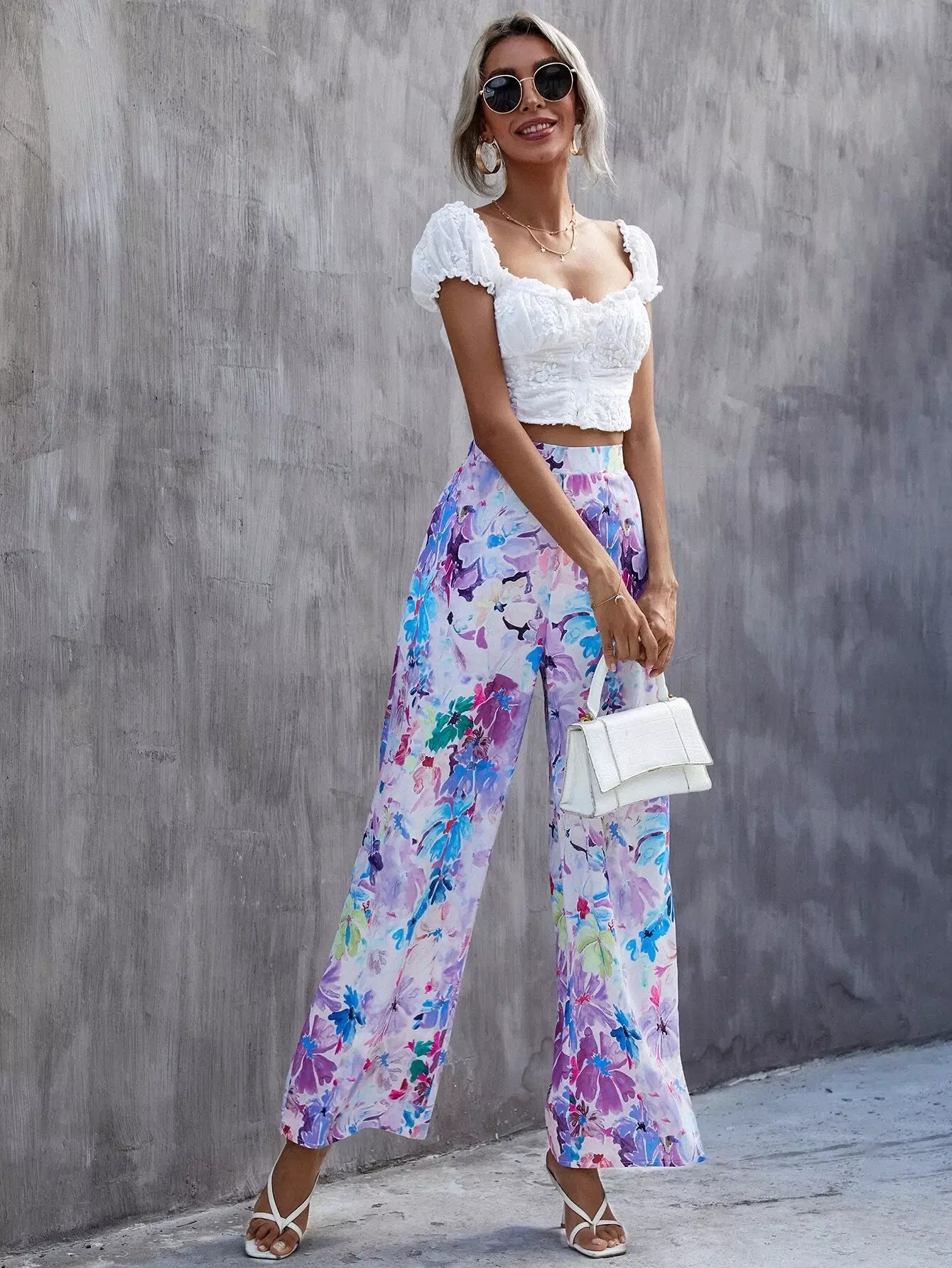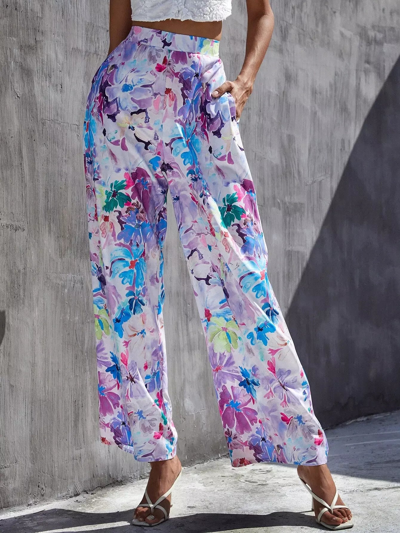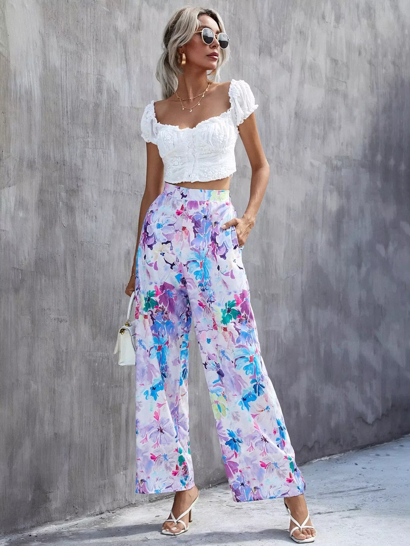 بنطلون واسع الساقين بطبعة زهور فوق البنطلون