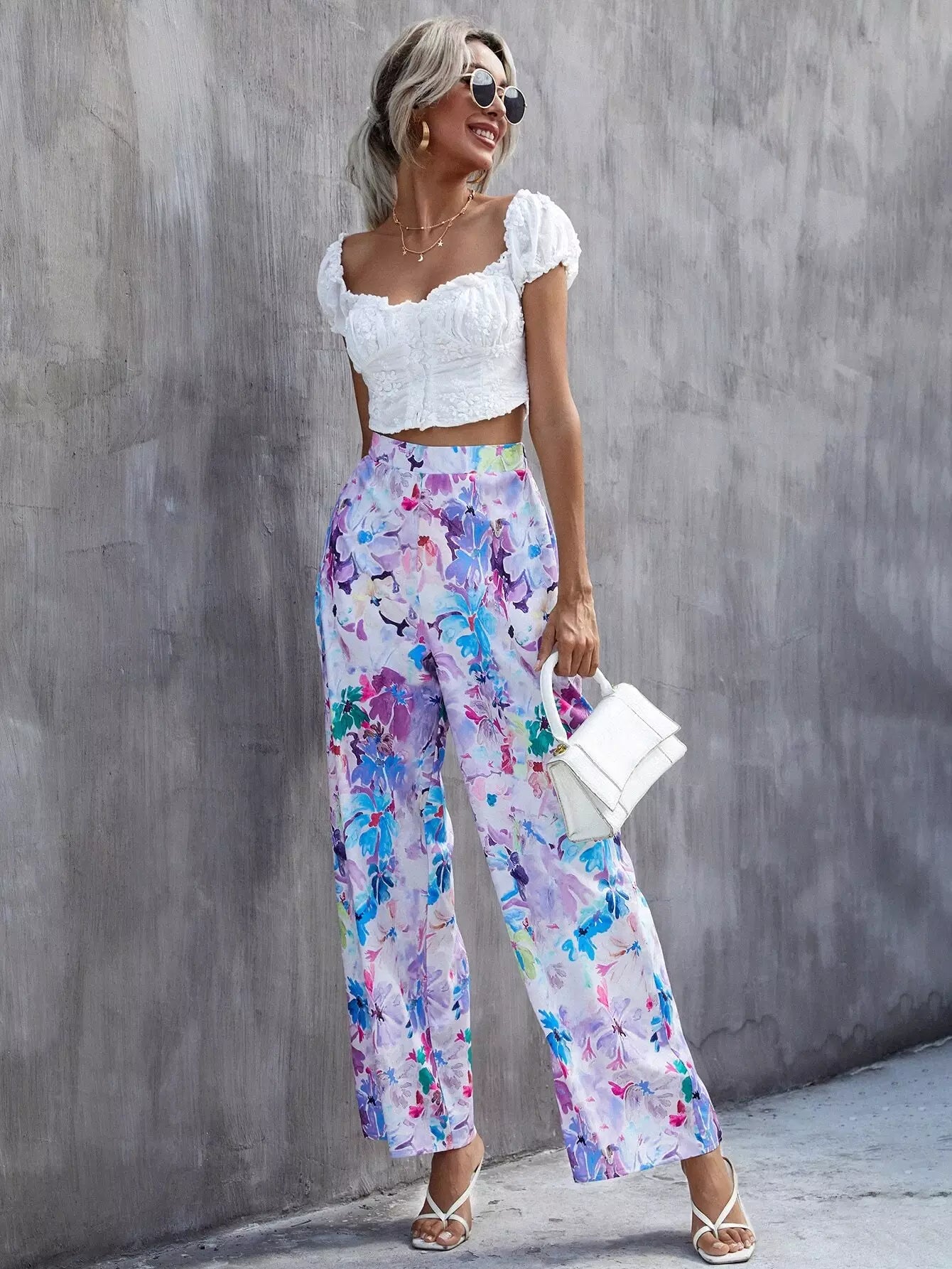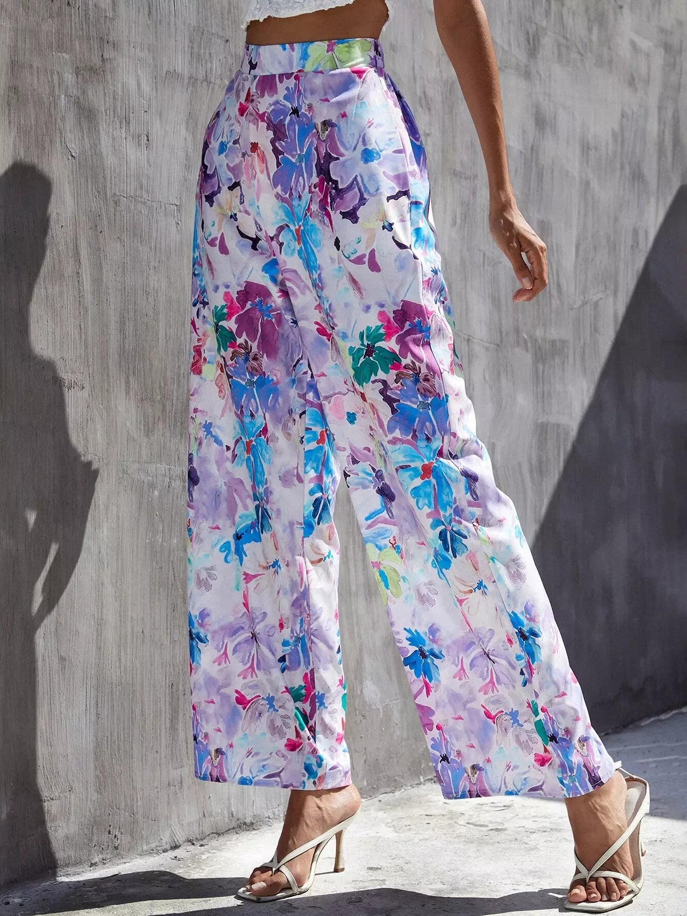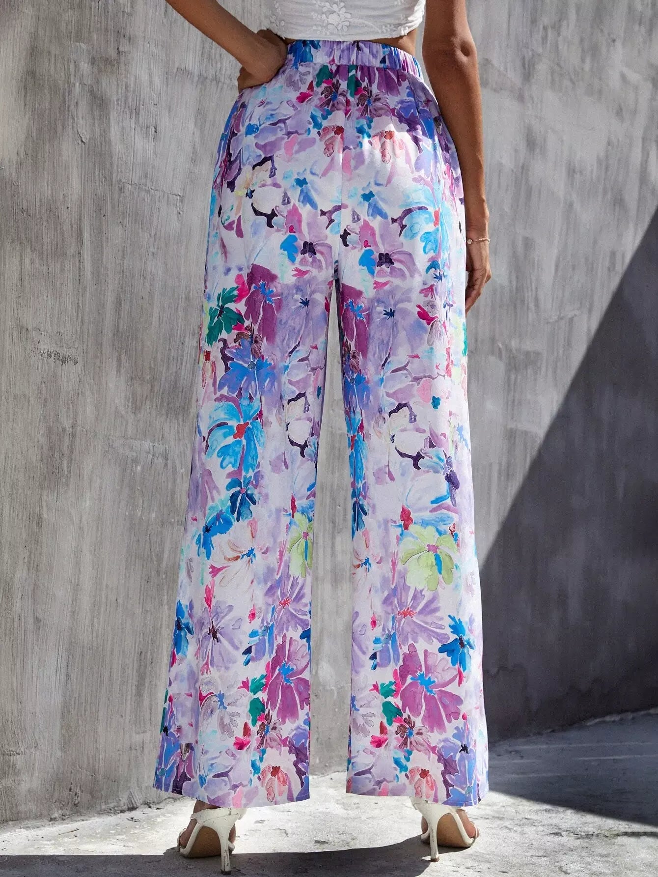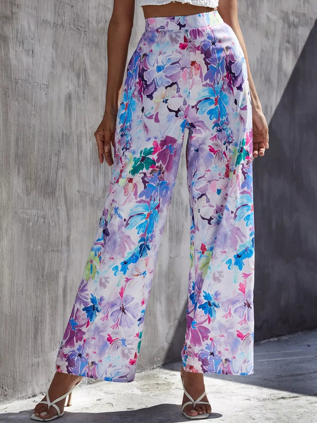 بنطلون واسع الساقين بطبعة زهور فوق البنطلون