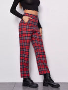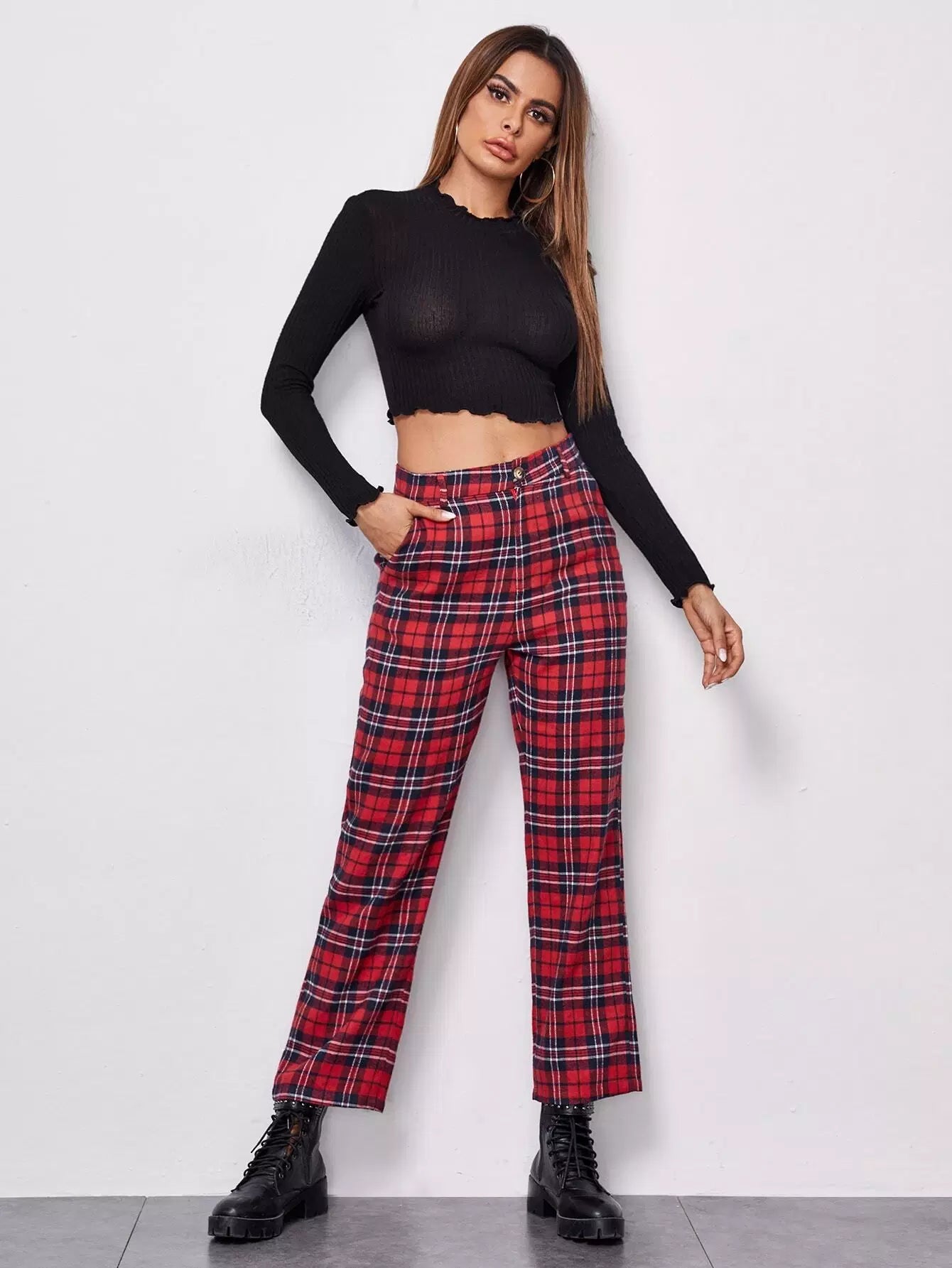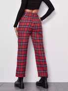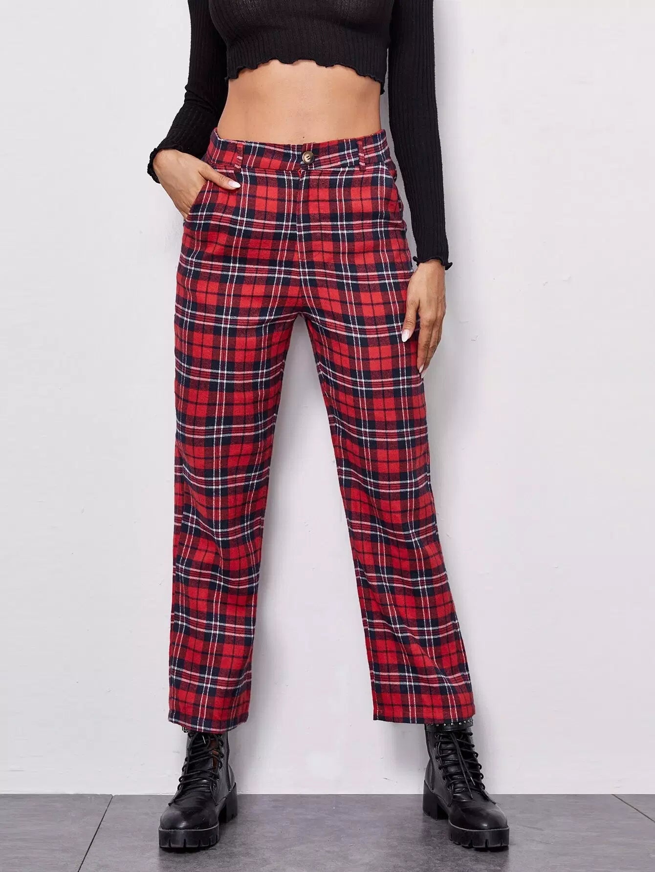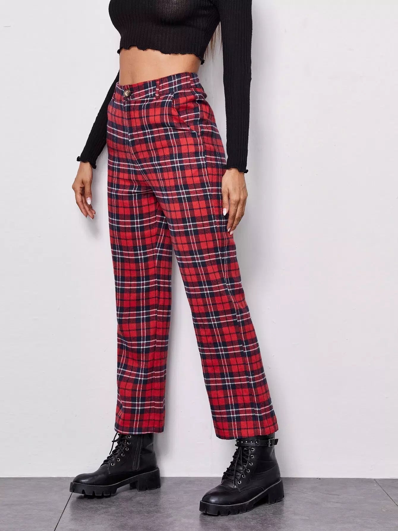 بنطلون تارتان بأزرار أمامية مائلة بجيب مائل بأزرار