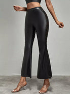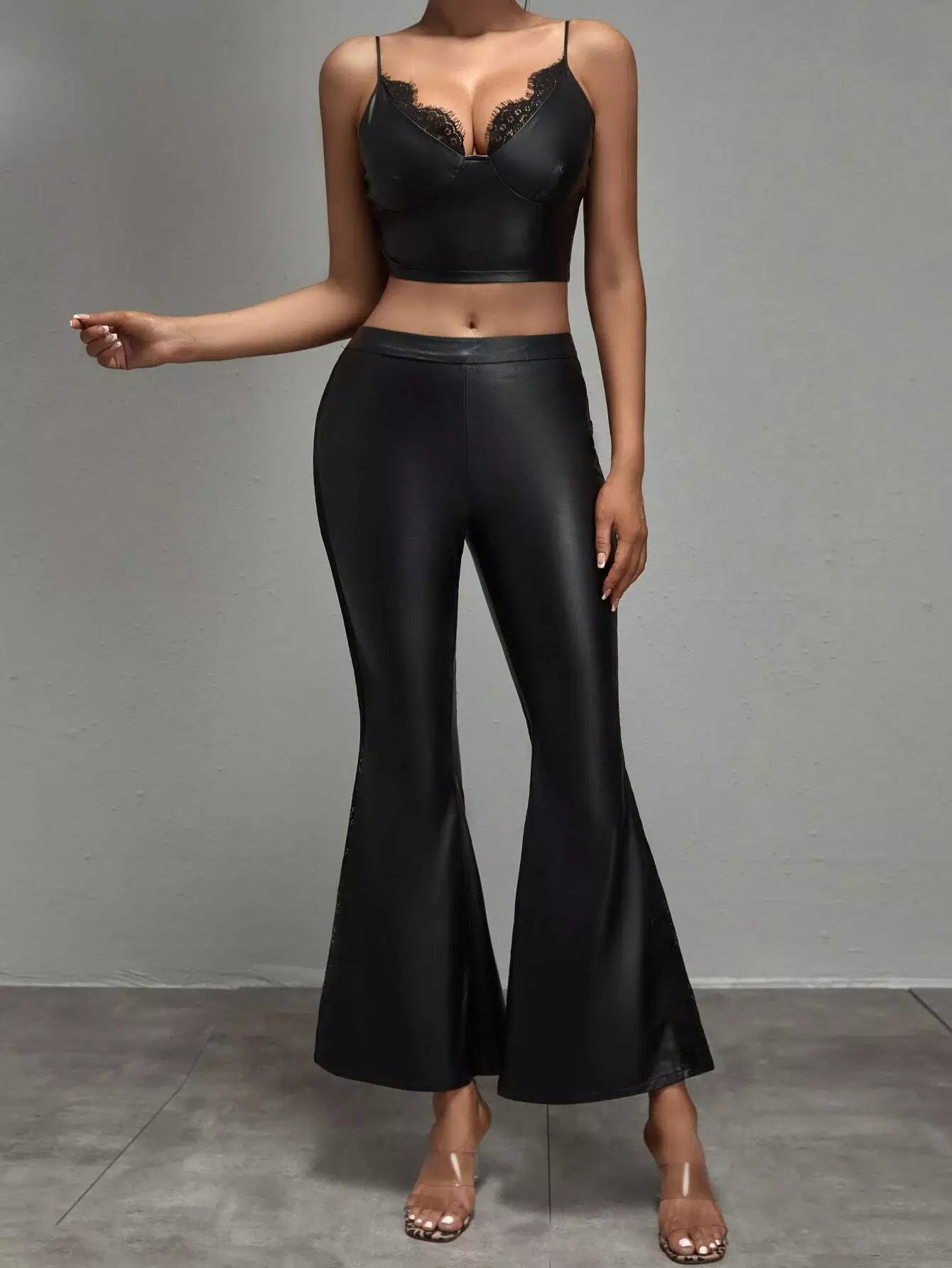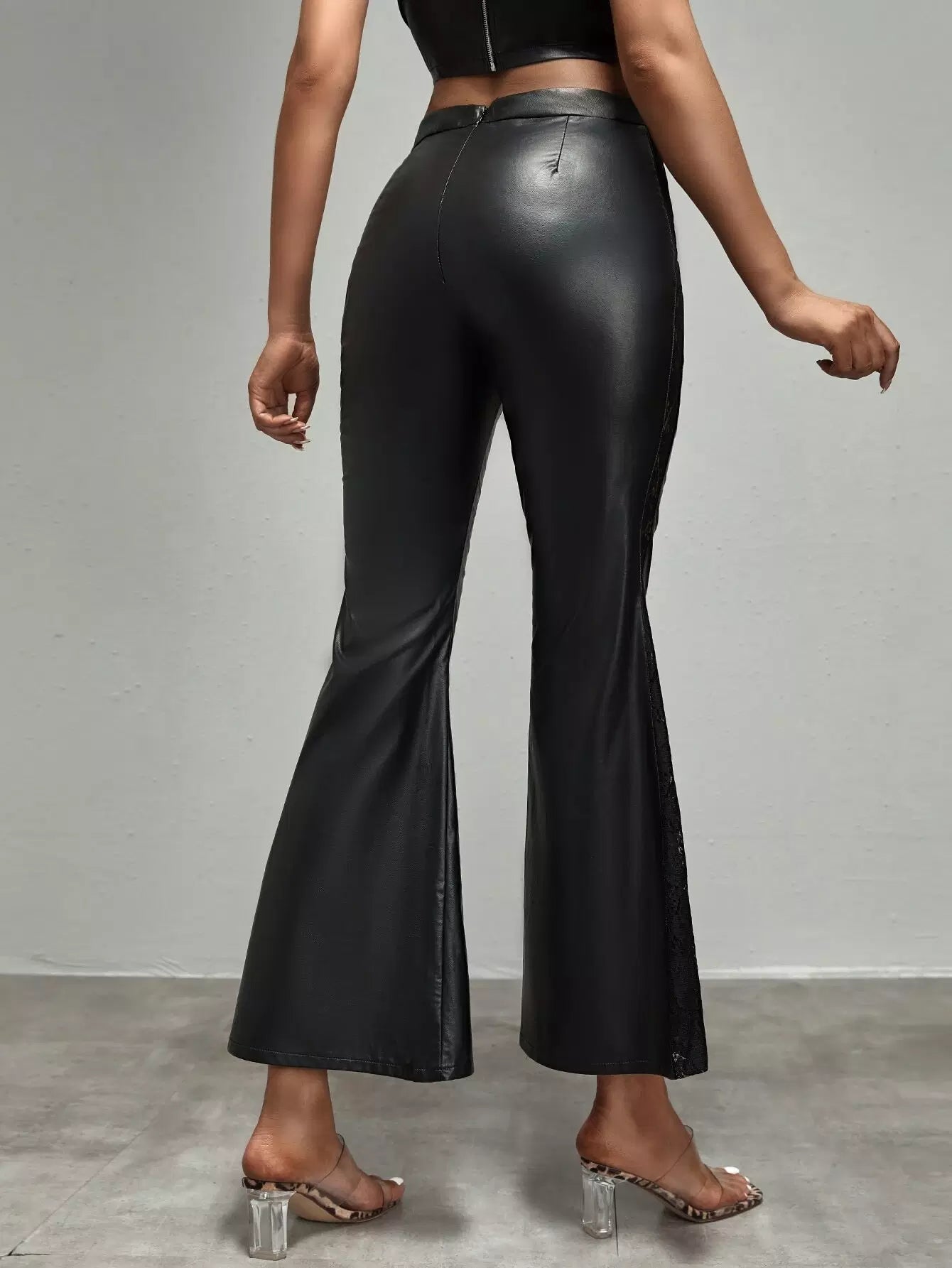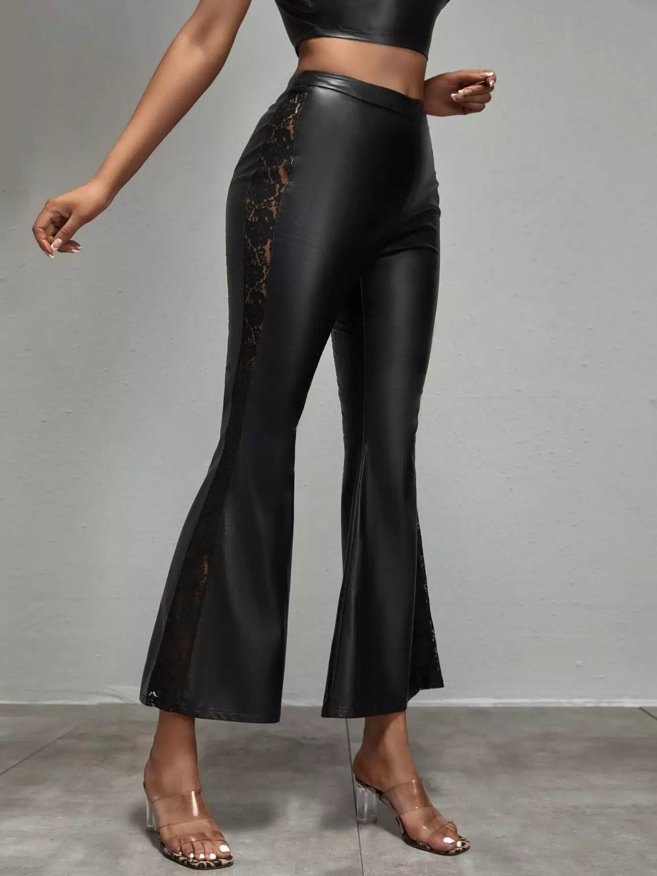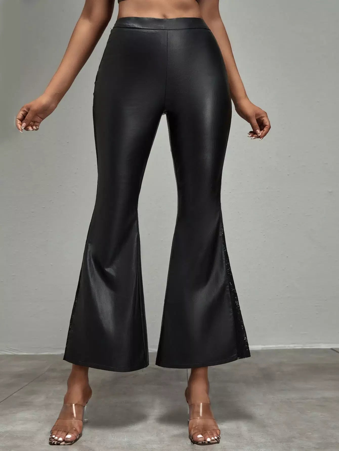 بنطال من الجلد الصناعي بقصة ساق واسعة مع درزات جانبية من الدانتيل المتباين