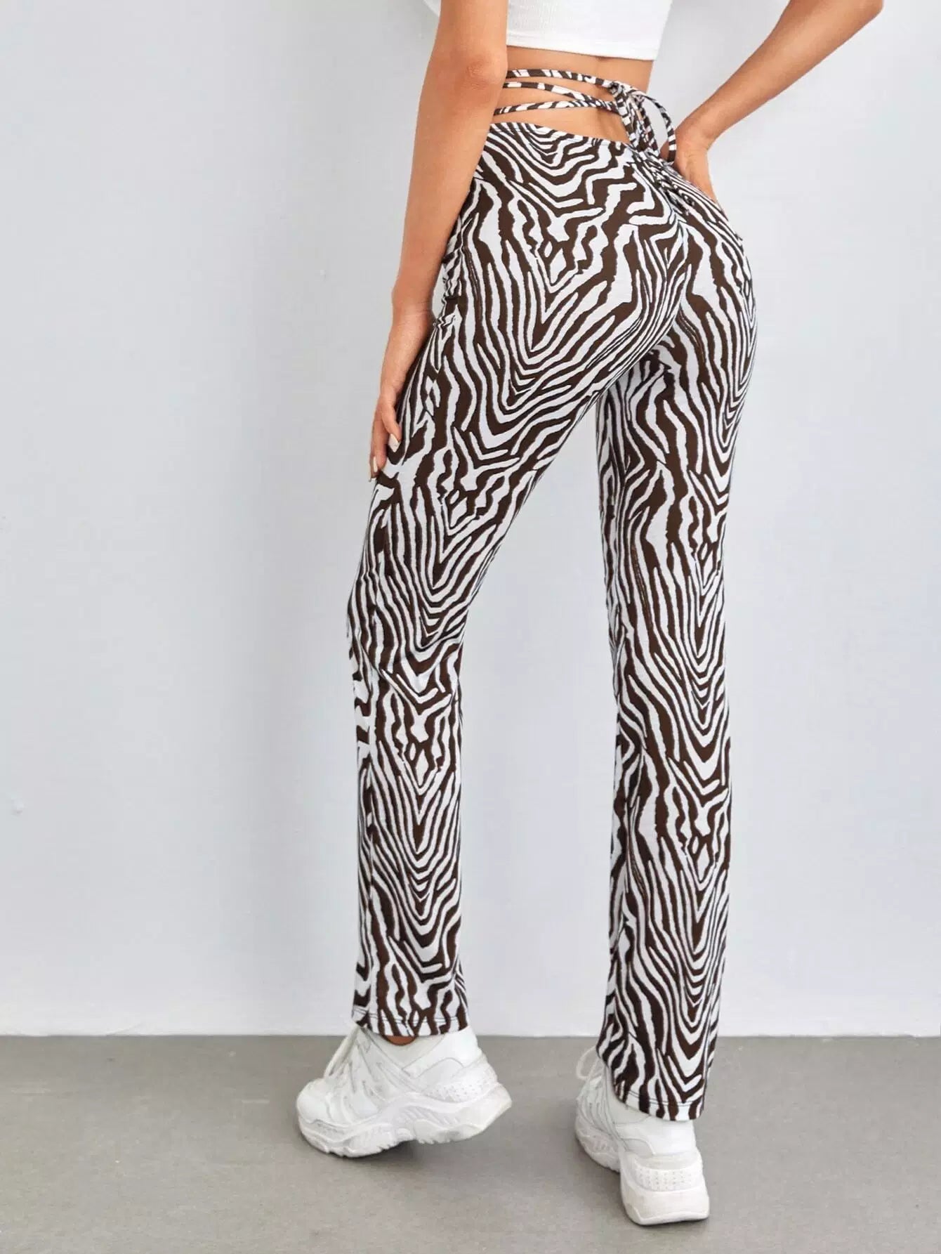 بنطلون مخطط برباط من الخلف برباط متقاطع ومزخرف بتفاصيل مكشكشة على شكل حمار وحشي