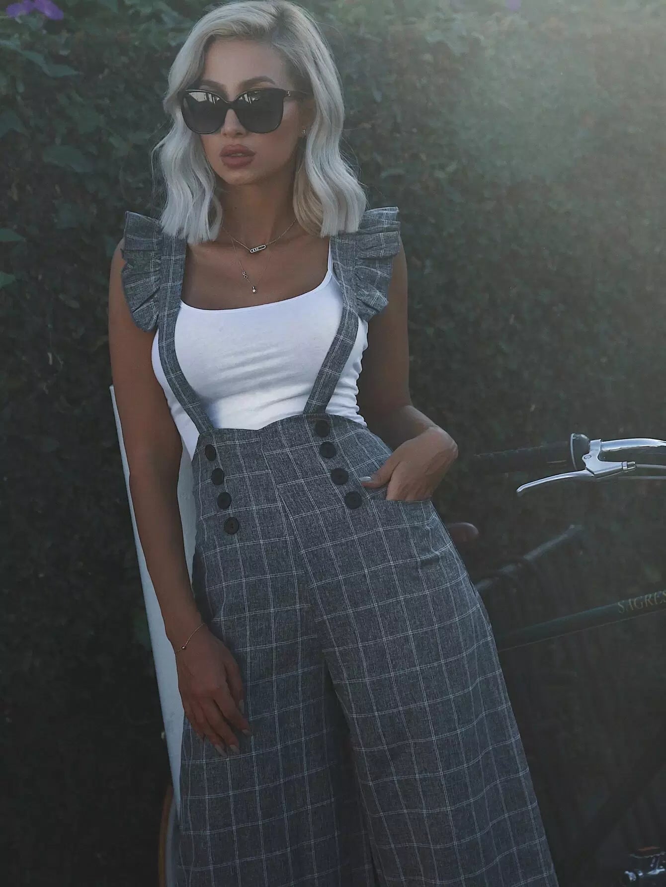 للنساء - بنطال كولوت مزدوج الصدر مع حزام كشكش