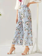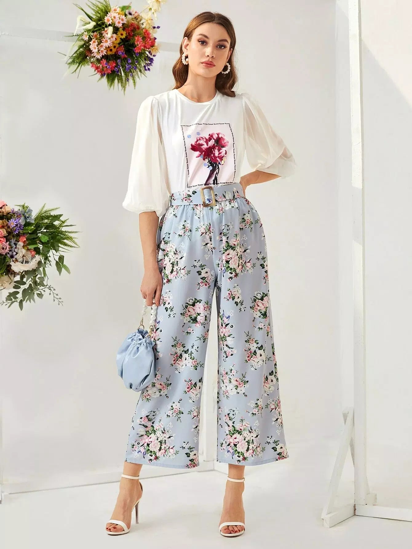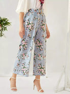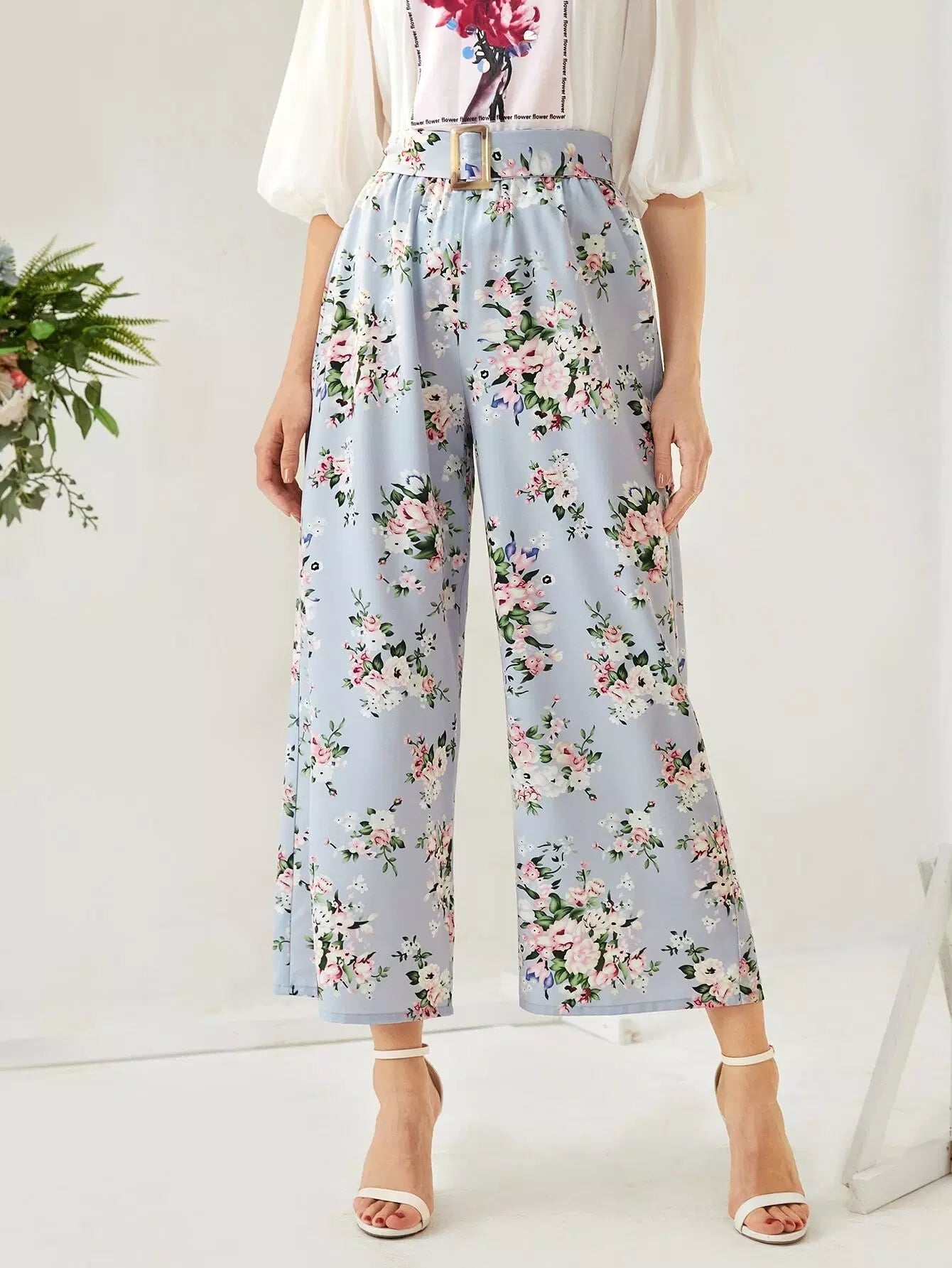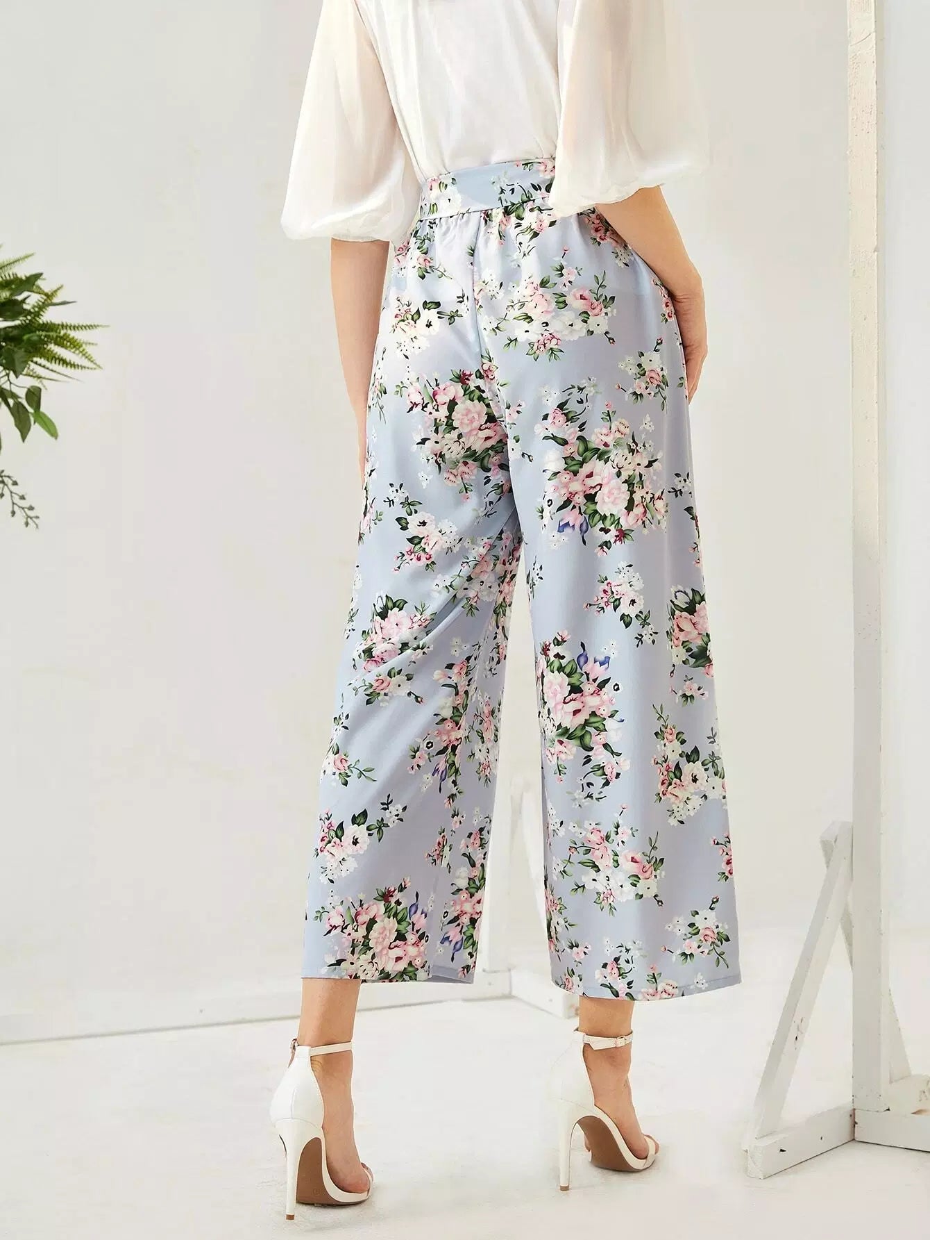 بنطال بأرجل واسعة وطبعات زهور بدون حزام