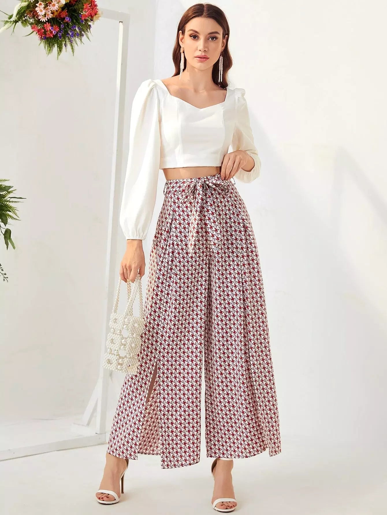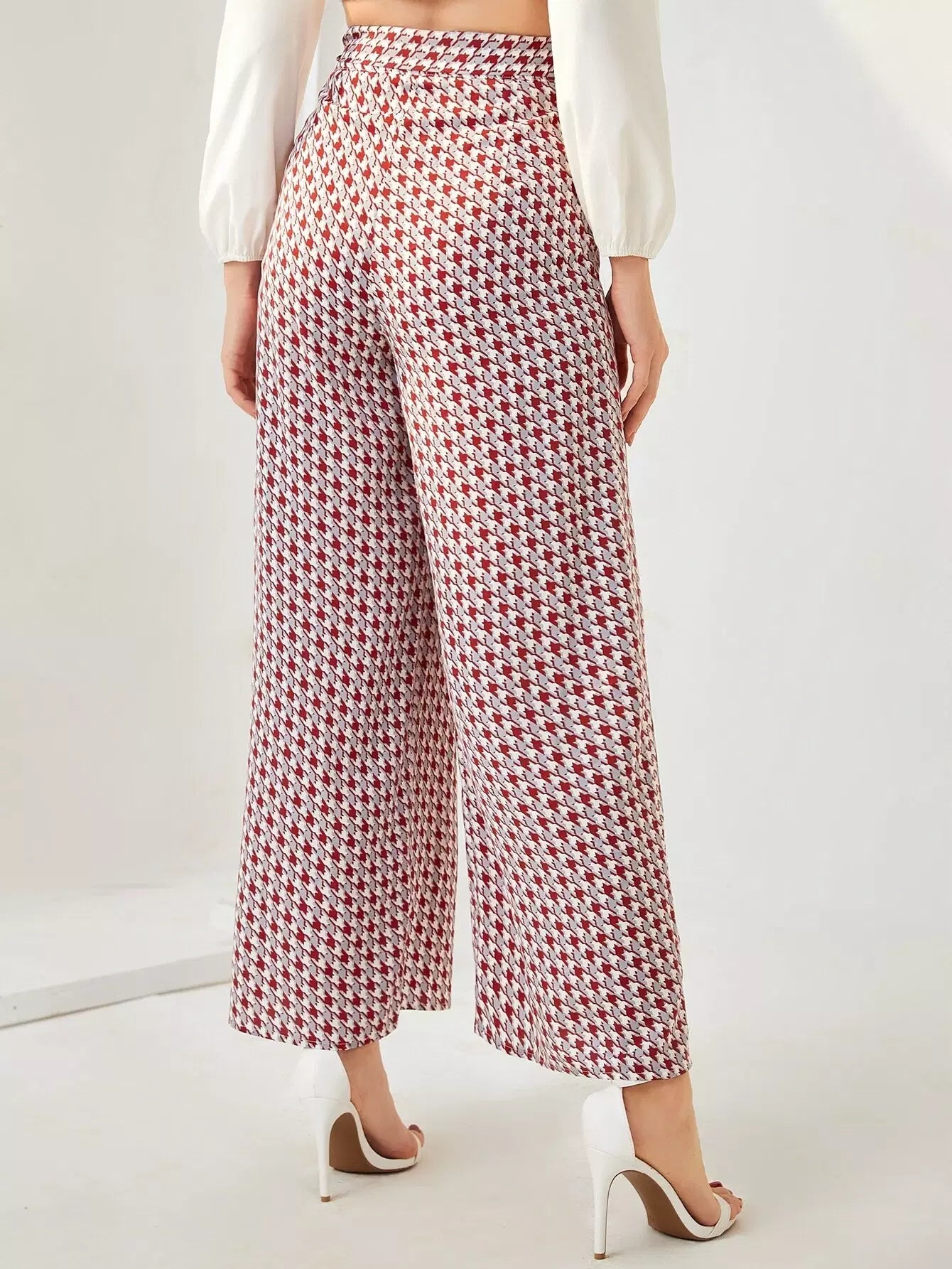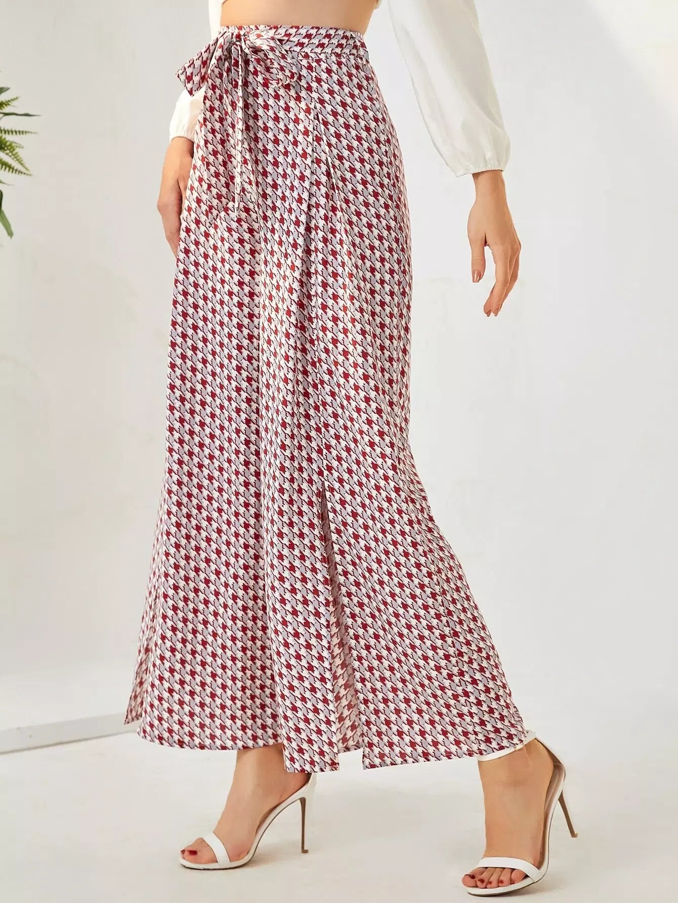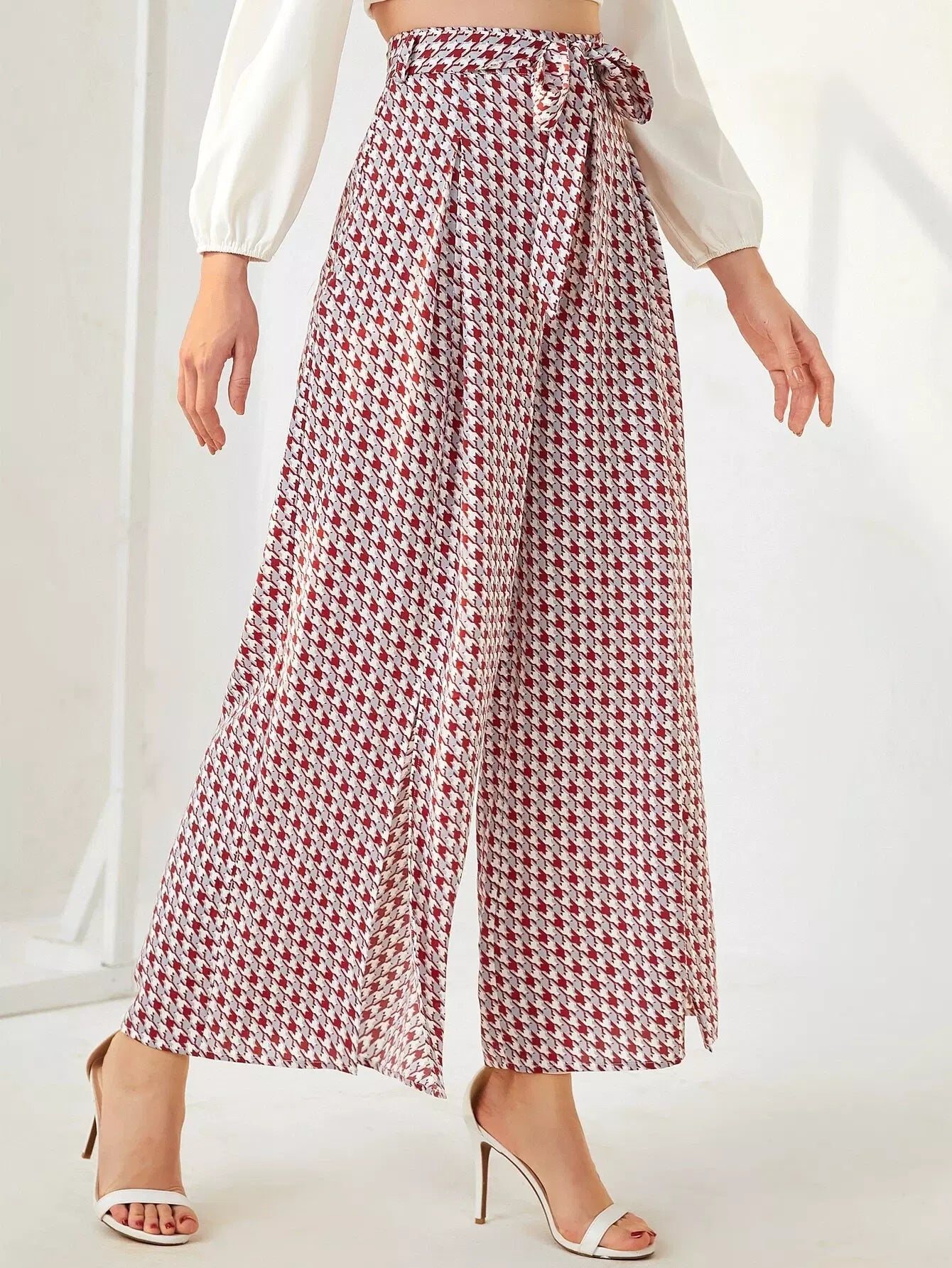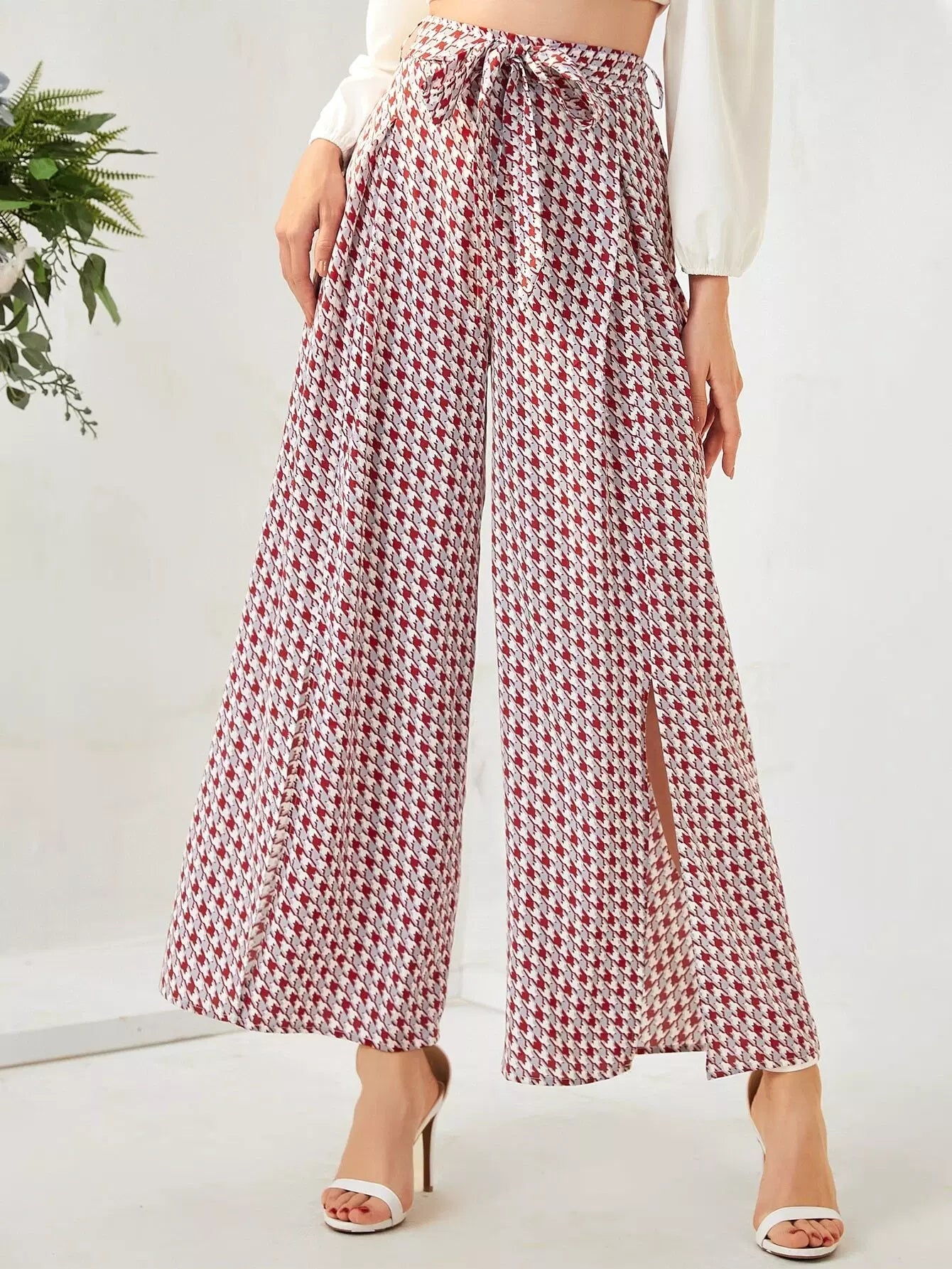 بنطال بأرجل واسعة وبشق هاوندزتوث بدون حزام