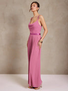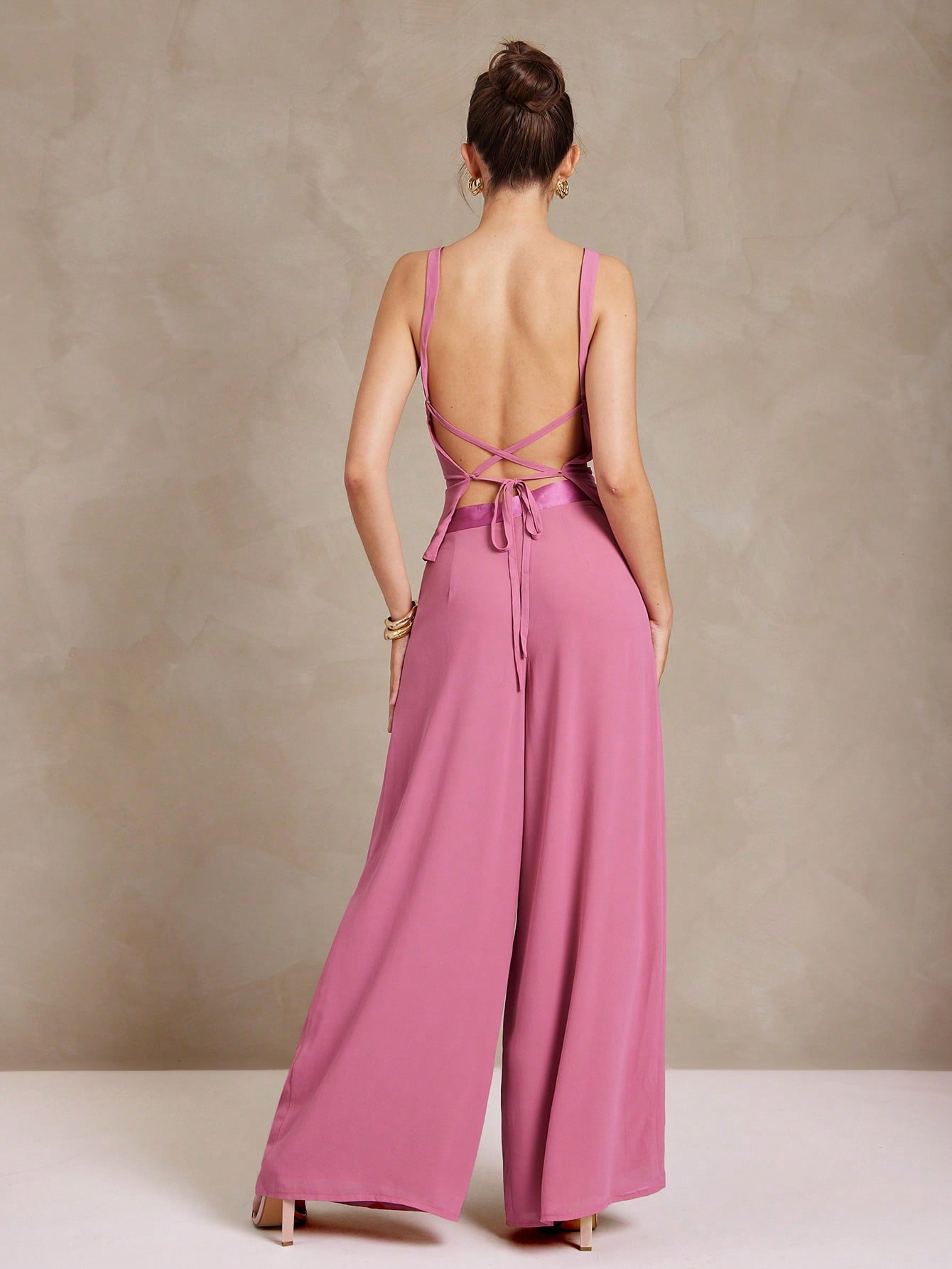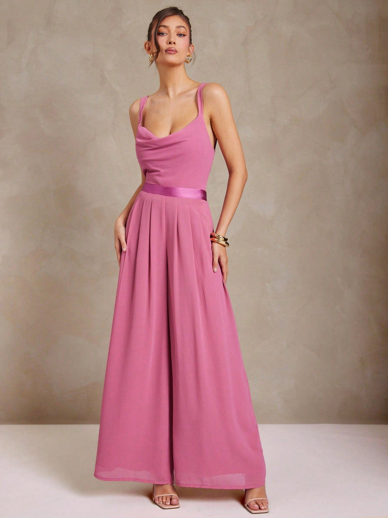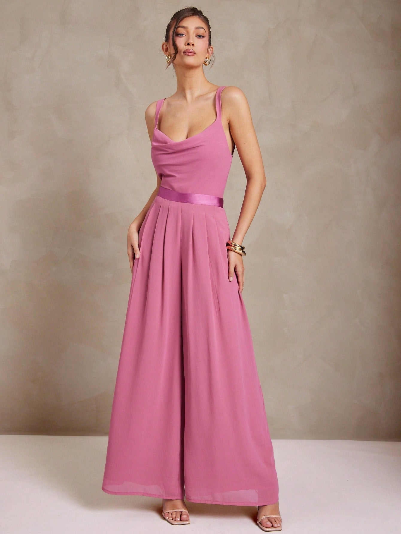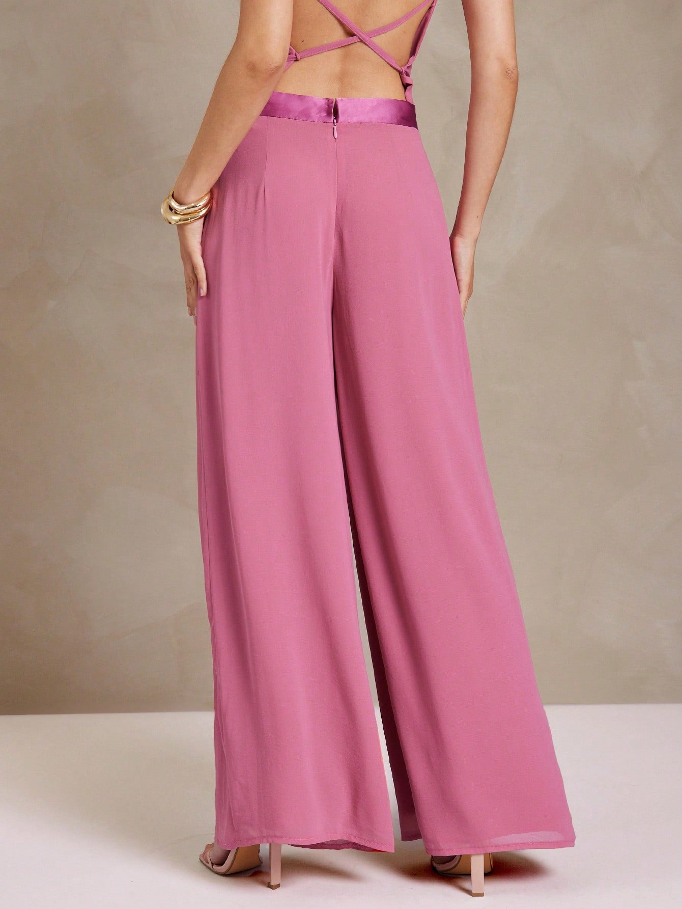 women L'Amorae Women Pleated Wide Leg Chiffon Palazzo Pants With Satin Waist Spring Summer