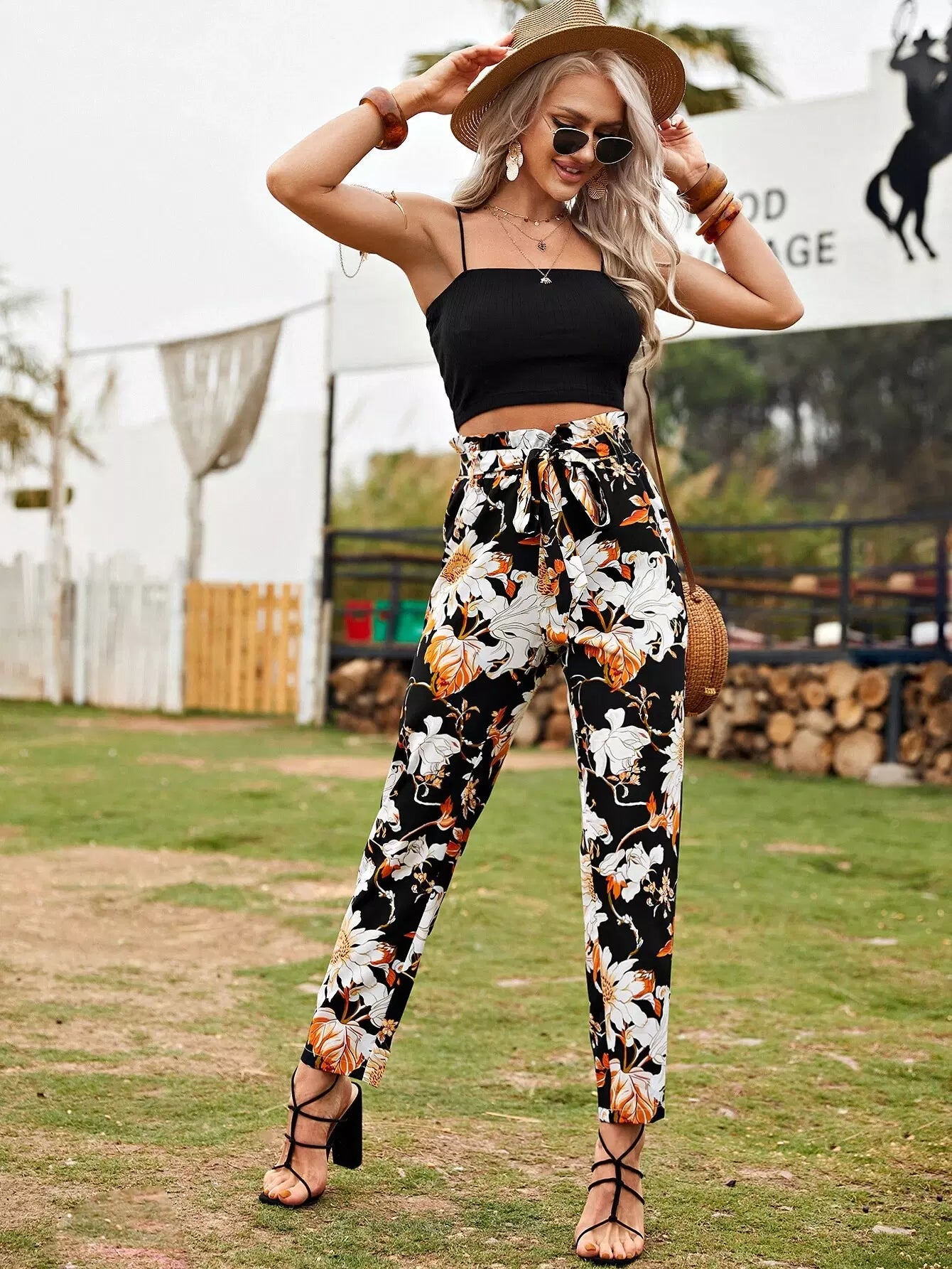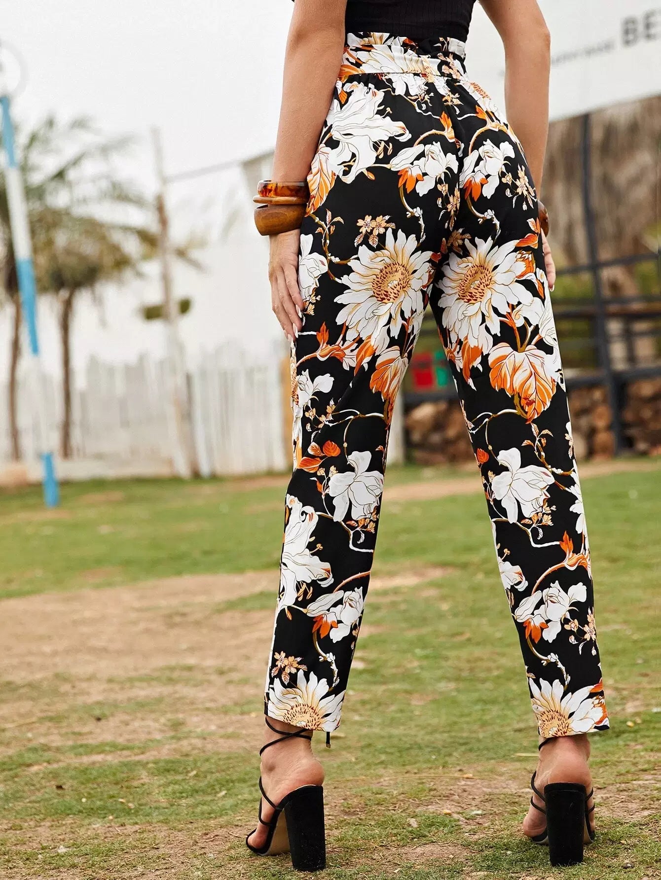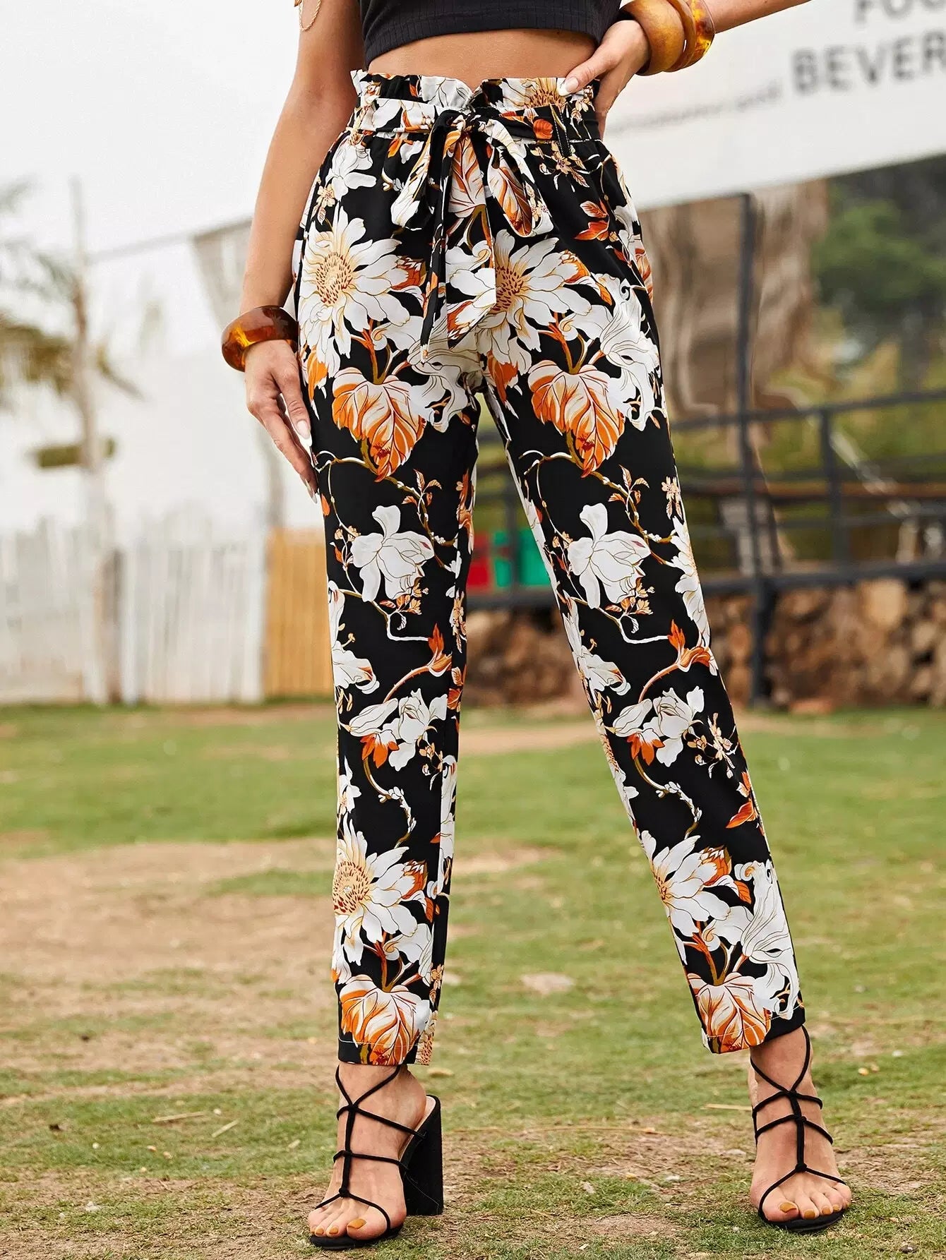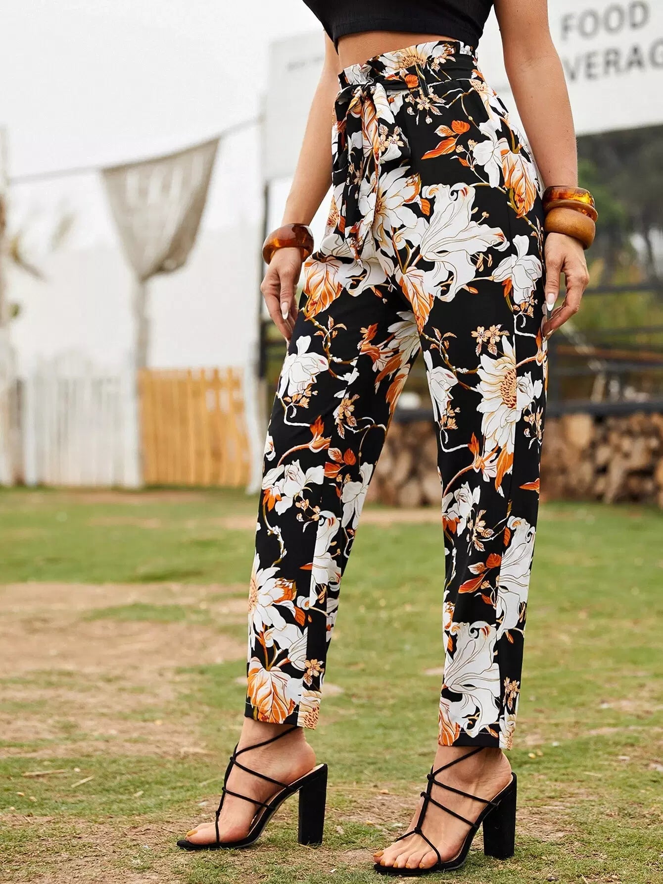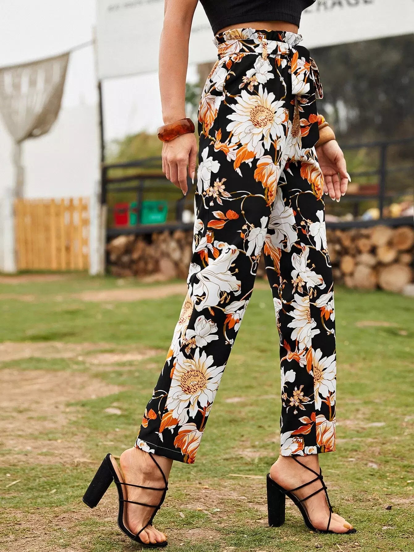 بنطال بطبعة زهور على الخصر من Paperbag بدون حزام