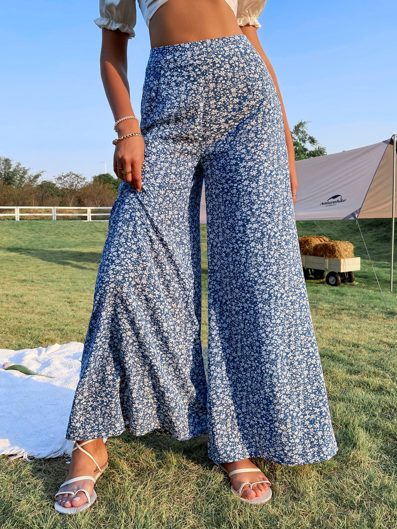 بنطلون سوليا الربيعي بطبعة زهور صغيرة، بخصر عالٍ وساقين واسعتين