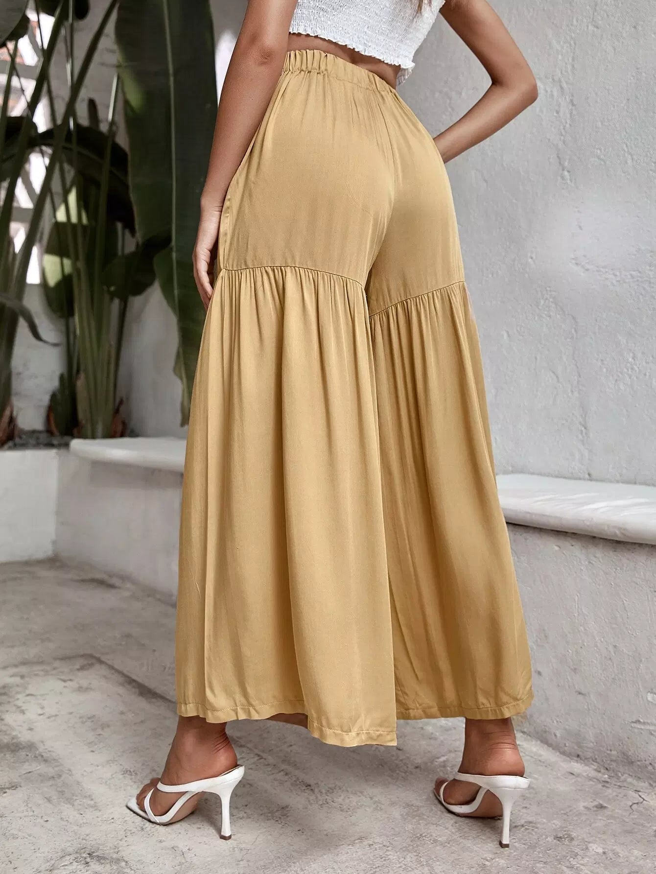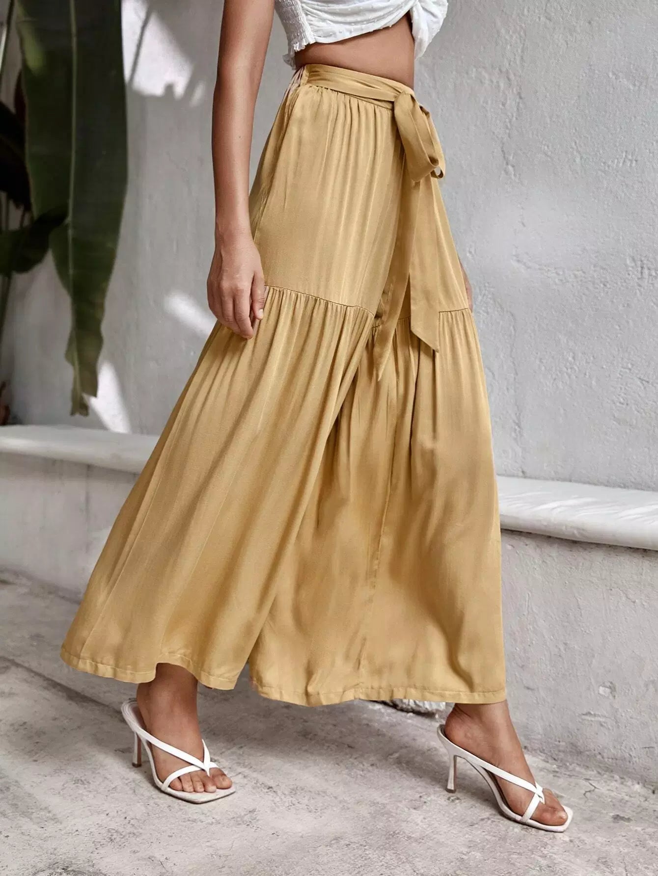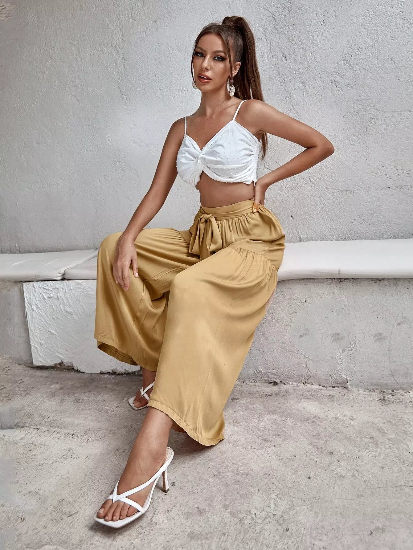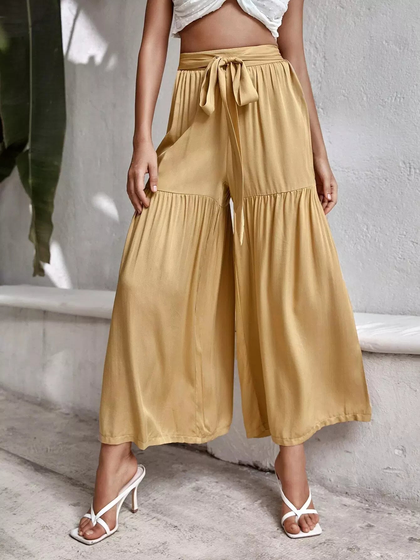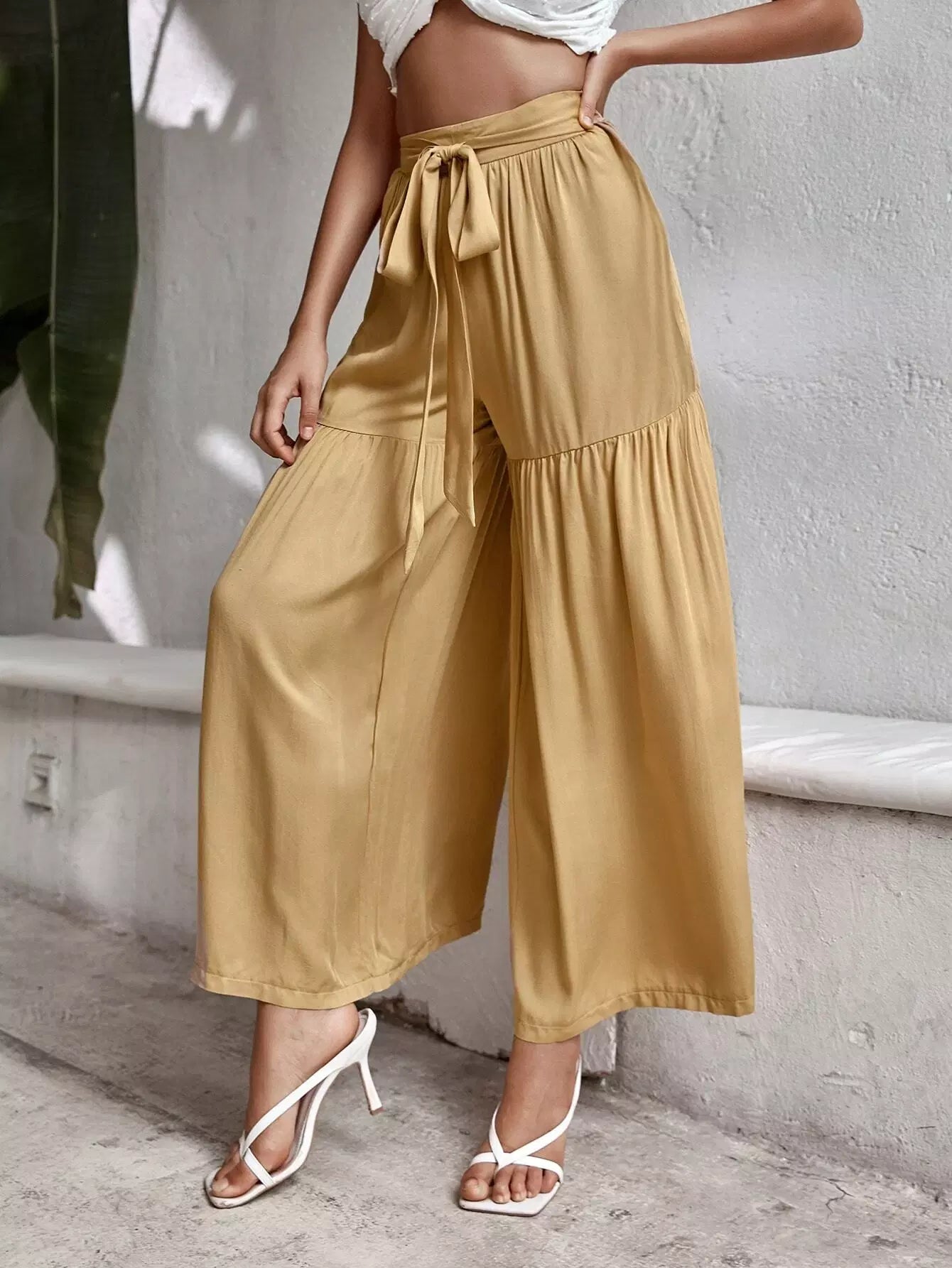 بنطال سادة برباط أمامي عريض الساقين بربطة عنق سادة