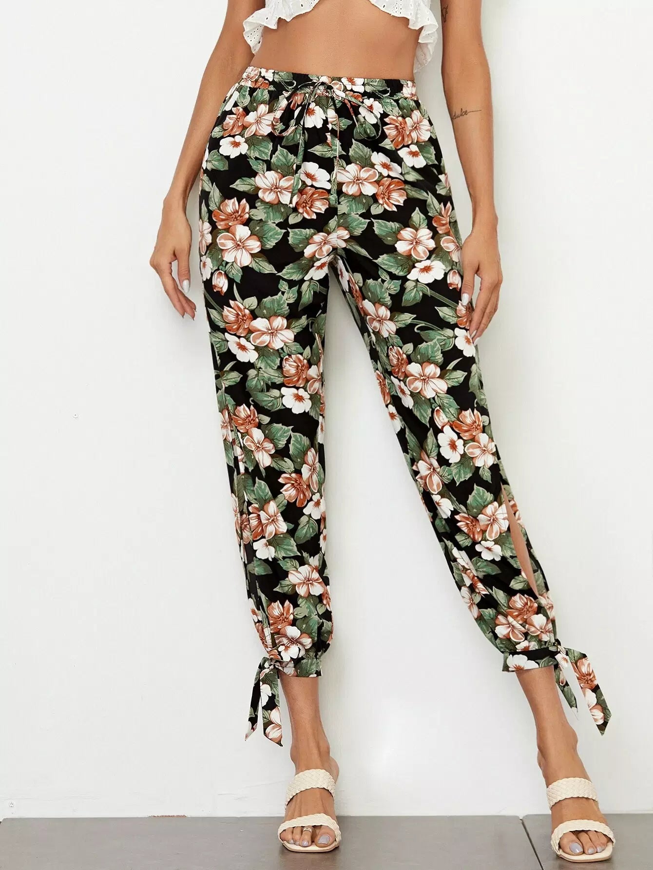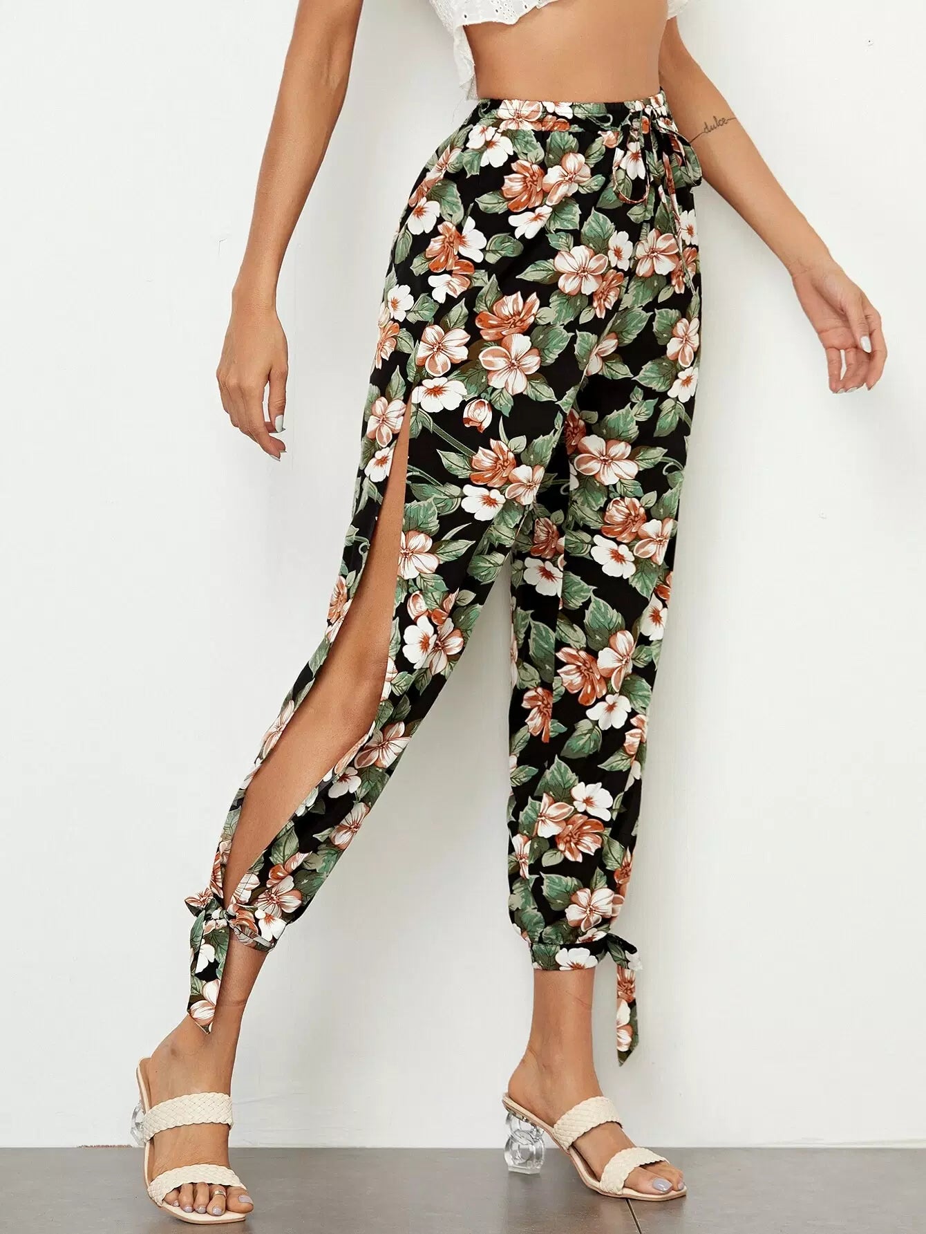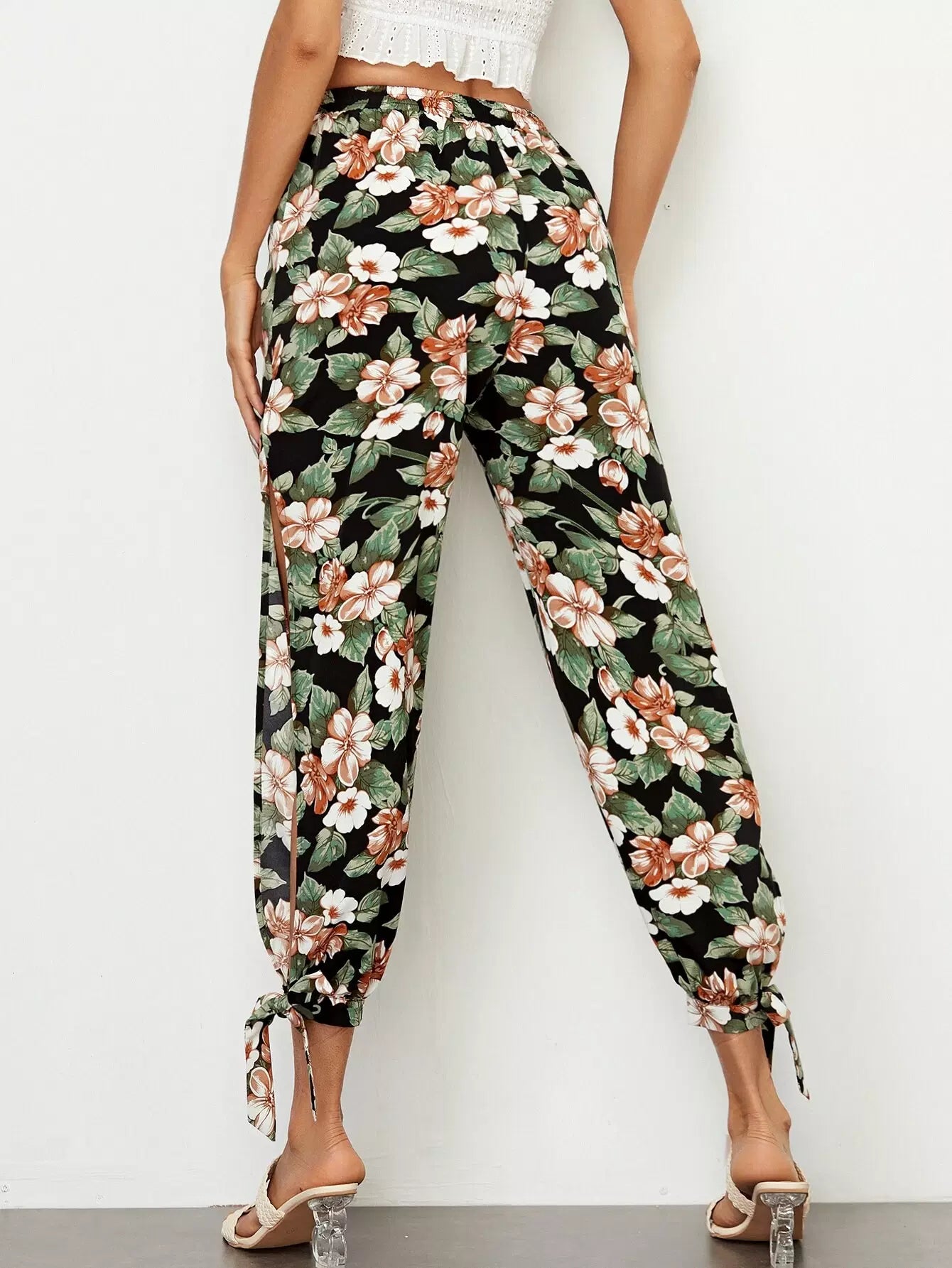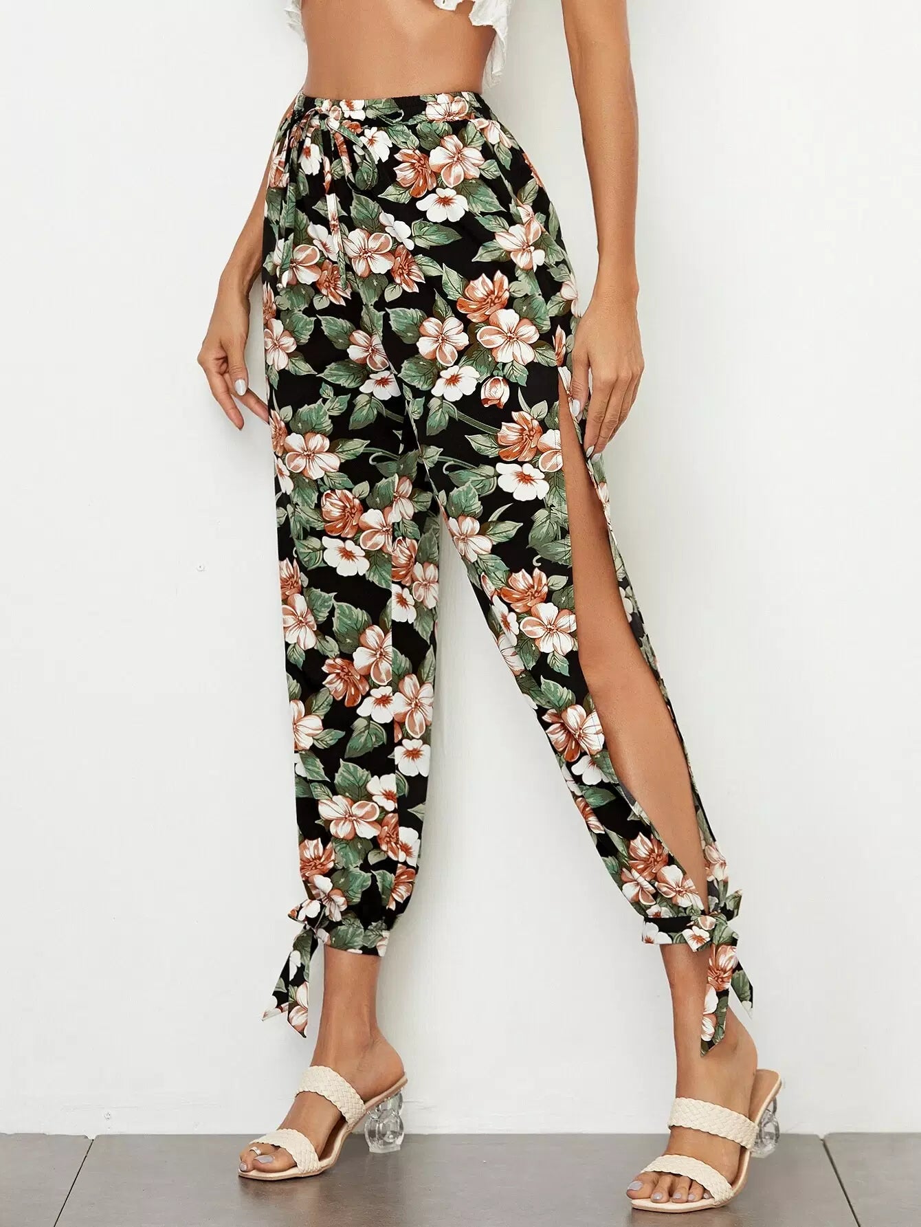 بنطلون بحاشية عقدة جانبية منقسمة على شكل زهور
