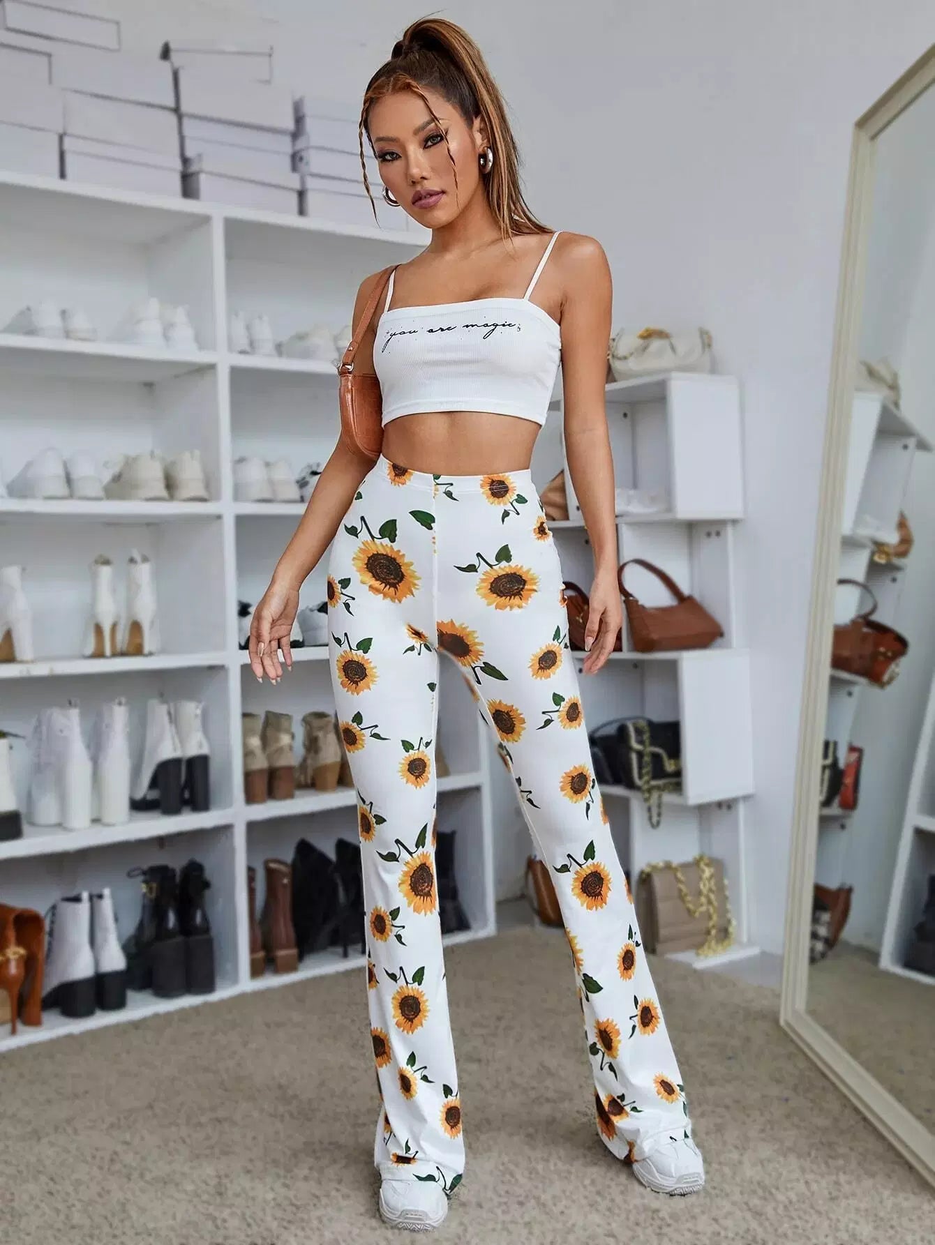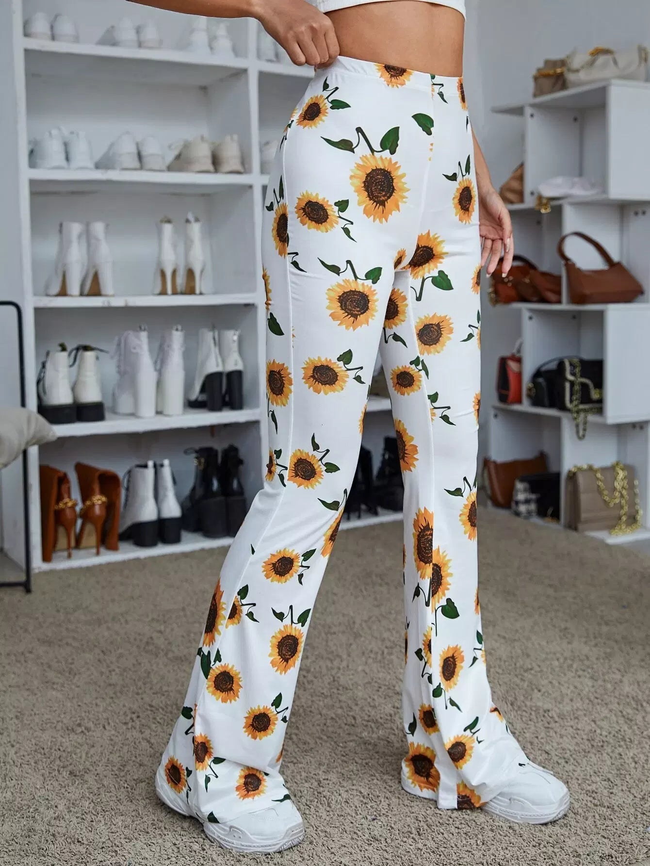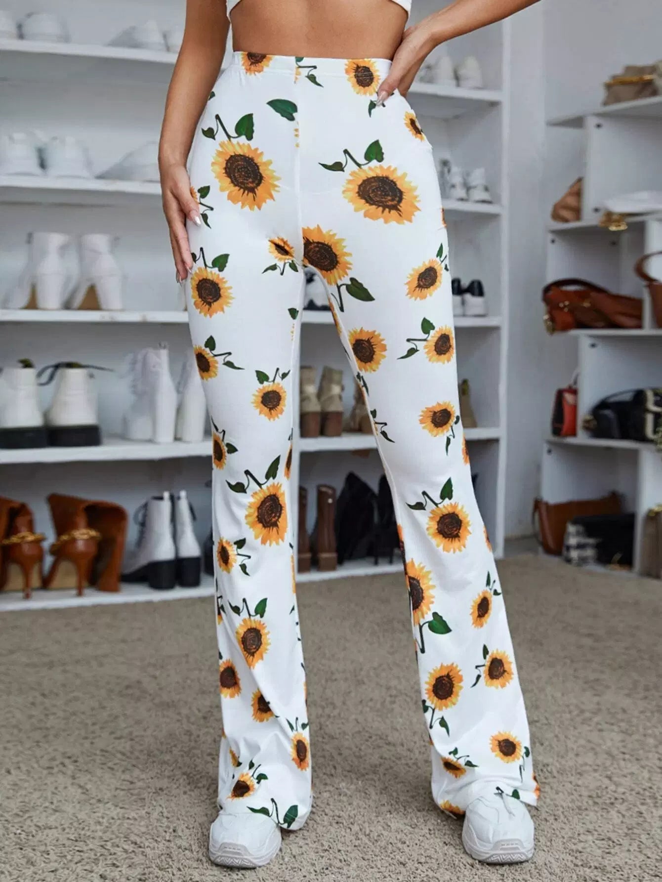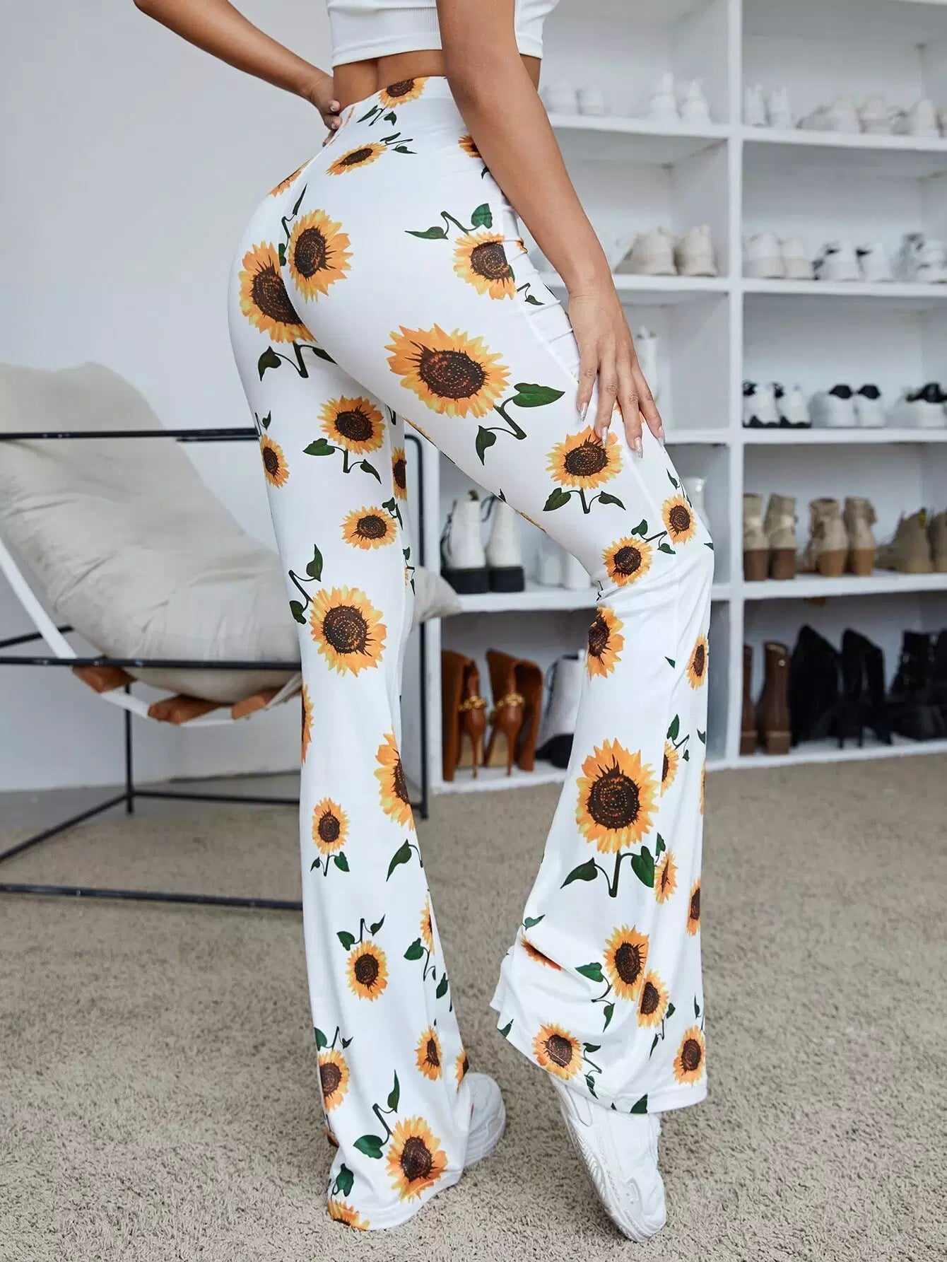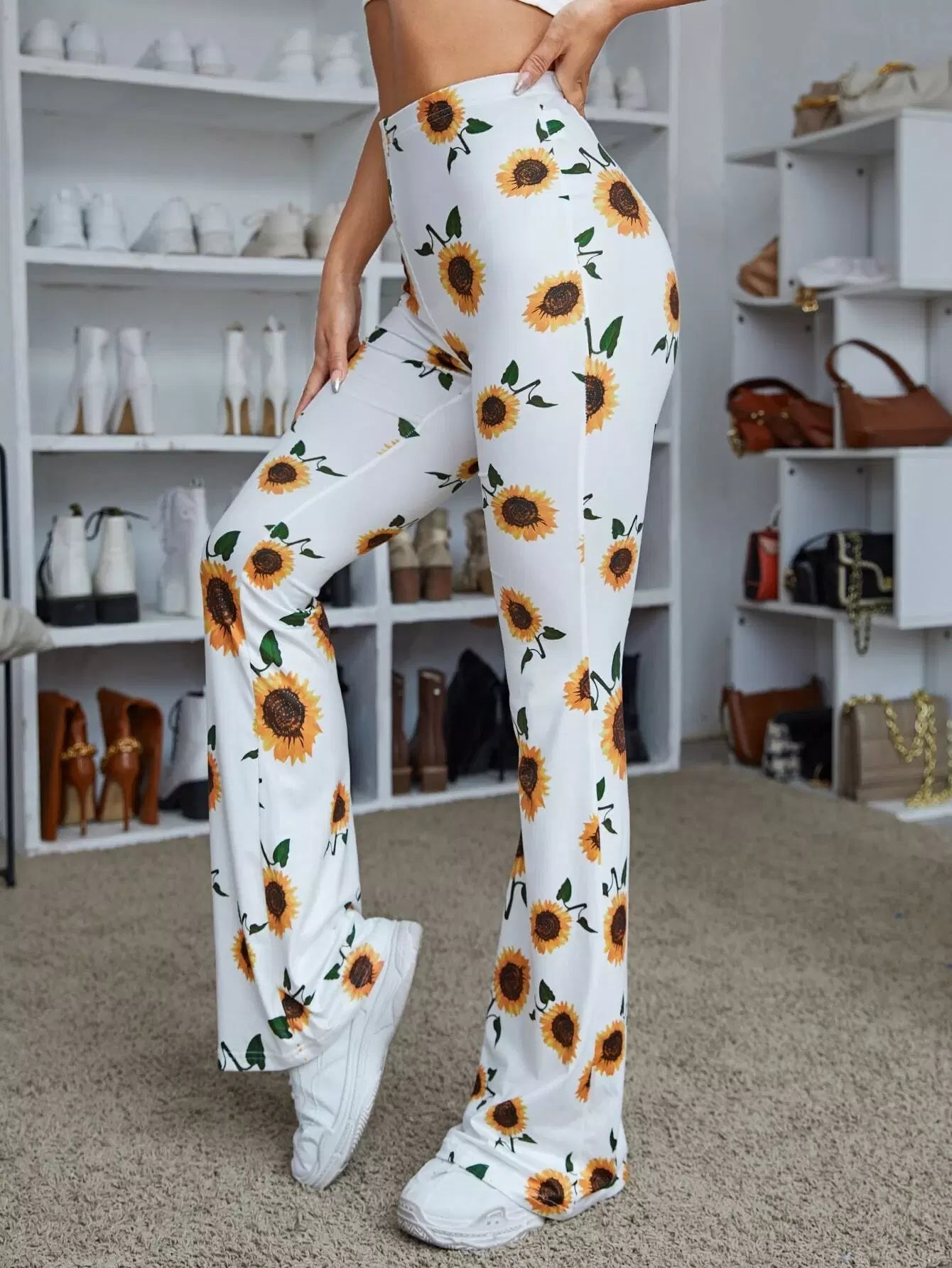 بنطلون بطبعة زهرة دوار الشمس بساق واسعة