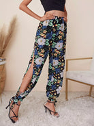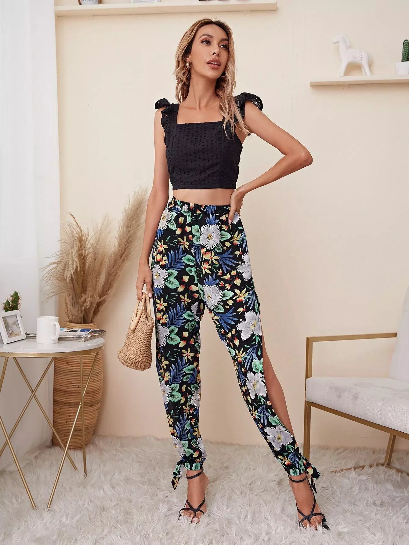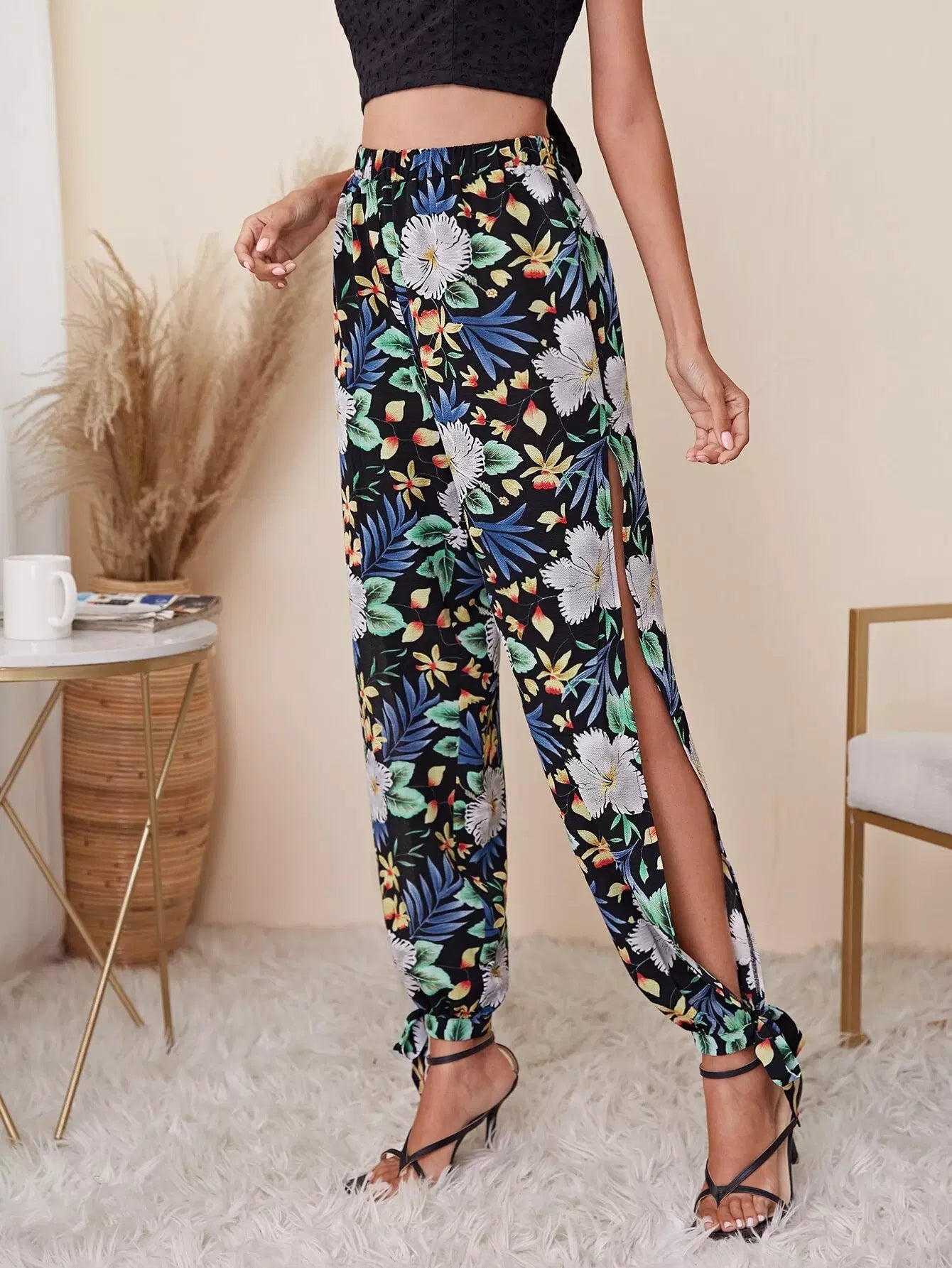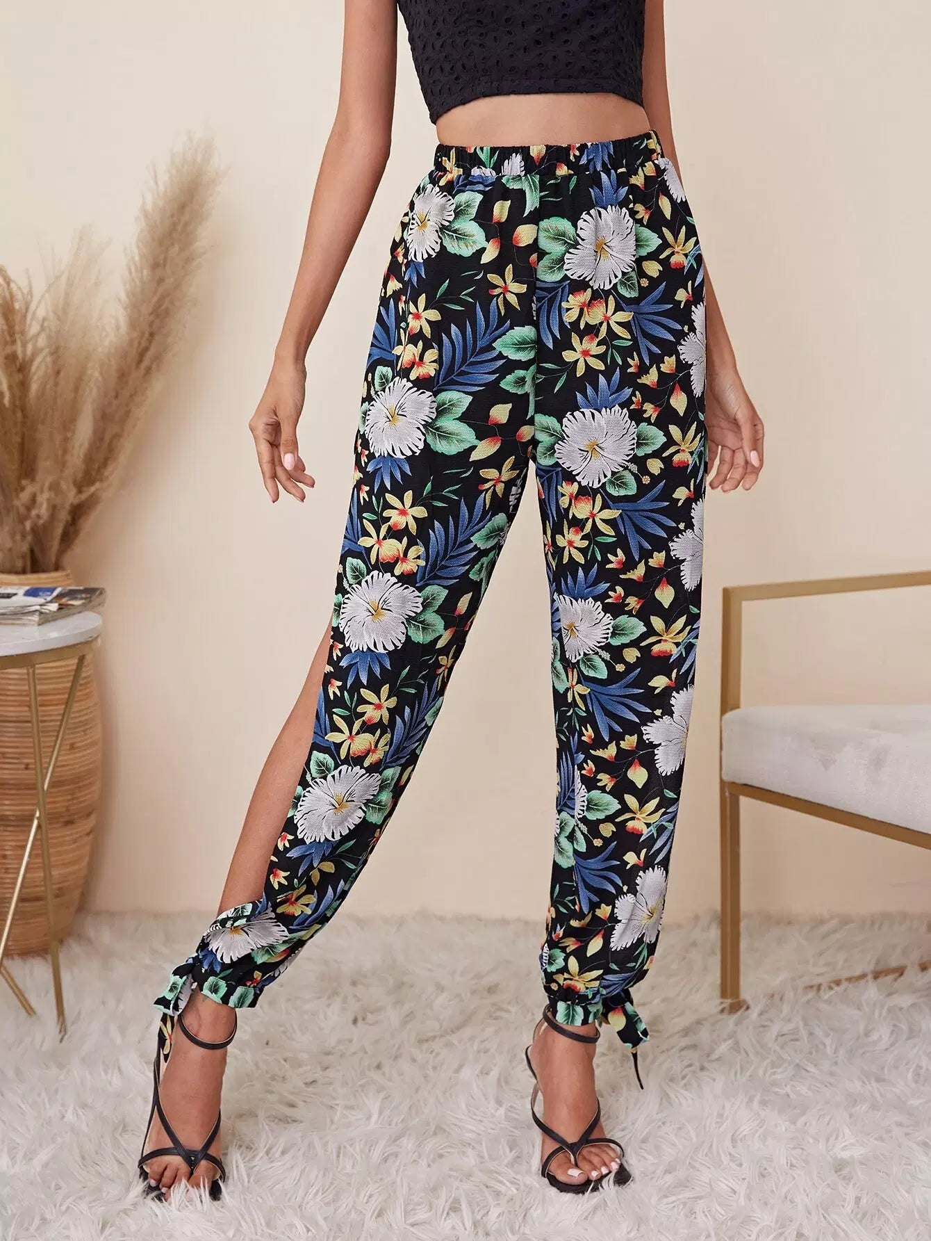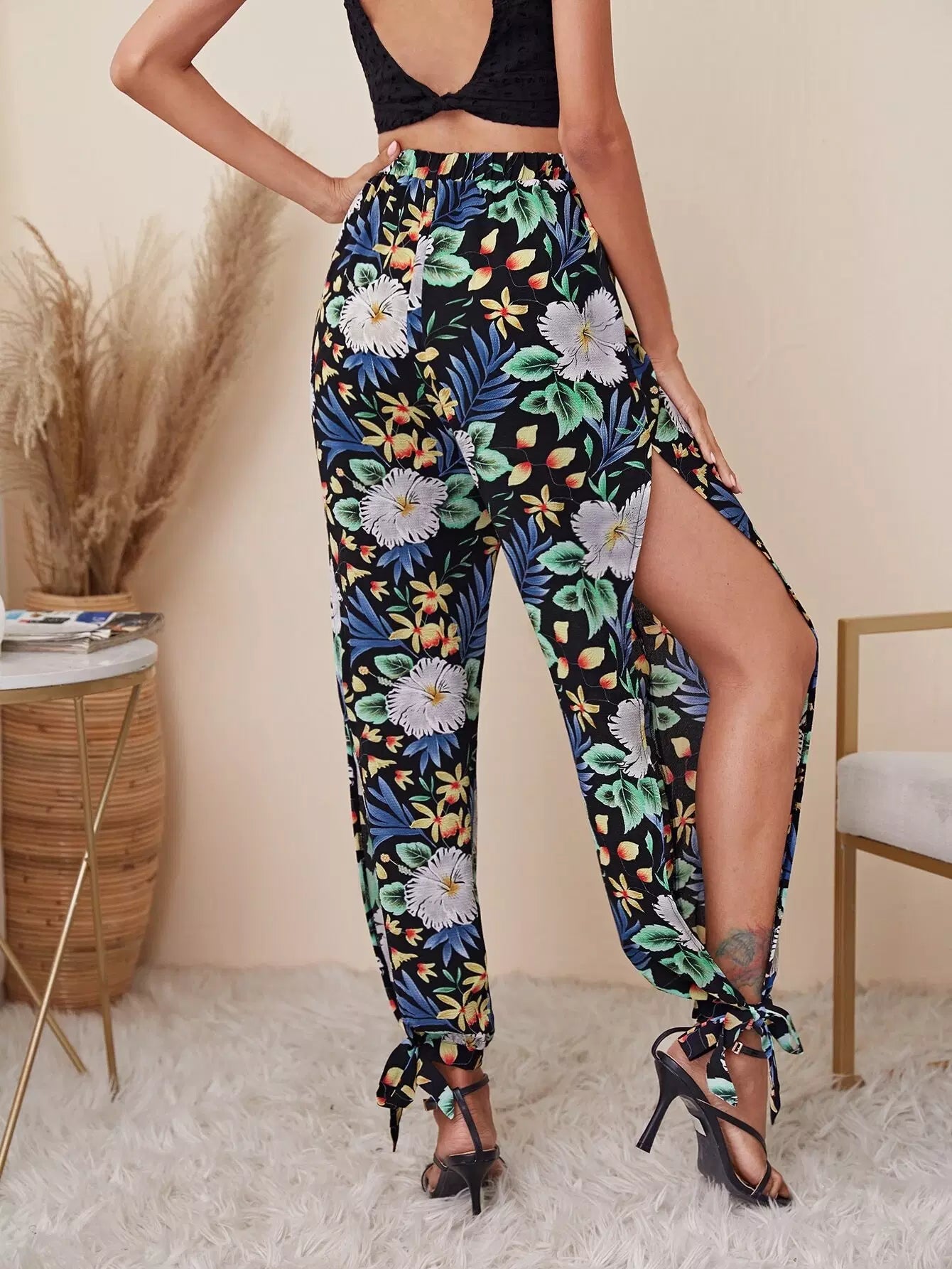 بنطلون بطبعة استوائية بطبعة استوائية بحاشية منقسمة بعقدة
