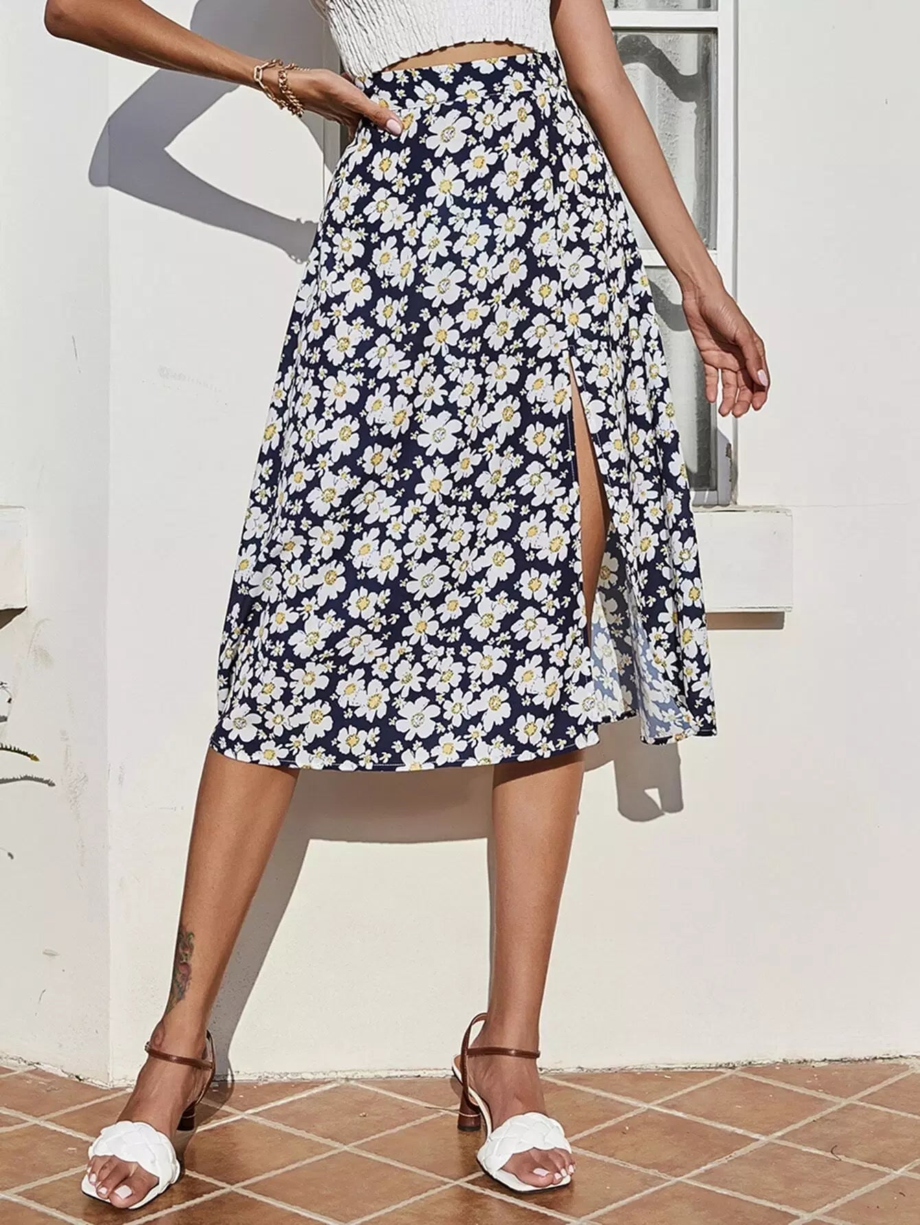 تنورة فخذ مشقوقة منقوشة بالورود بالكامل