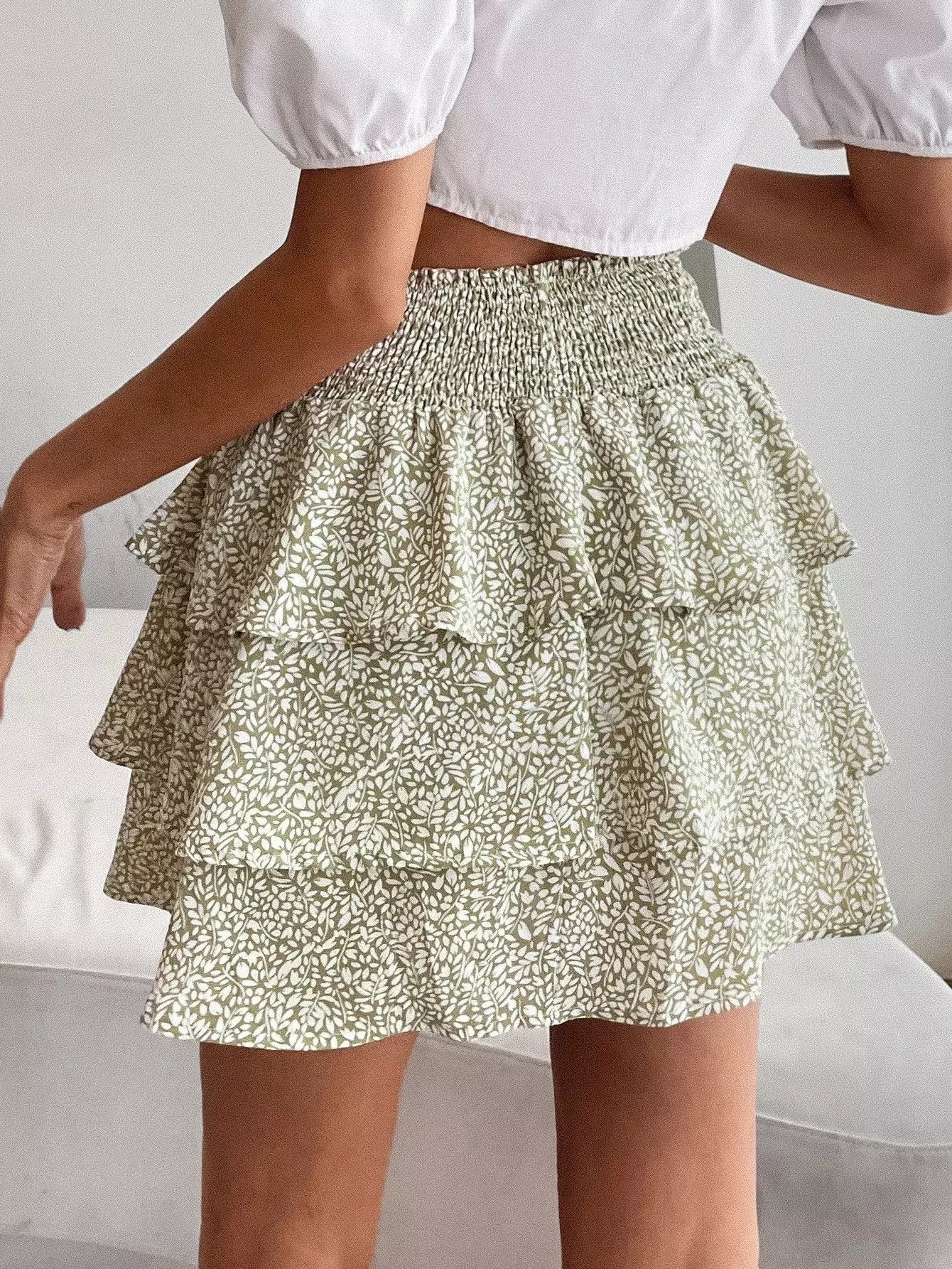 النساء - تنورة بطبقة خصر مكشكشة بطباعة نباتية بالكامل