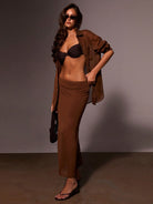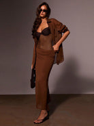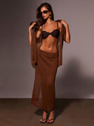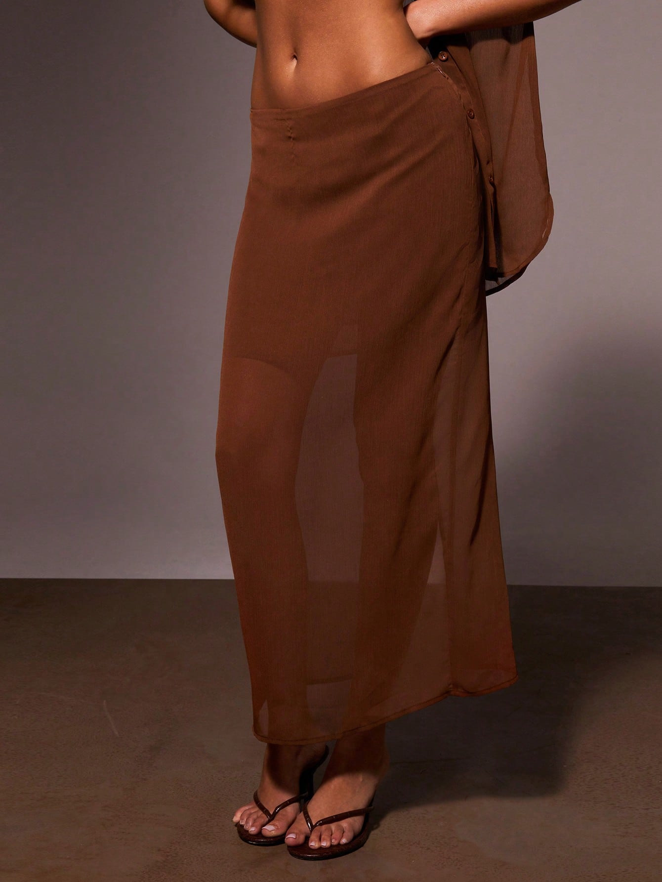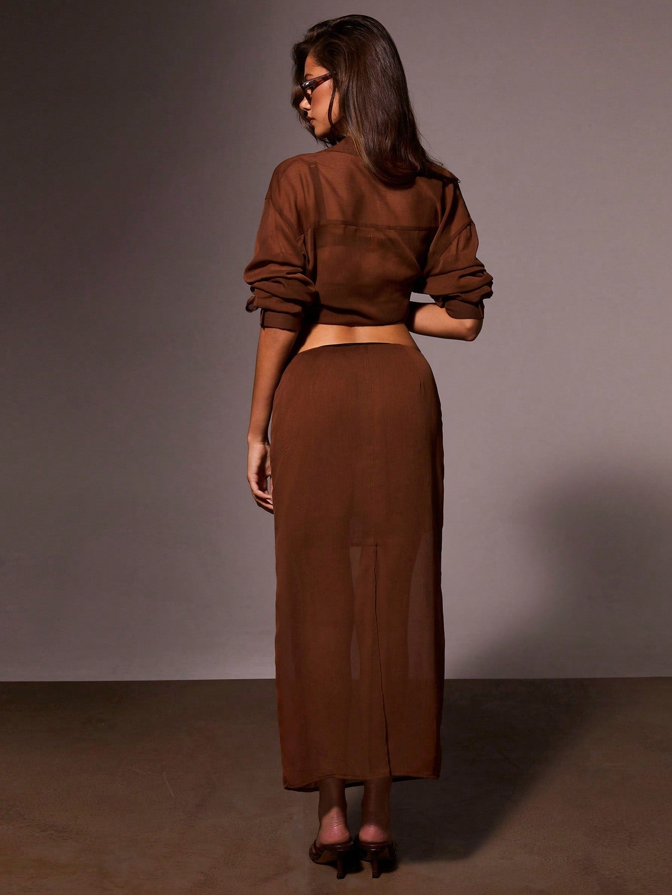 Athal Women's Elegant Coffee Brown Semi-Sheer Midi Skirt With Split Detail