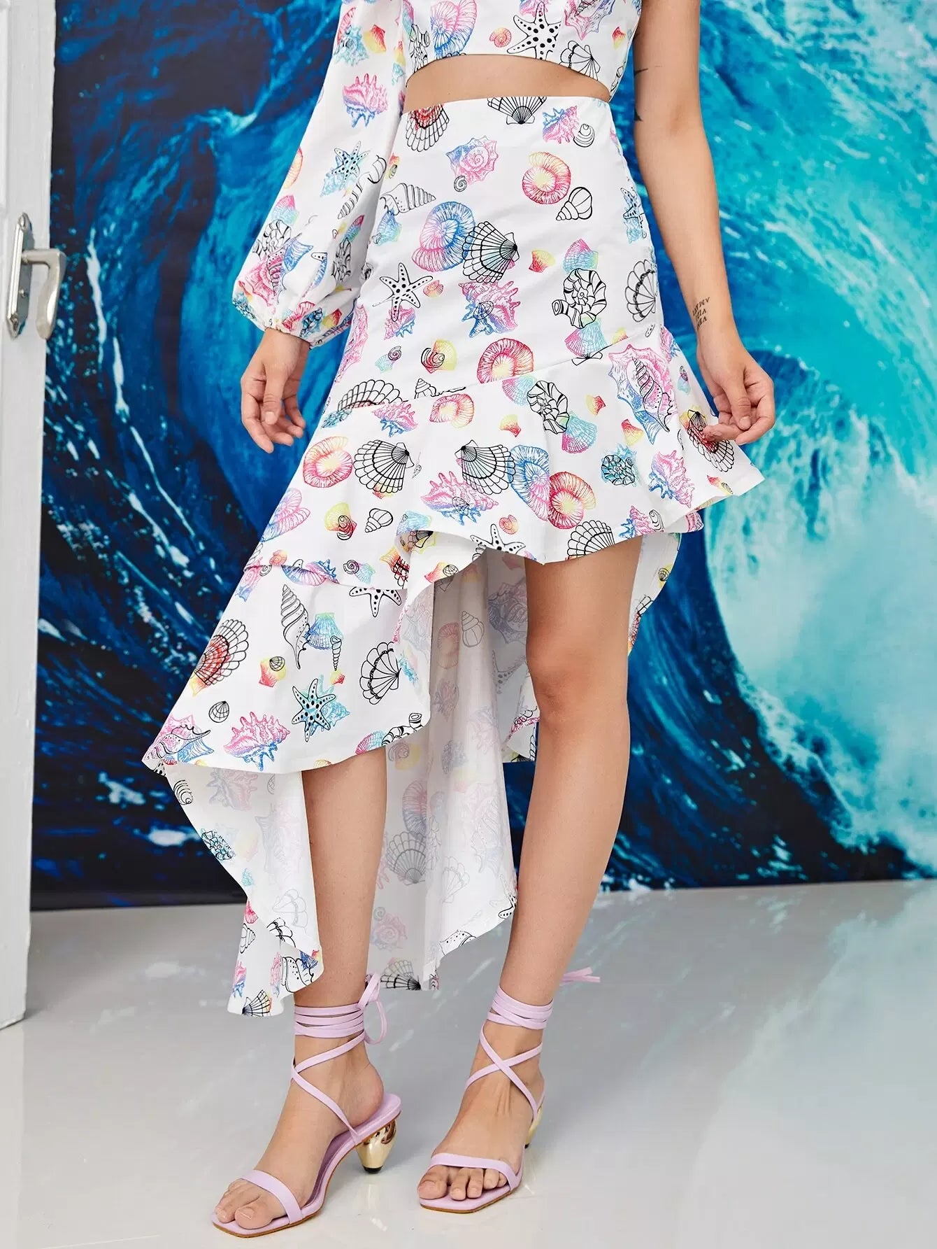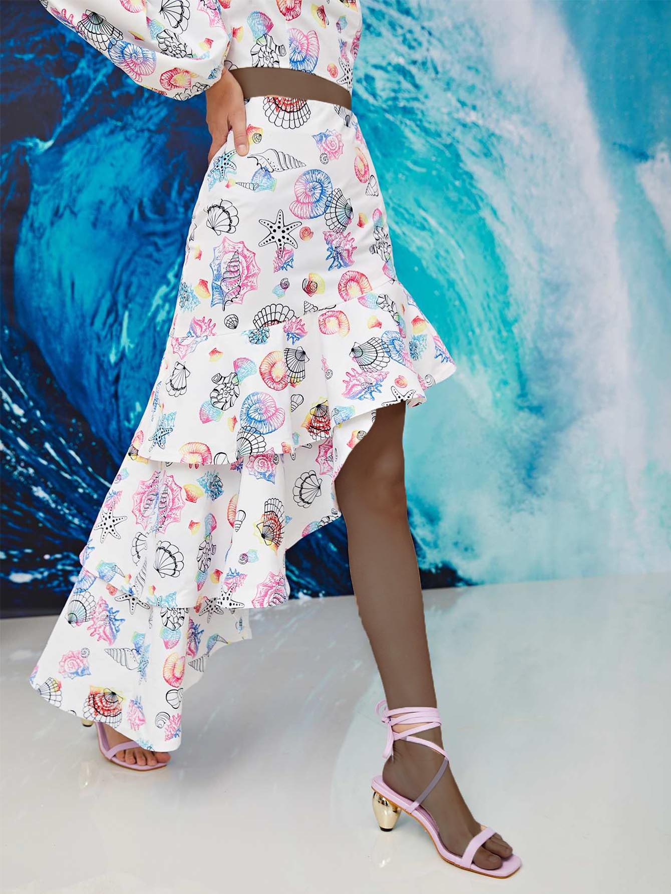 تنورة غير متناسقة بطبعة قوقع وصدف